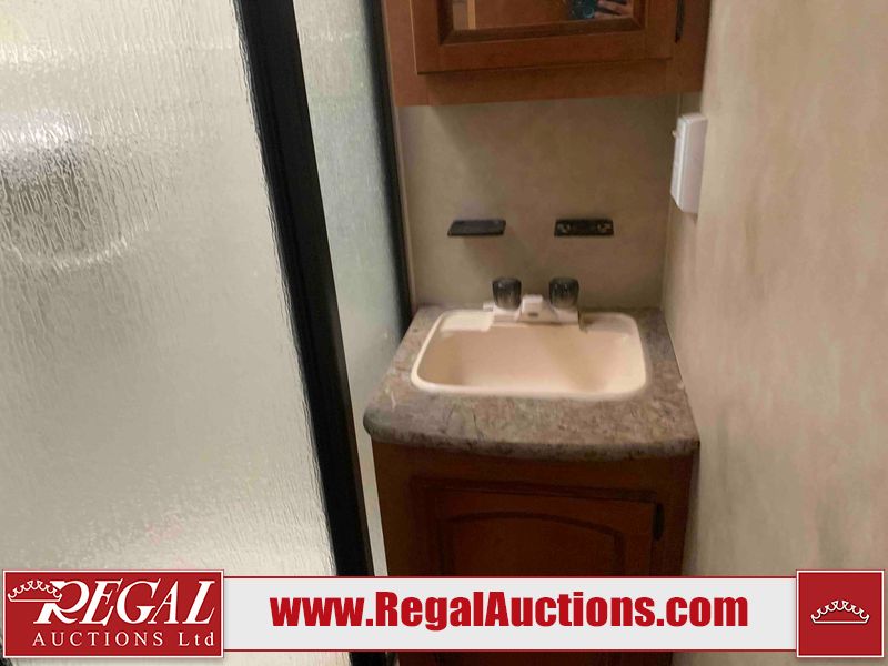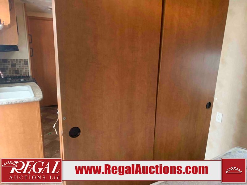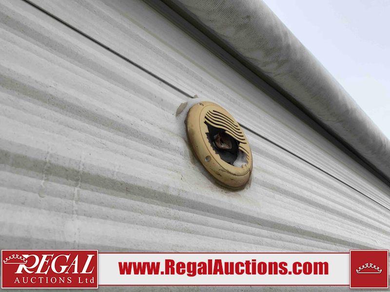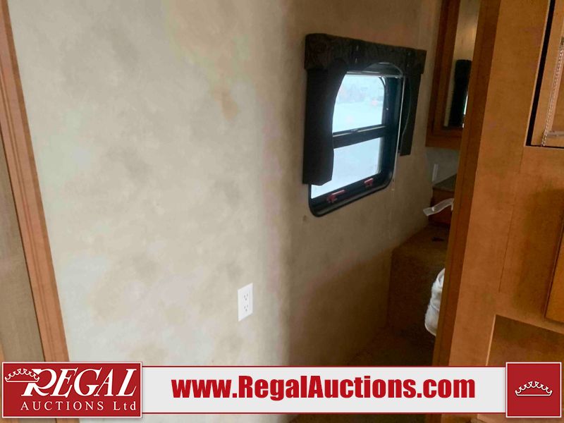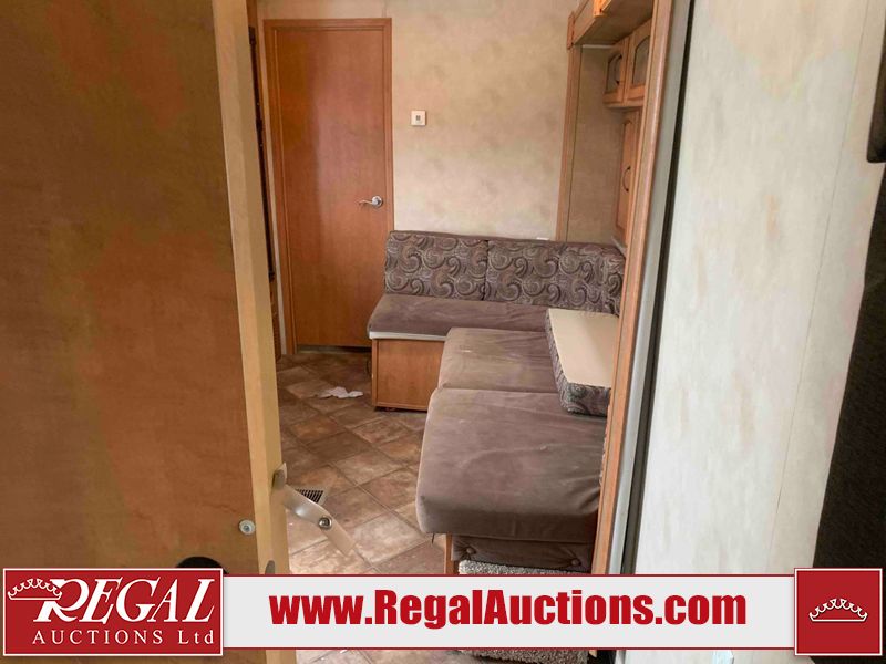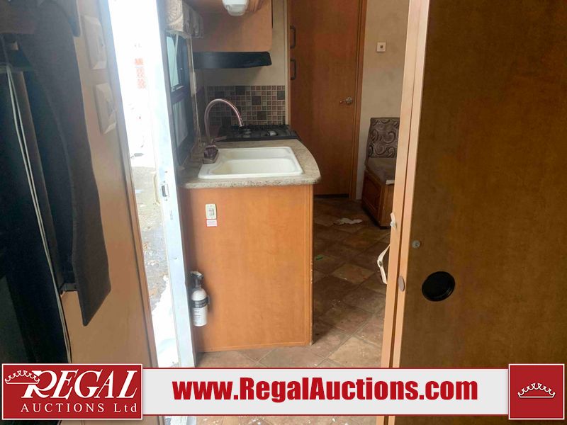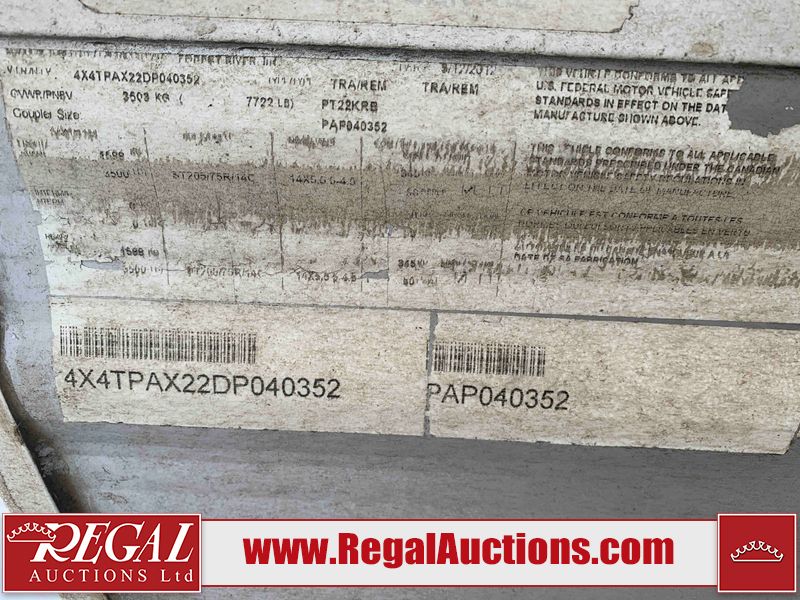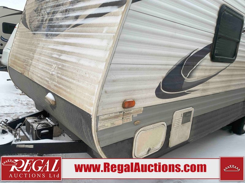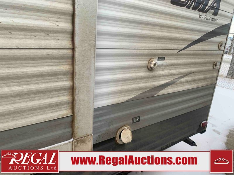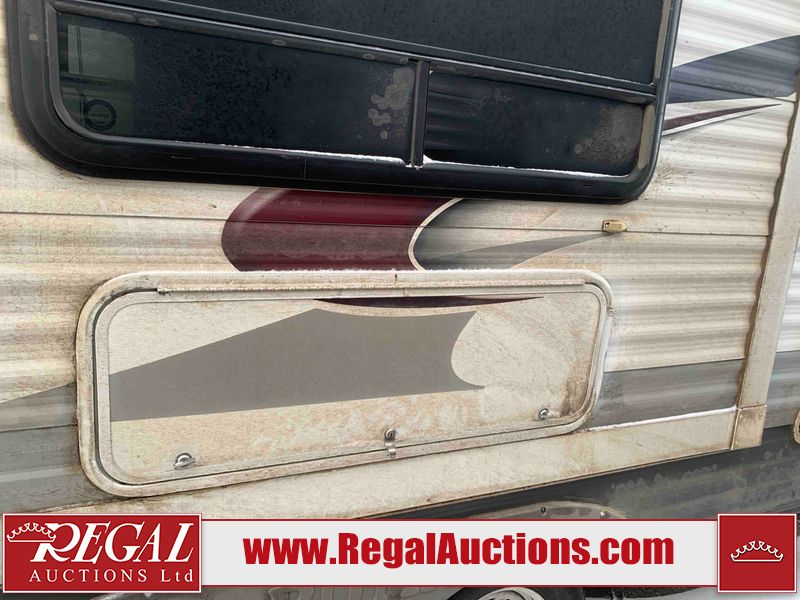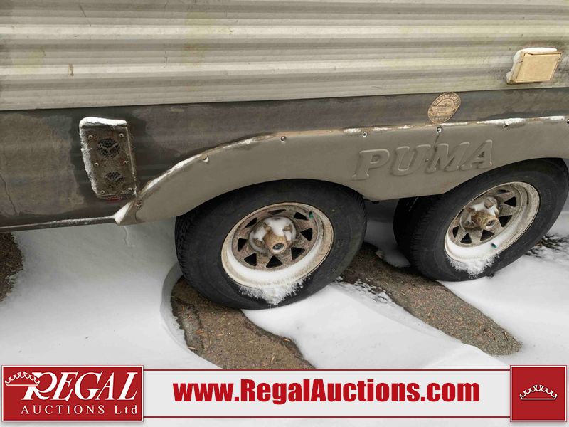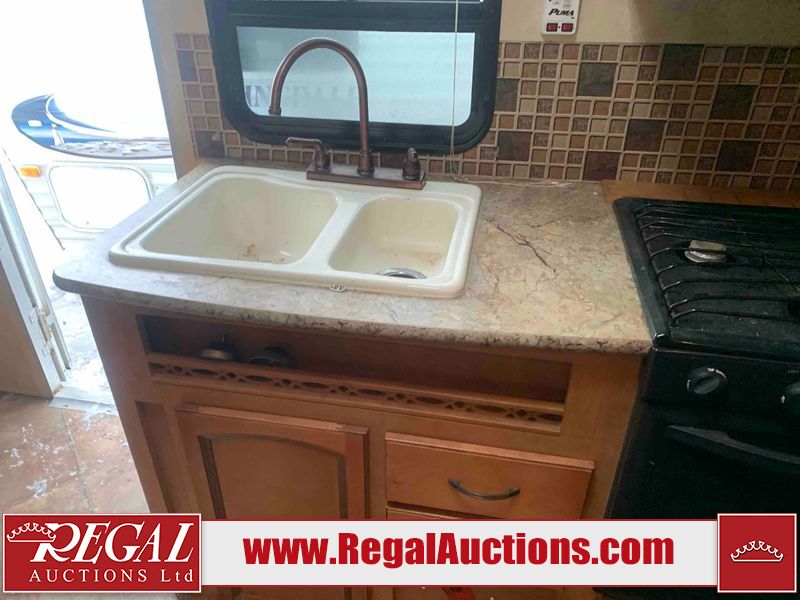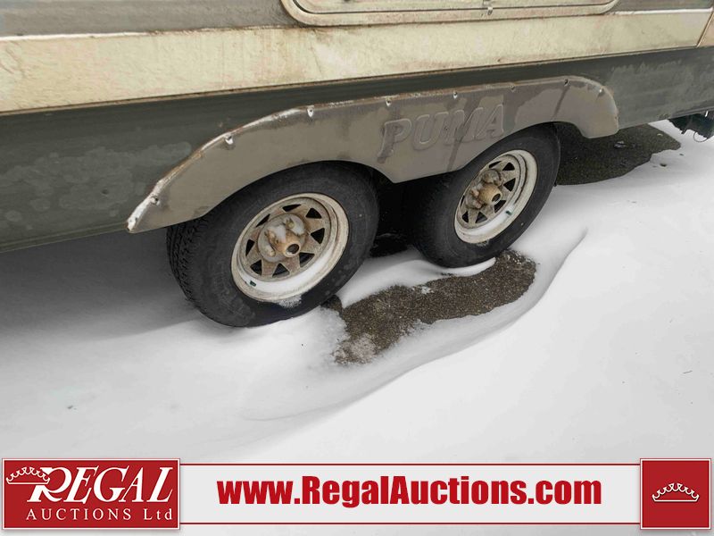 This RV is a 2013 Palomino puma 22KRB model Tandem axle bumper pull travel trailer. It has a single door entry, roof air, and a single slide out accommodating the living area. The interior is dirty. Some walls are showing scratches and scuffs. The mattress is worn. The carpet is stained. The living room skylight is cracked. The roof air conditioning cover is missing. The shower wall is cracked. The exterior walls are made of soft wall aluminum. All walls are showing scratches and scuffs. Some decals are peeling. Both the left and right fenders are cracked. This unit gets power with external power applied. The battery is dead. This unit is missing both propane tanks. The tires are mounted to steel rims and appear to be in good enough condition for use. This unit is equipped with a refrigerator, microwave, three burner stove top, oven, stereo system, and a exterior prep station. The layout consists of a master bedroom in the front, kitchenette/dinette in the middle, and a bathroom in the rear.
