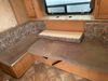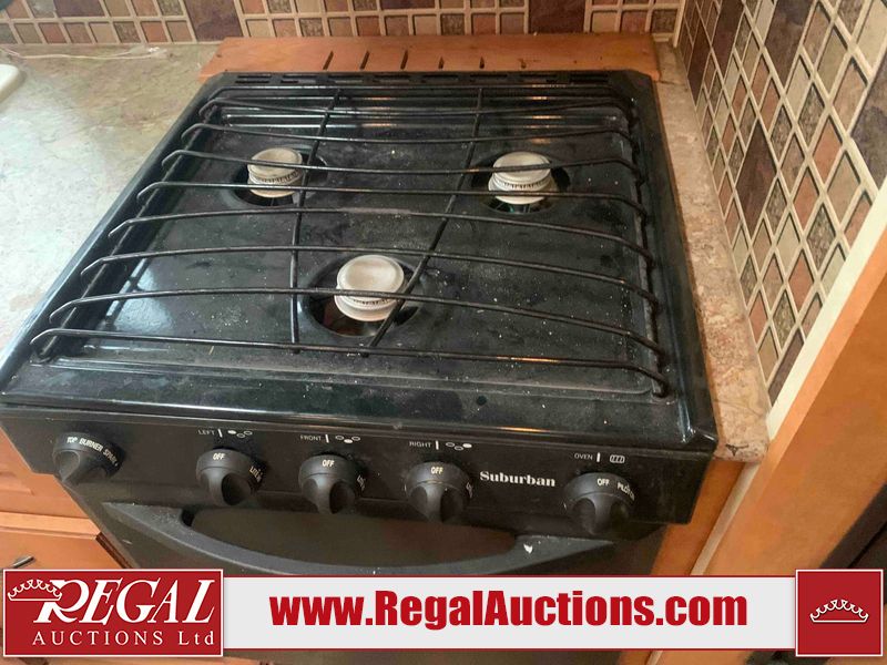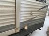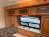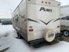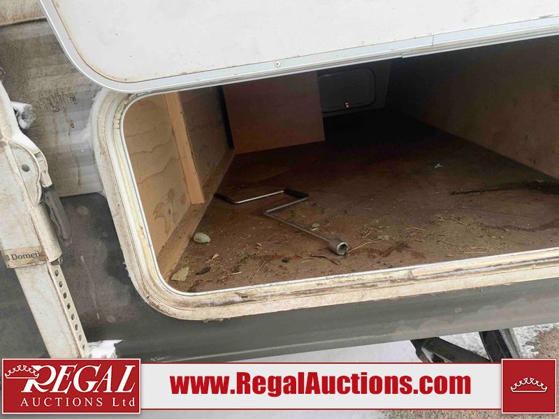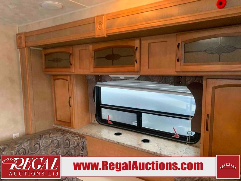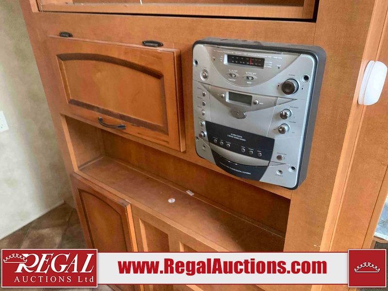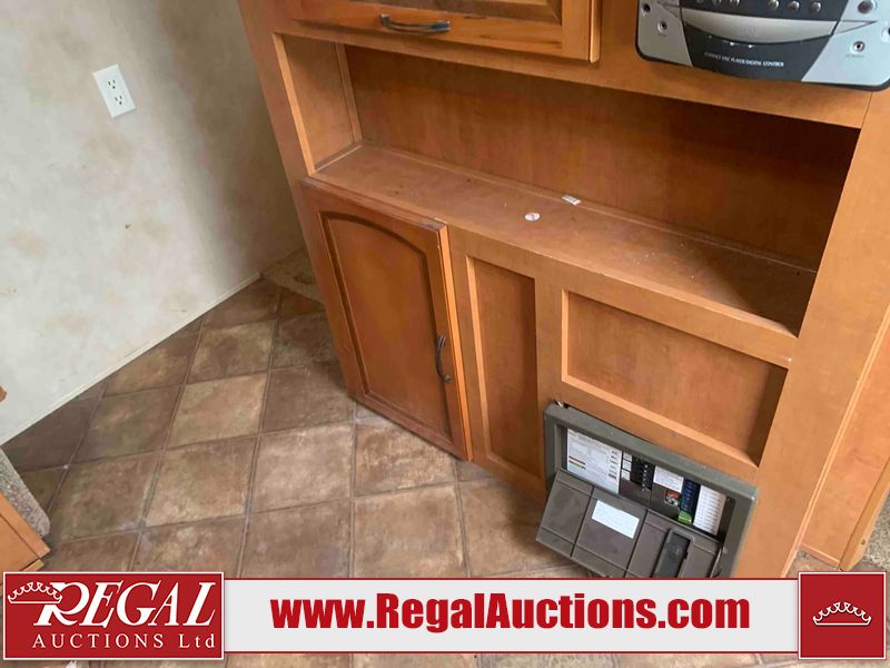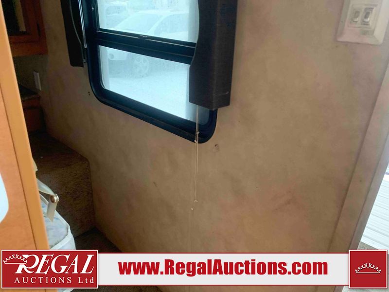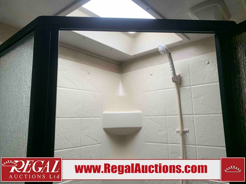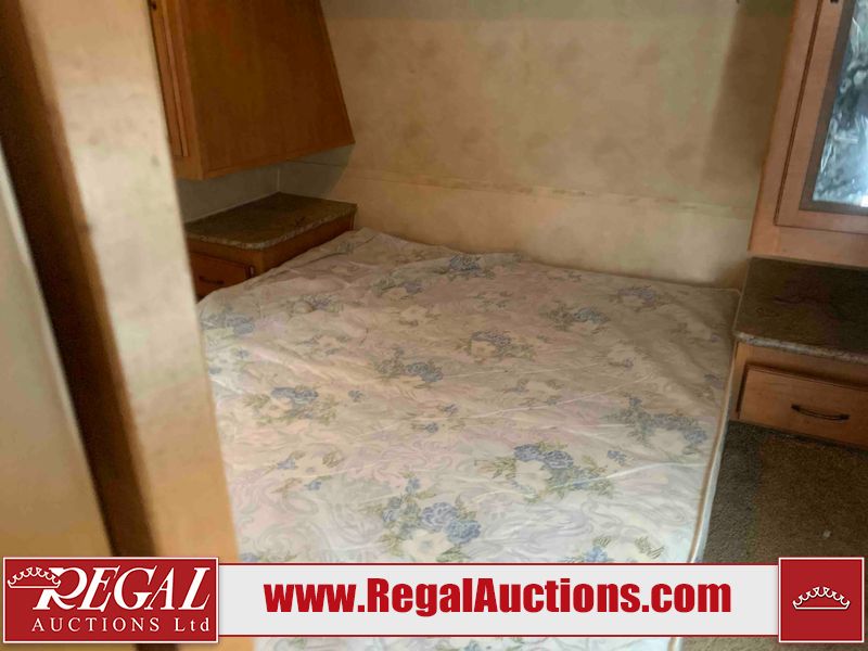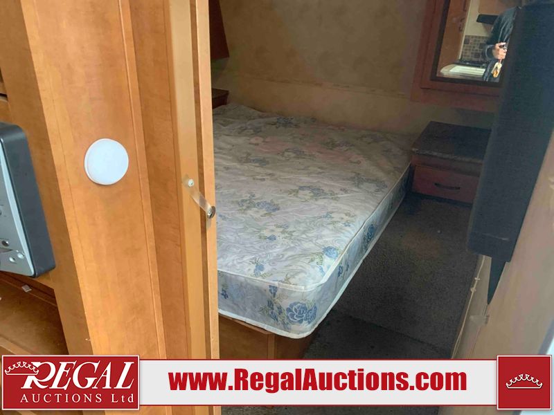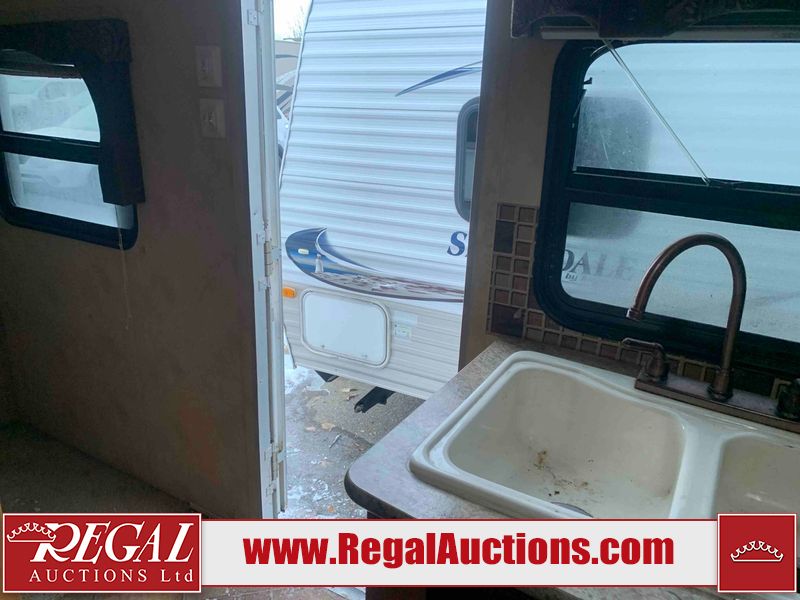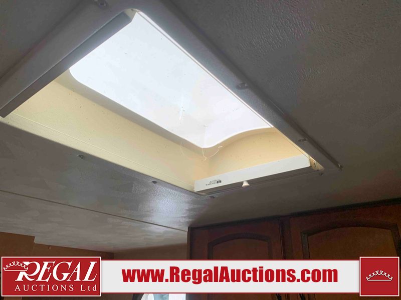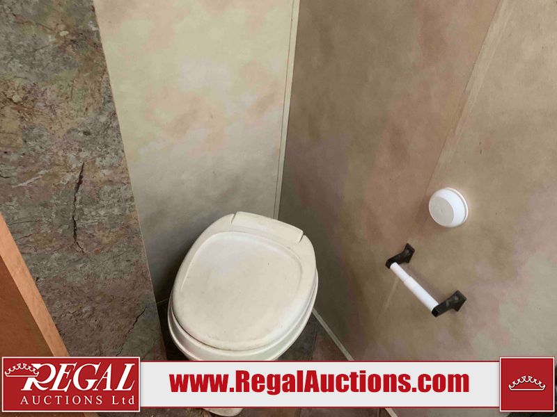 This RV is a 2013 Palomino puma 22KRB model Tandem axle bumper pull travel trailer. It has a single door entry, roof air, and a single slide out accommodating the living area. The interior is dirty. Some walls are showing scratches and scuffs. The mattress is worn. The carpet is stained. The living room skylight is cracked. The roof air conditioning cover is missing. The shower wall is cracked. The exterior walls are made of soft wall aluminum. All walls are showing scratches and scuffs. Some decals are peeling. Both the left and right fenders are cracked. This unit gets power with external power applied. The battery is dead. This unit is missing both propane tanks. The tires are mounted to steel rims and appear to be in good enough condition for use. This unit is equipped with a refrigerator, microwave, three burner stove top, oven, stereo system, and a exterior prep station. The layout consists of a master bedroom in the front, kitchenette/dinette in the middle, and a bathroom in the rear.