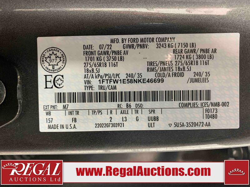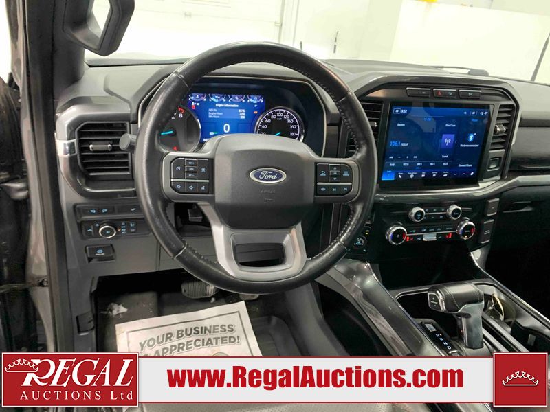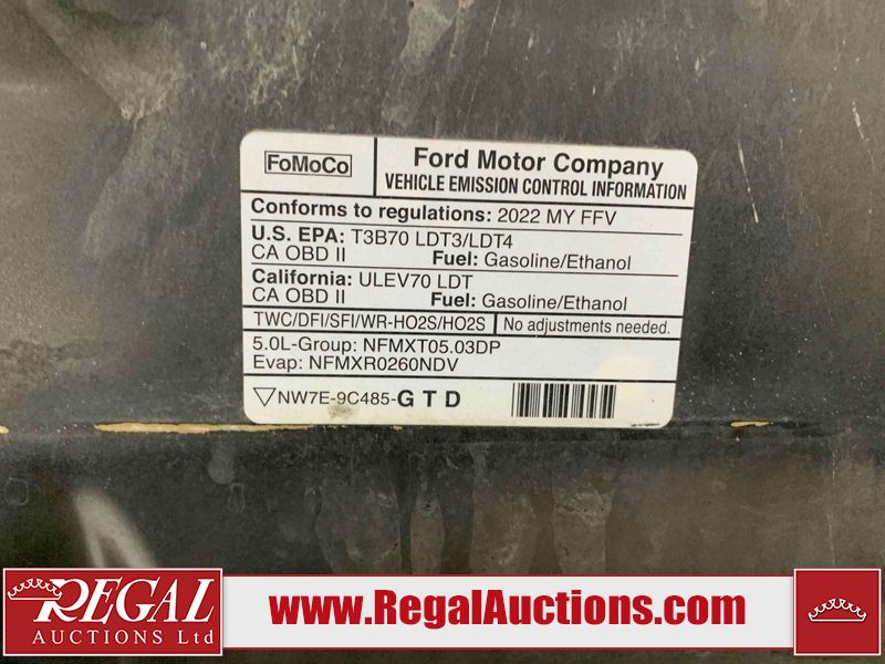 This 2022 FORD F-150 XLT CREW CAB PICKUP is powered by a 5.0L V8 gasoline engine and an automatic transmission. It is equipped with four-wheel drive. The truck has seats for 5 people. The truck has high mileage for its age. The vehicle has high-value options including leather upholstery, power seats, heated seats, navigation, and a backup camera. The body looks to be in good condition overall. There are minor chips on the front bumper, hood, left front fender, left front door, left rear fender, right rear fender, and right front fender. There are scratches on the rear bumper. There are very minor chips in some areas around the body. There are very minor scratches in many areas around the body. The interior looks to be in good condition overall. The windshield looks to be in good condition. All of the tires have lots of tread remaining. This truck is being sold by the fleet department of a corporation or government body. The vehicle will be sold with the following declarations: Fleet Vehicle (See Footnote 1). Footnotes: 1) This vehicle is a commercially owned work vehicle. Regal Auctions Ltd. makes no guarantee or warranty, either express or implied, with respect to the data provided in this report. The information has been provided from the consignor and from sources generally believed to be reliable, however the accuracy of this information cannot be guaranteed by Regal Auctions.