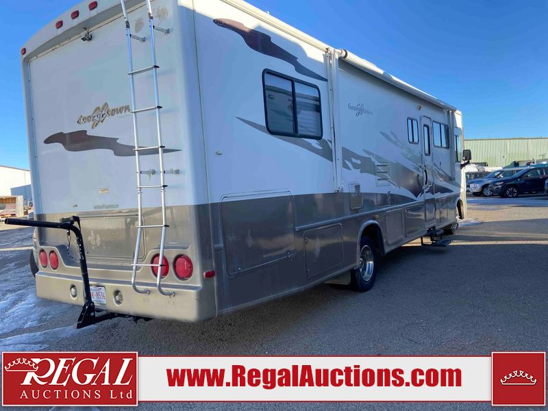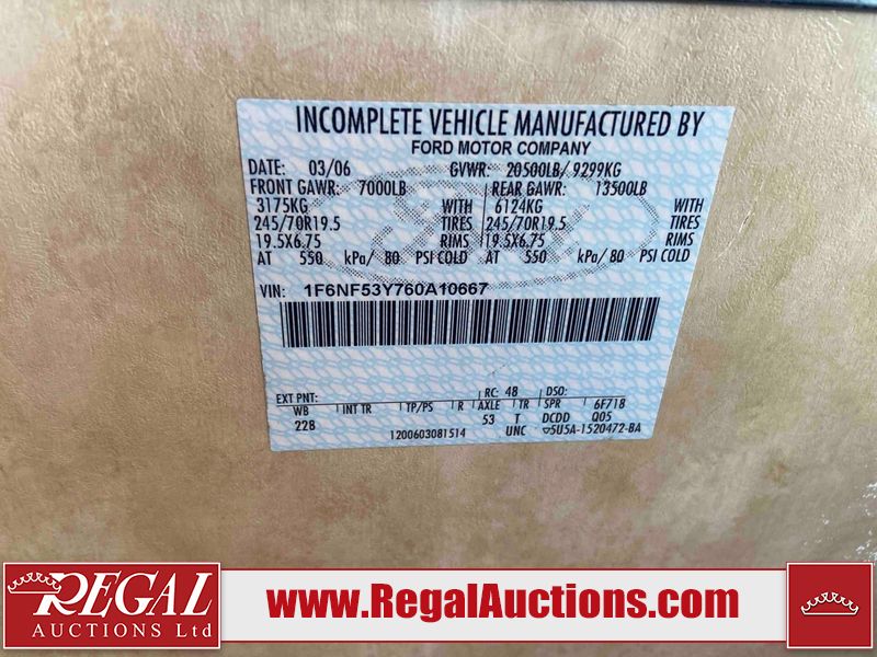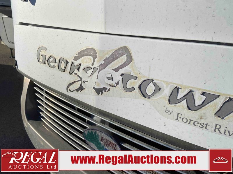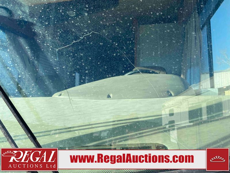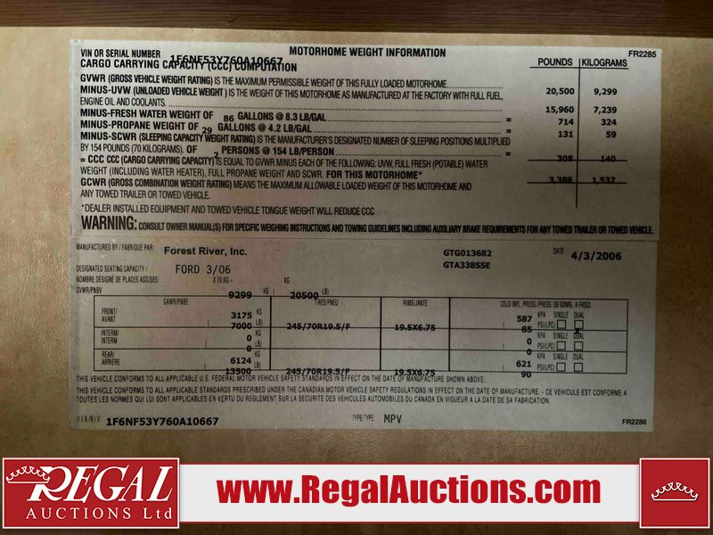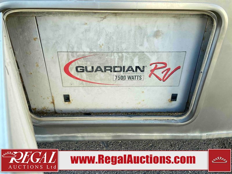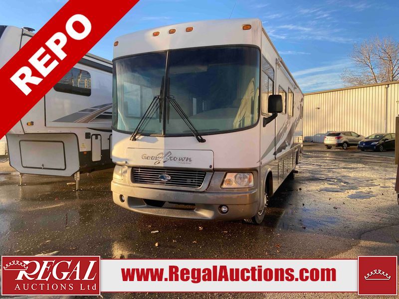 This motorhome is a 2006 Forest river Georgetown 338 model on a Ford chassis. It has a single door entry, roof, air, and a single slide out accommodating the living area. The odometer 74996 miles. Interiors dirty. The entry door cover is cracked. Some walls are showing scratches and scuffs. Some walls have drill holes. The dinette, bathroom, and bedroom air vent trims are cracked. The shower wall is cracked and separating. The bed is worn and stained. The Exterior walls are made of hard wall fiberglass. All walls are showing scratches and scuffs. The front bumper has peeling paint. The windshield is cracked. Both The left and right rear wall weatherstripping is peeling. The rear bumper is cracked, has peeling paint, and has been repainted. The rear wall has been poorly resealed. The right wall is showing water delamination. The entry steps has peeling paint. The slide out cannot be tested. The chassis batteries are dead and do not get power with external power applied. This unit starts and runs with a boost. The exhaust is noisy. This unit is powered by a 6.8L triton 10 cylinder gasoline, Ford engine and an automatic transmission. There is no emissions sticker. This unit is equipped with a guardian by generic power systems 7500 Watts generator. The generator shows 117 hours. The generator cannot be tested. diagnostics will need to be performed to determine its exact issues. The tires are mounted to alloy rims, the rear tires will need to be replaced. This unit is equipped with a microwave, three burner, stove, top, oven, refrigerator, television, and a stereo system. The layout consist of a living area in the front, kitchenette/dinette in the center, and a bathroom/master bedroom in the rear.