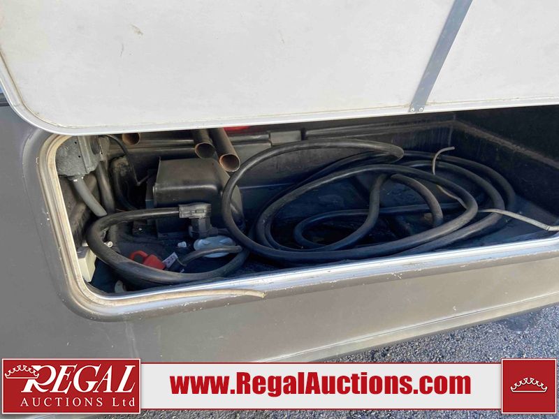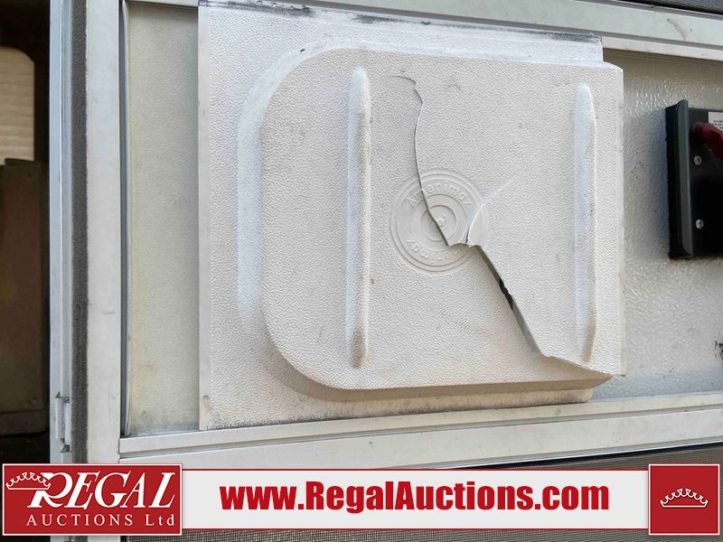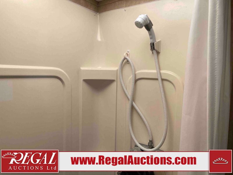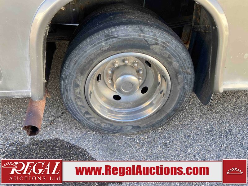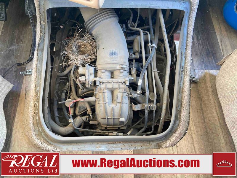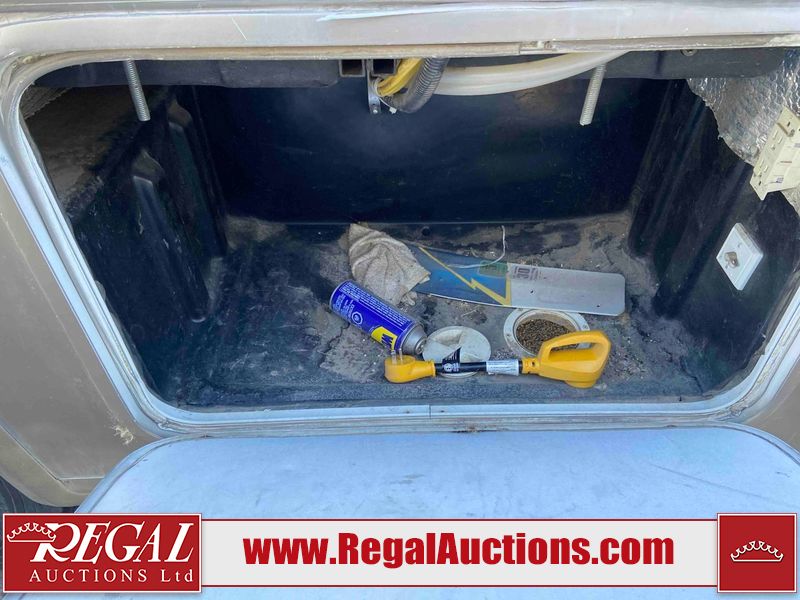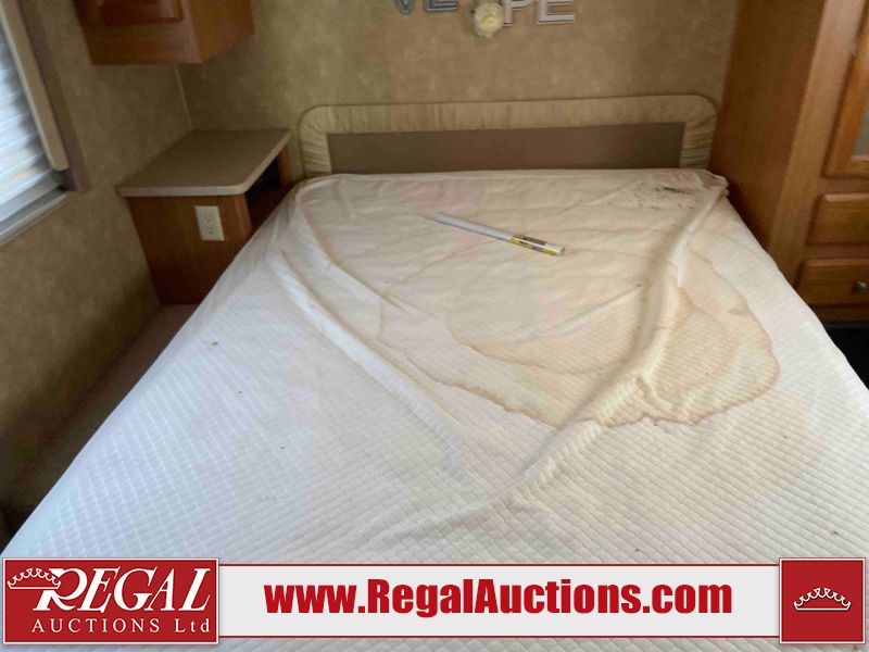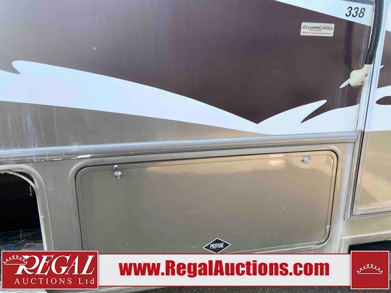 This motorhome is a 2006 Forest river Georgetown 338 model on a Ford chassis. It has a single door entry, roof, air, and a single slide out accommodating the living area. The odometer 74996 miles. Interiors dirty. The entry door cover is cracked. Some walls are showing scratches and scuffs. Some walls have drill holes. The dinette, bathroom, and bedroom air vent trims are cracked. The shower wall is cracked and separating. The bed is worn and stained. The Exterior walls are made of hard wall fiberglass. All walls are showing scratches and scuffs. The front bumper has peeling paint. The windshield is cracked. Both The left and right rear wall weatherstripping is peeling. The rear bumper is cracked, has peeling paint, and has been repainted. The rear wall has been poorly resealed. The right wall is showing water delamination. The entry steps has peeling paint. The slide out cannot be tested. The chassis batteries are dead and do not get power with external power applied. This unit starts and runs with a boost. The exhaust is noisy. This unit is powered by a 6.8L triton 10 cylinder gasoline, Ford engine and an automatic transmission. There is no emissions sticker. This unit is equipped with a guardian by generic power systems 7500 Watts generator. The generator shows 117 hours. The generator cannot be tested. diagnostics will need to be performed to determine its exact issues. The tires are mounted to alloy rims, the rear tires will need to be replaced. This unit is equipped with a microwave, three burner, stove, top, oven, refrigerator, television, and a stereo system. The layout consist of a living area in the front, kitchenette/dinette in the center, and a bathroom/master bedroom in the rear.