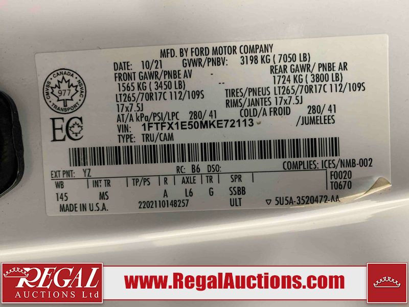 This 2021 FORD F-150 XLT 4D EXTENDED CREW CAB is powered by a 395HP 5.0L 8 cylinder gasoline engine and an automatic transmission. It is equipped with four wheel drive. The truck has seats for 6 people. The truck has high mileage for its age. The vehicle has high value options including a backup camera. The body looks to be in good condition overall. There are incidental chips on the front bumper, hood, left front fender, left rear fender, and right rear fender. There are scratches on the left front door, left rear fender, rear bumper, and pickup bed. There are very minor scratches in many areas around the body. There are very minor chips in some areas around the body. The interior looks to be in good condition overall. The windshield looks to be in good condition. All of the tires have lots of tread remaining. The left front centercap is missing. The left rear centercap is missing. This truck is being sold by an automotive broker. Regal Auctions Ltd. makes no guarantee or warranty, either express or implied, with respect to the data provided in this report. The information has been provided from the consignor and from sources generally believed to be reliable, however the accuracy of this information cannot be guaranteed by Regal Auctions.