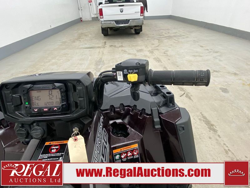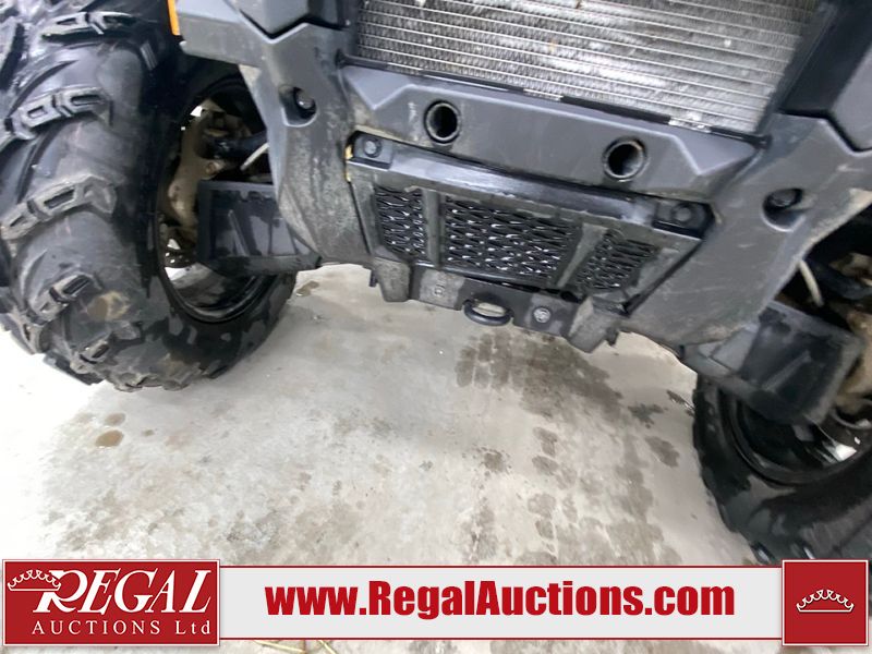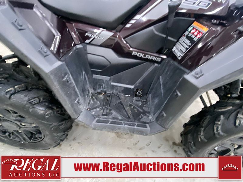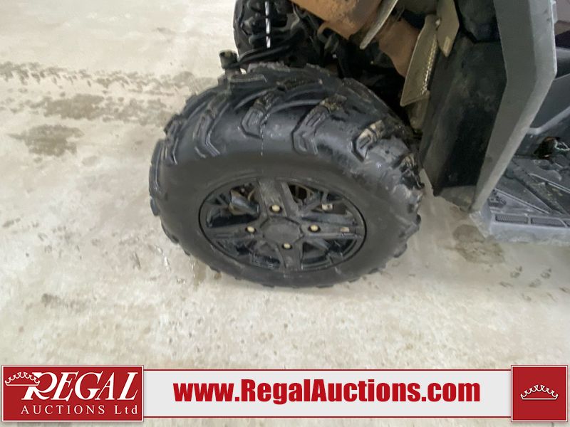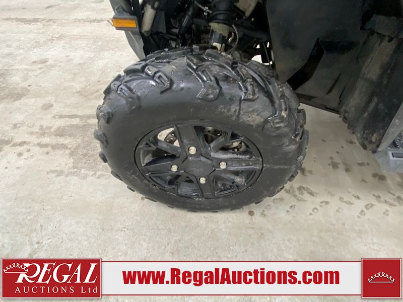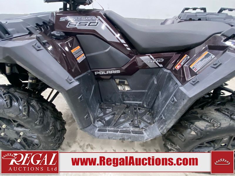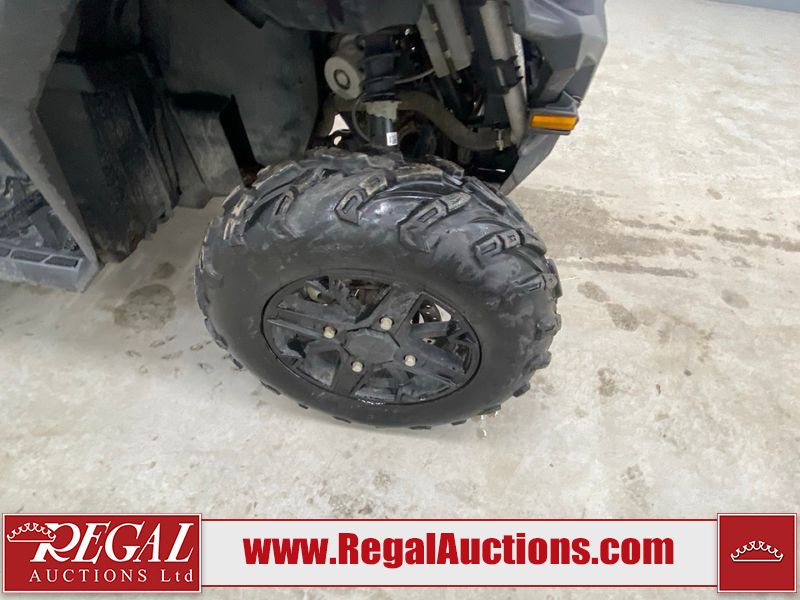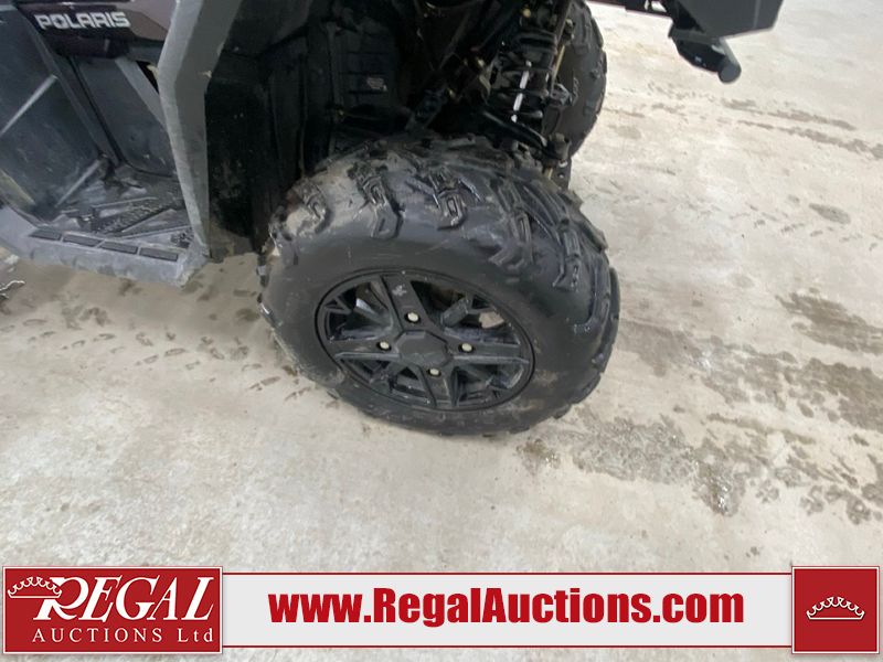 This ATV is a 2023 Polaris sportsman 850 EPS PREMIUM model. The odometer shows the odometer shows 1706 km and 71 engine hours. This unit is dirty, not all damages cannot be determined. All panels are showing minor chips, scratches, and scuffs. The rear crash bar has dents. This unit is powered by a 850 cc two cylinder for a stroke, liquid cooled engine and a continuously variable transmission with a shaft final drive. The tires are mounted on alloy rims and appear to be in good enough condition to be for use. This unit is equipped with a 2WD/4WD selector.