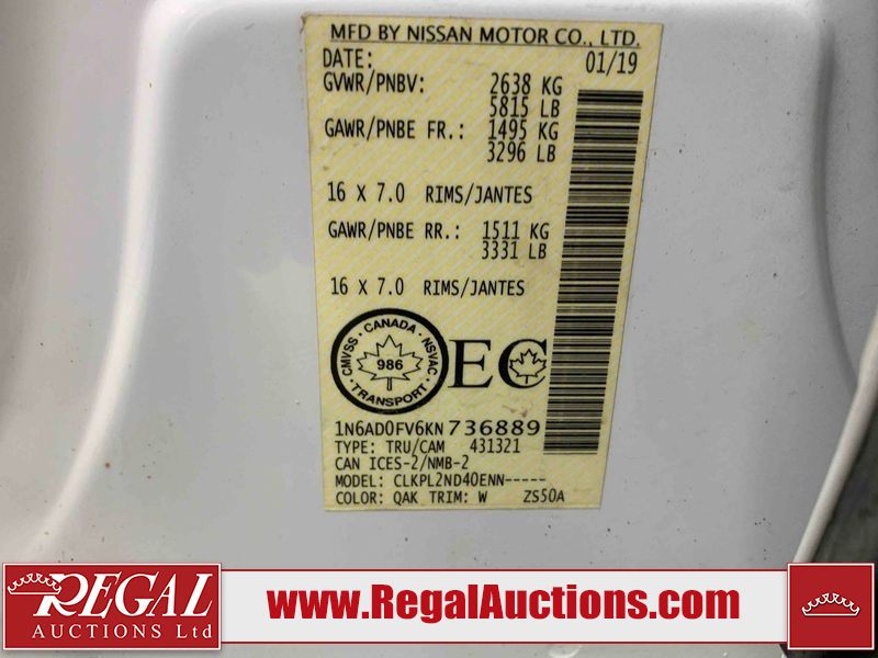 This 2019 NISSAN FRONTIER SV CREW CAB 4WD 4.0L is powered by a 4.0L 6 cylinder gasoline engine and an automatic transmission. It is equipped with four wheel drive. The truck has seats for 5 people. The truck has high mileage for its age. The vehicle has high value options including a backup camera. The body looks to be in fair condition overall. There is hail damage on the hood. There is very bad dent damage on the left rear fender. There is conspicuous hail on the hood. There are minor chips on the front bumper, hood, left rear fender, and right rear fender. There is rust on the hood, roof, and left front door. There are scratches on the rear bumper. There are very minor chips in many areas around the body. There are very minor scratches in a few areas around the body. The interior looks to be in good condition overall. The windshield is cracked. All of the tires have lots of tread remaining. This truck is being sold by the fleet department of a corporation or government body. The vehicle will be sold with the following declarations: Fleet Vehicle (See Footnote 1). Footnotes: 1) This vehicle is a commercially owned work vehicle. Regal Auctions Ltd. makes no guarantee or warranty, either express or implied, with respect to the data provided in this report. The information has been provided from the consignor and from sources generally believed to be reliable, however the accuracy of this information cannot be guaranteed by Regal Auctions.