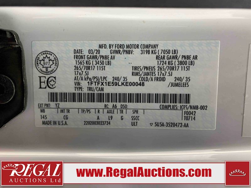 This 2020 FORD F-150 XL EXTENDED CAB PICKUP 4WD is powered by a 8 cylinder gasoline engine and an automatic transmission. It is equipped with four wheel drive. The truck has seats for 6 people. The truck has low mileage for its age. The body looks to be in good condition overall. The tail gate is missing. There are minor chips on the front bumper, hood, and right front fender. There are scratches on the rear bumper. There are very minor scratches in many areas around the body. There are very minor chips on the left front door. The interior looks to be in good condition overall. There are obvious stained on the passenger seat. The windshield is cracked. All of the tires have lots of tread remaining. This truck is being sold by a private individual. Regal Auctions Ltd. makes no guarantee or warranty, either express or implied, with respect to the data provided in this report. The information has been provided from the consignor and from sources generally believed to be reliable, however the accuracy of this information cannot be guaranteed by Regal Auctions.