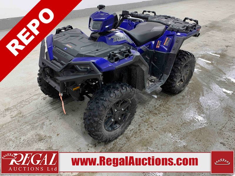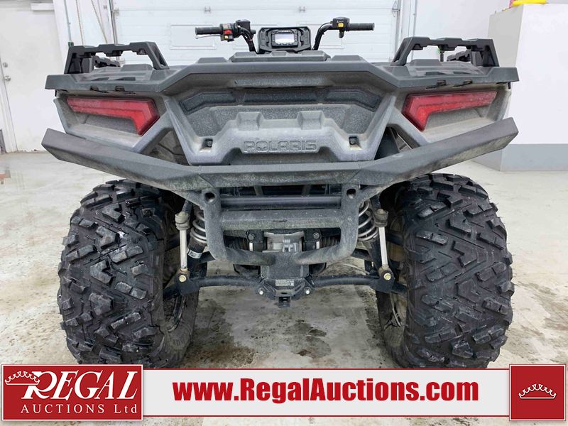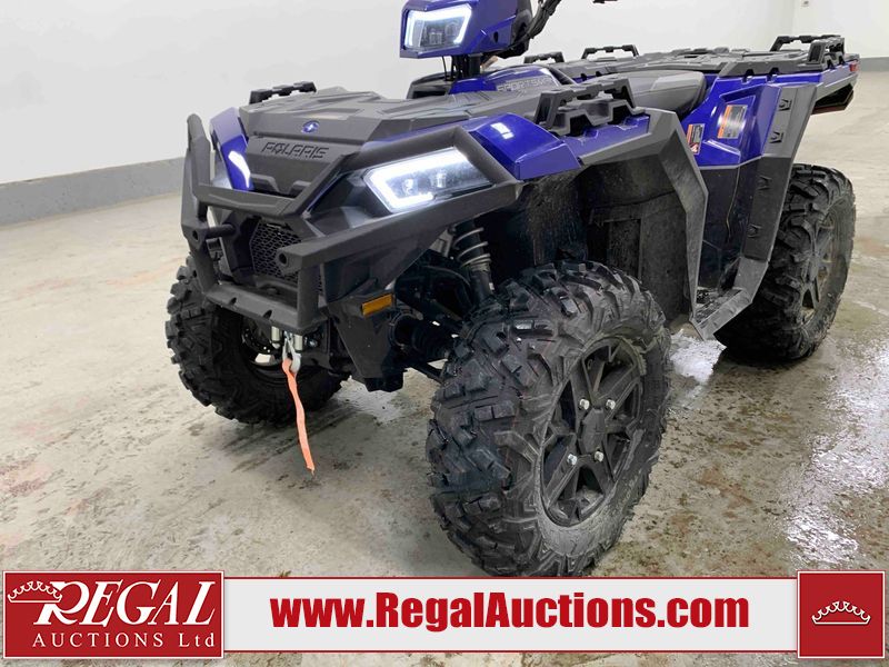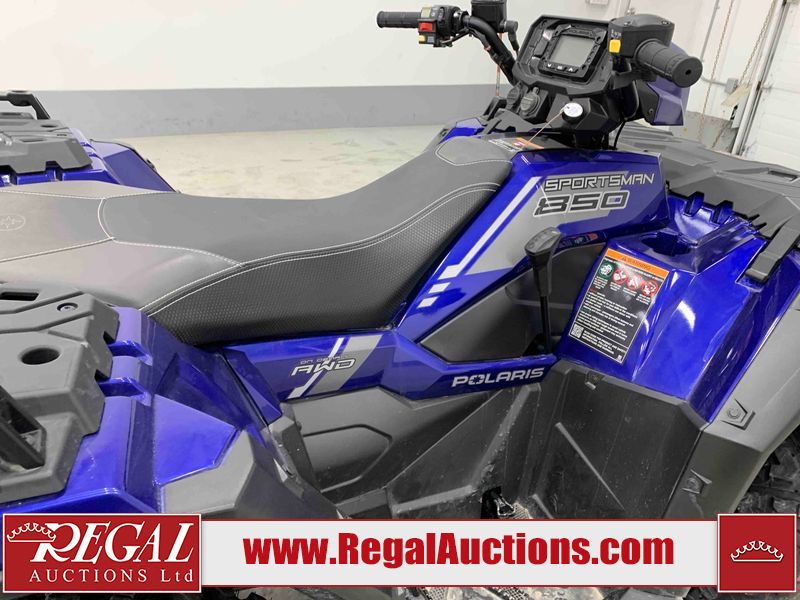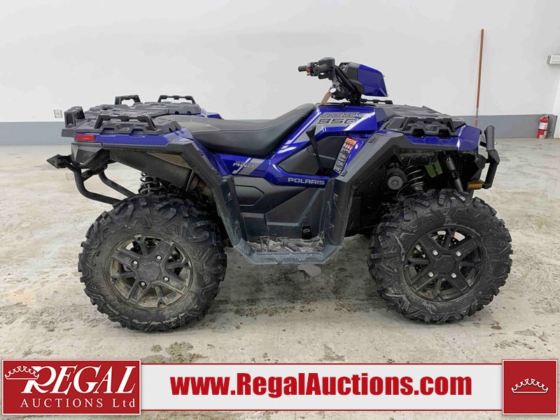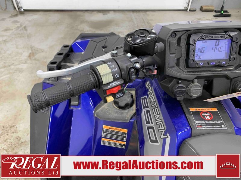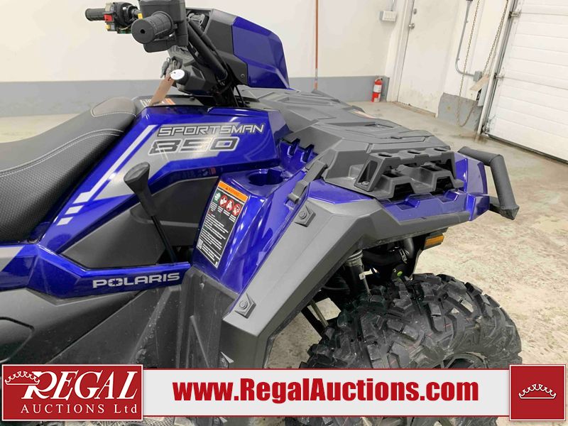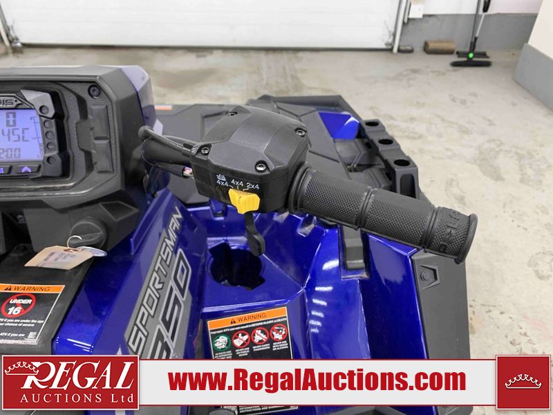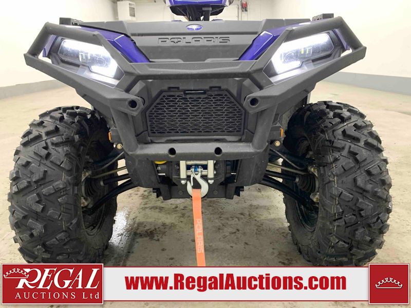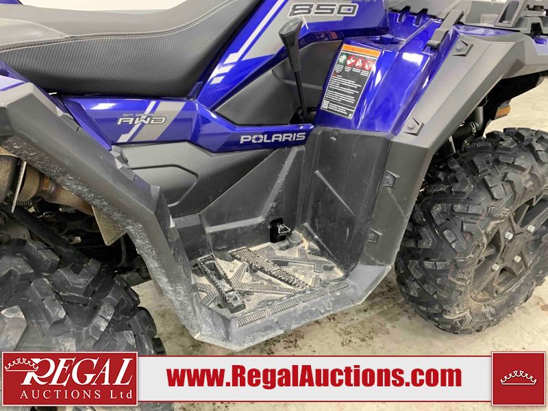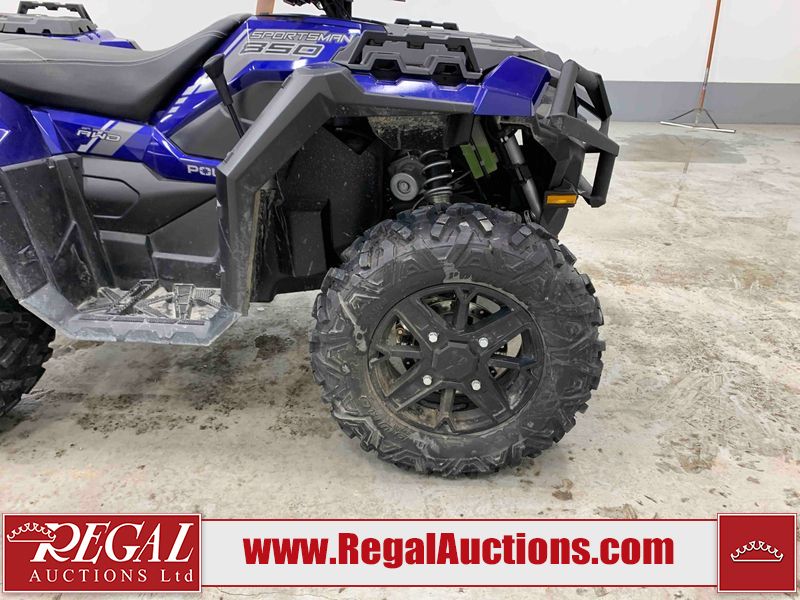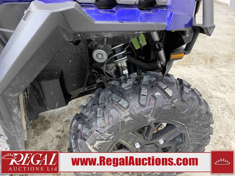 This ATV is a 2024 Polaris Sportsman 850. The odometer reads 499 km and 10 engine hours. The exterior is in very good condition overall. Only a few minor scuffs noted, no major damage. The engine starts and runs without a boost. The unit is powered by an 850 cc two cylinder four stroke liquid cooled engine and a continuously variable transmission with a shaft final drive. This unit is equipped with 4X4/2X4 selector switch, and an electric front winch.