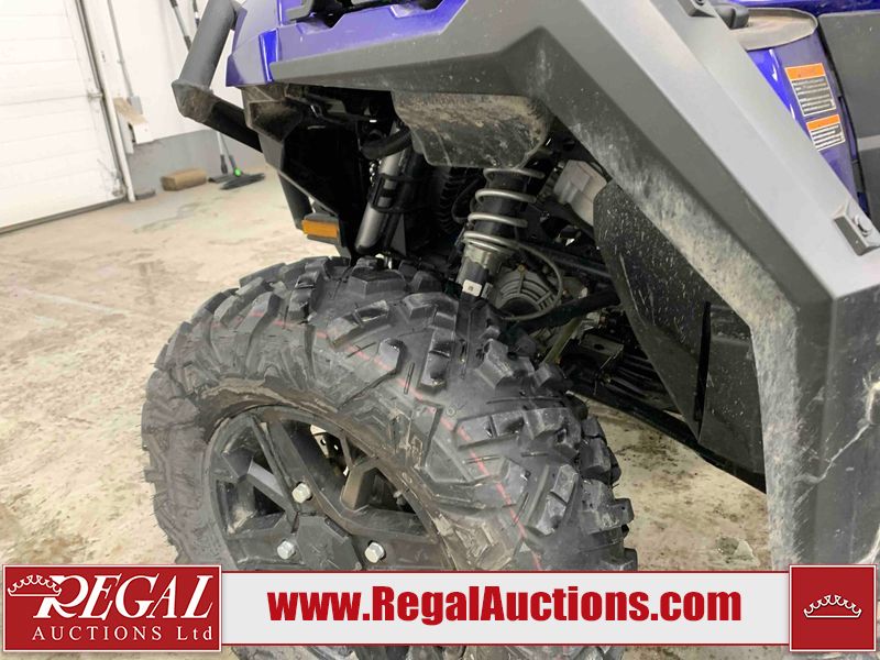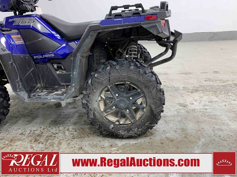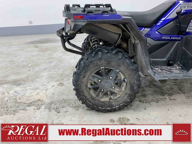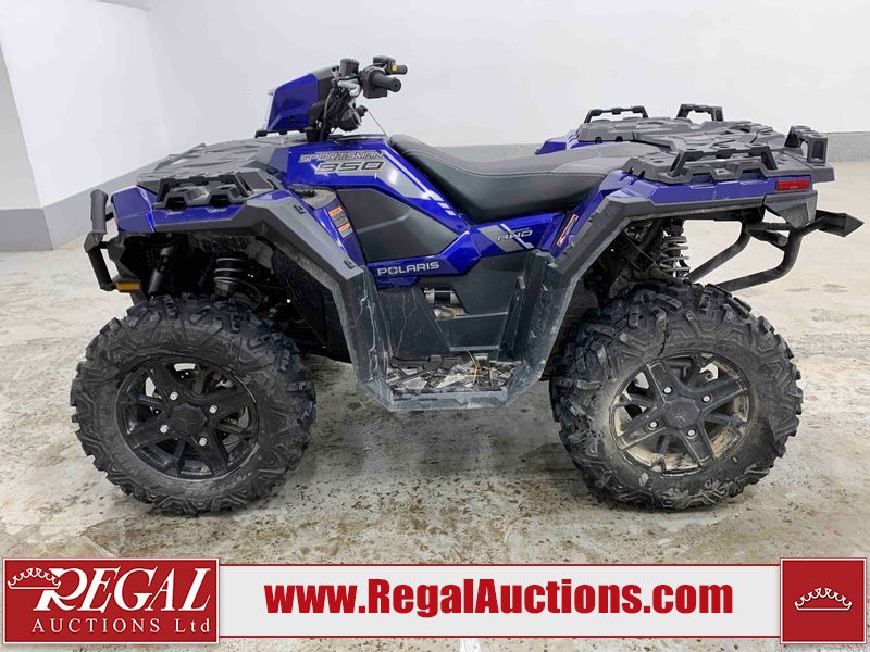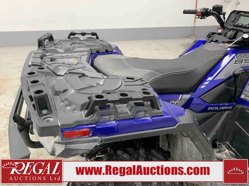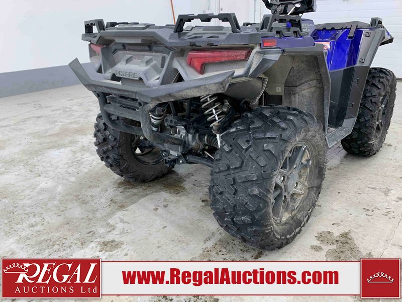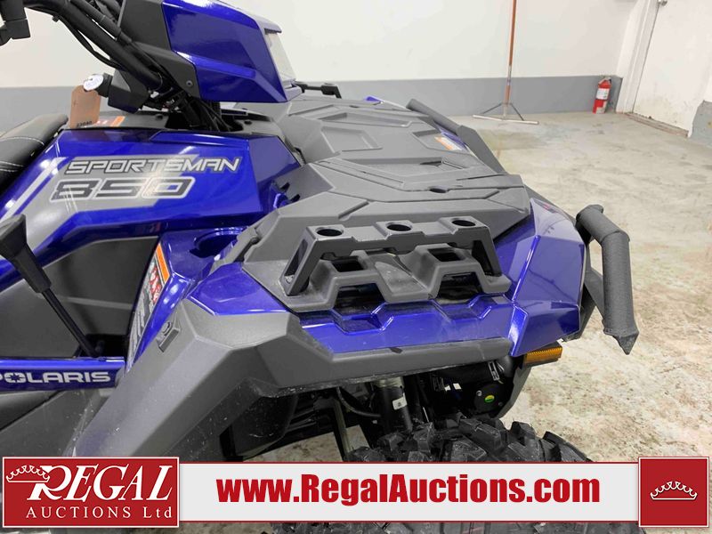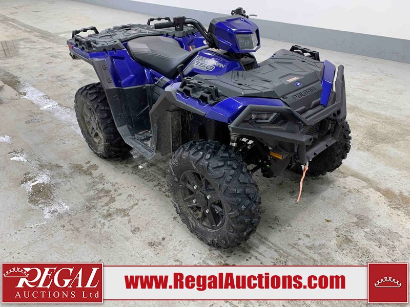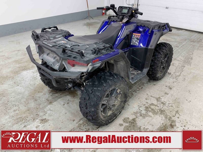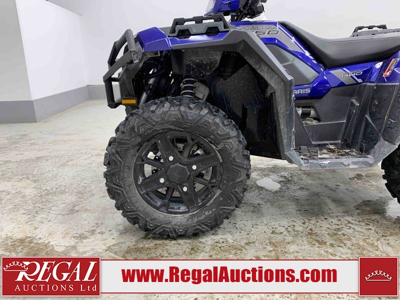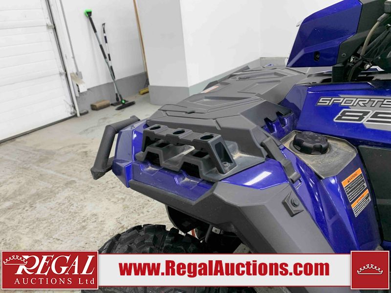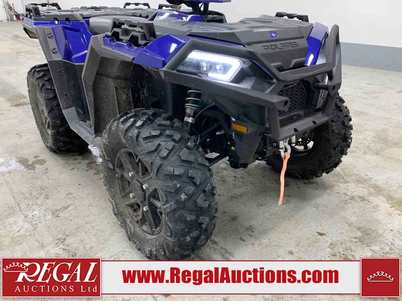 This ATV is a 2024 Polaris Sportsman 850. The odometer reads 499 km and 10 engine hours. The exterior is in very good condition overall. Only a few minor scuffs noted, no major damage. The engine starts and runs without a boost. The unit is powered by an 850 cc two cylinder four stroke liquid cooled engine and a continuously variable transmission with a shaft final drive. This unit is equipped with 4X4/2X4 selector switch, and an electric front winch.