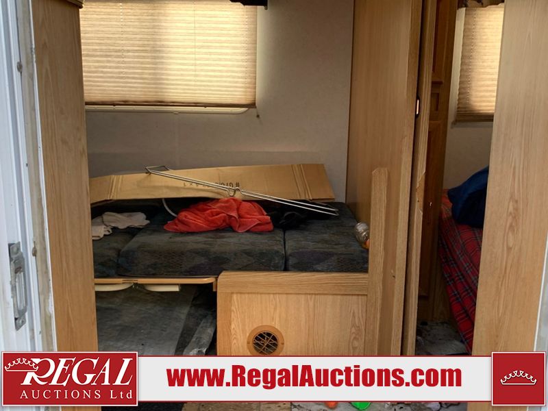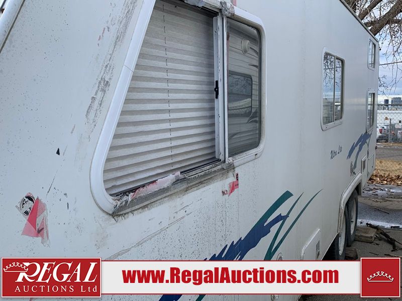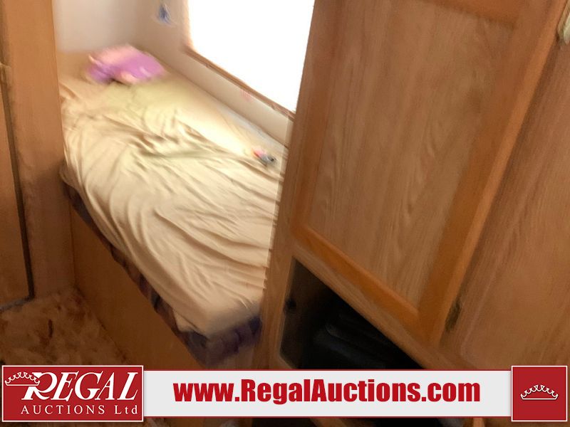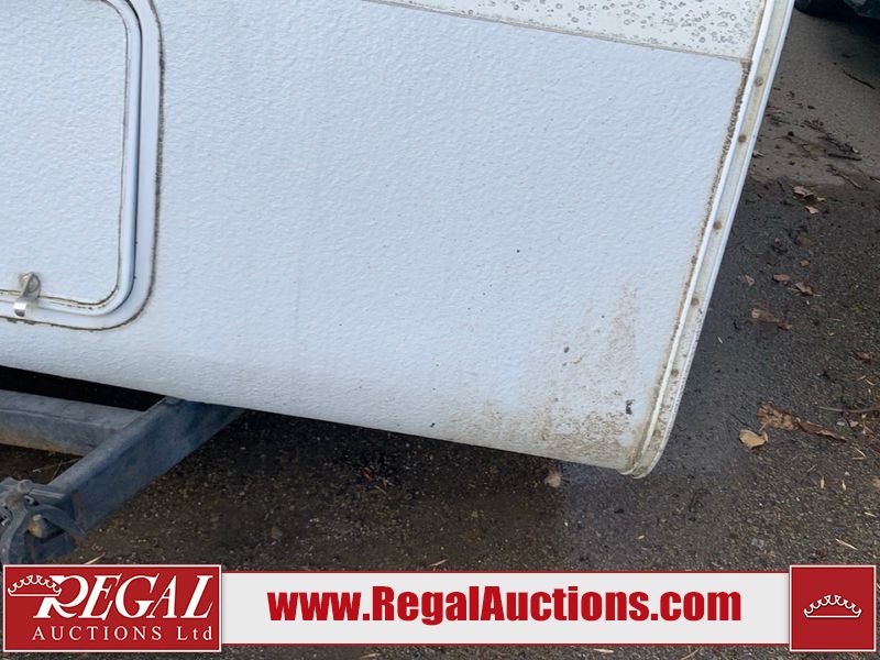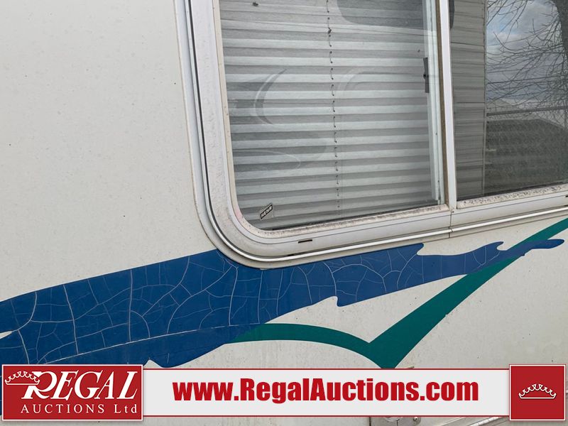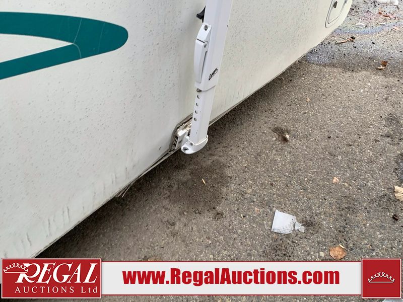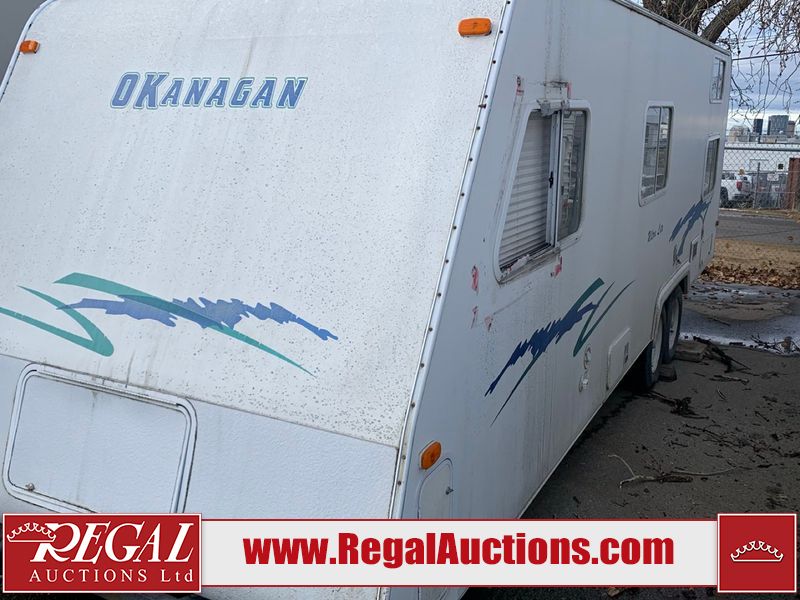 This 26' RV is a 2001 Okanagon Ultra Lite series 26 model bumper pull travel trailer. This unit is equipped with roof air and a single entry door. The door is locked and this unit does not have keys, the interior contents are unknown. The interior is dirty. The exterior walls are made of hard wall fibreglass. All exterior walls have water delamination, split panels and mildew spots. the front and rear right side trim is peeling off. The awning is torn. The door has cracks. Both plastic fenders are cracked. The front window is broken. The front jackstand is missing. The decals are peeling and cracked. The step is bent. Steel rims are mounted, the tires will need to be replaced. This unit is equipped with two propane tanks, the batteries are missing. The interior options on this unit are unknown.