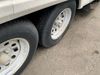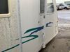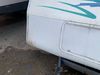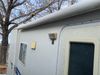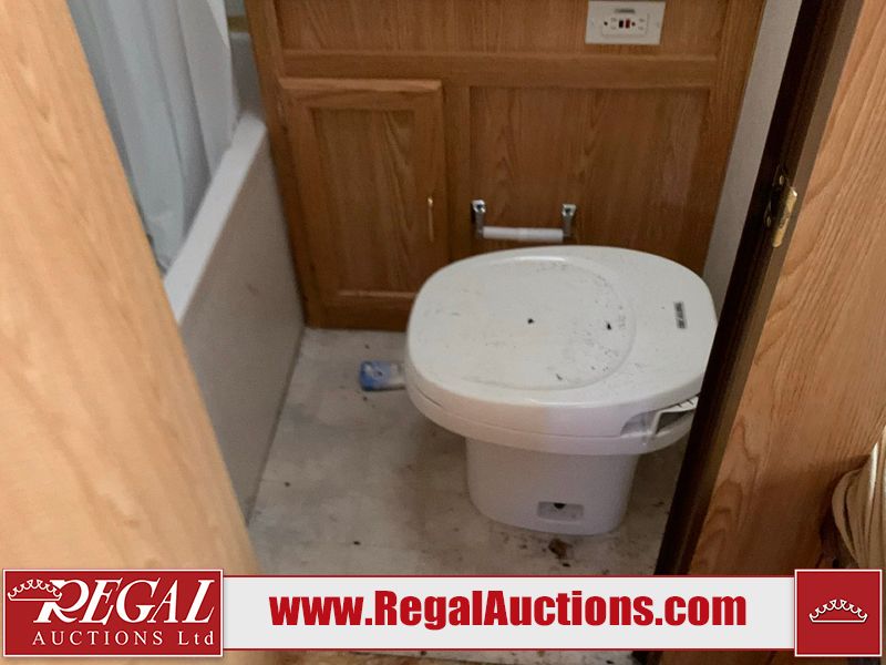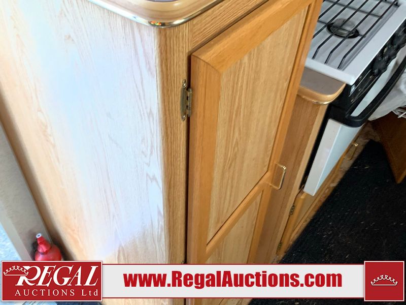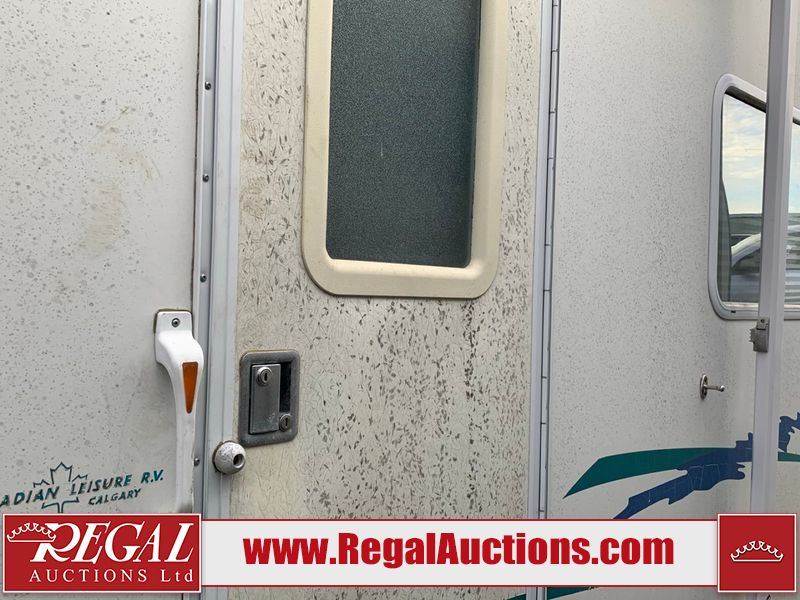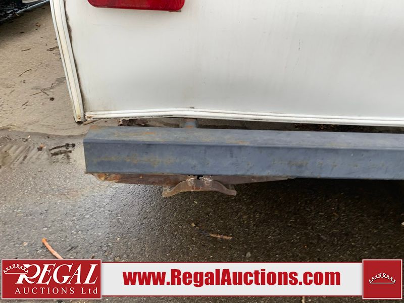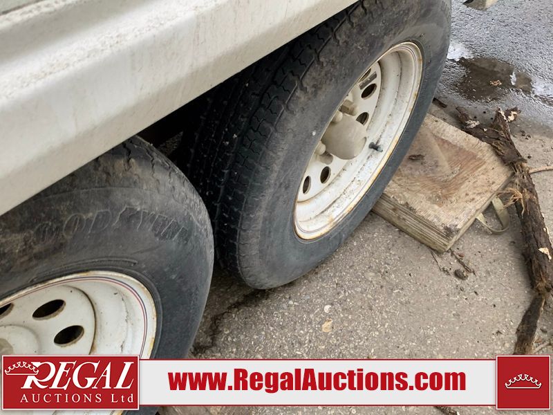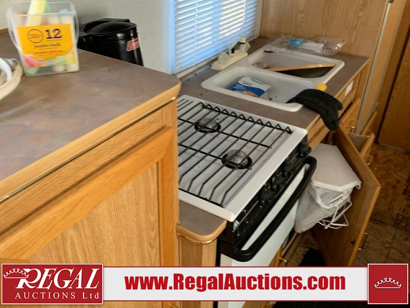 This 26' RV is a 2001 Okanagon Ultra Lite series 26 model bumper pull travel trailer. This unit is equipped with roof air and a single entry door. The door is locked and this unit does not have keys, the interior contents are unknown. The interior is dirty. The exterior walls are made of hard wall fibreglass. All exterior walls have water delamination, split panels and mildew spots. the front and rear right side trim is peeling off. The awning is torn. The door has cracks. Both plastic fenders are cracked. The front window is broken. The front jackstand is missing. The decals are peeling and cracked. The step is bent. Steel rims are mounted, the tires will need to be replaced. This unit is equipped with two propane tanks, the batteries are missing. The interior options on this unit are unknown.