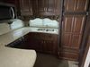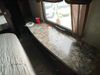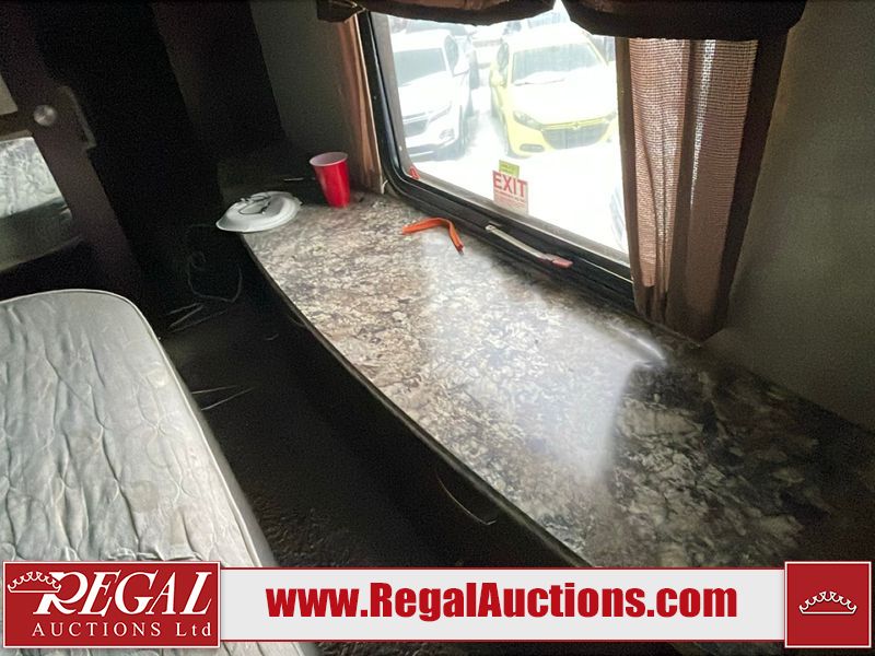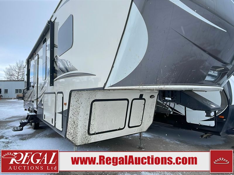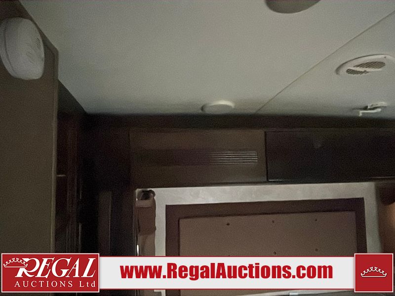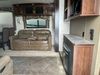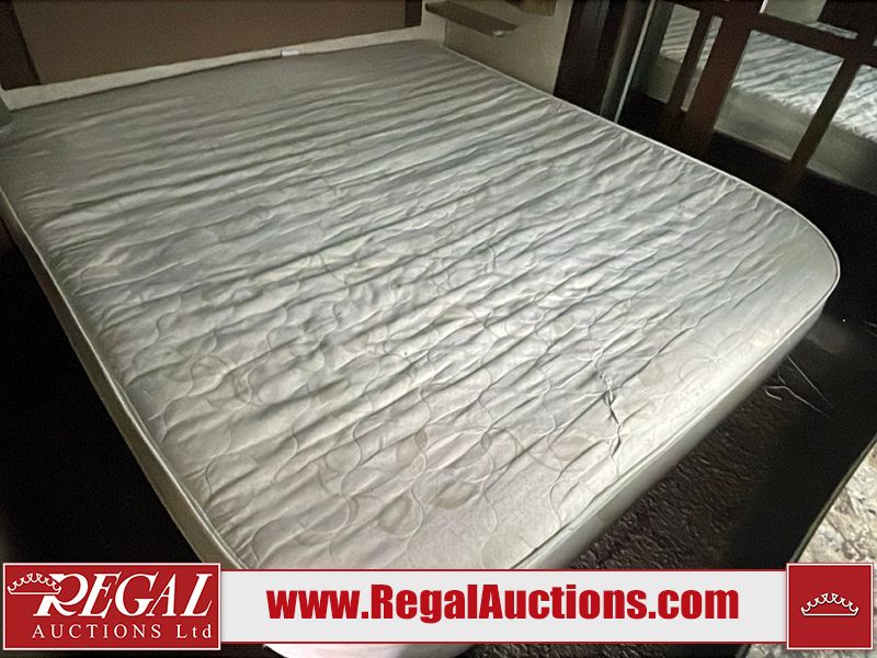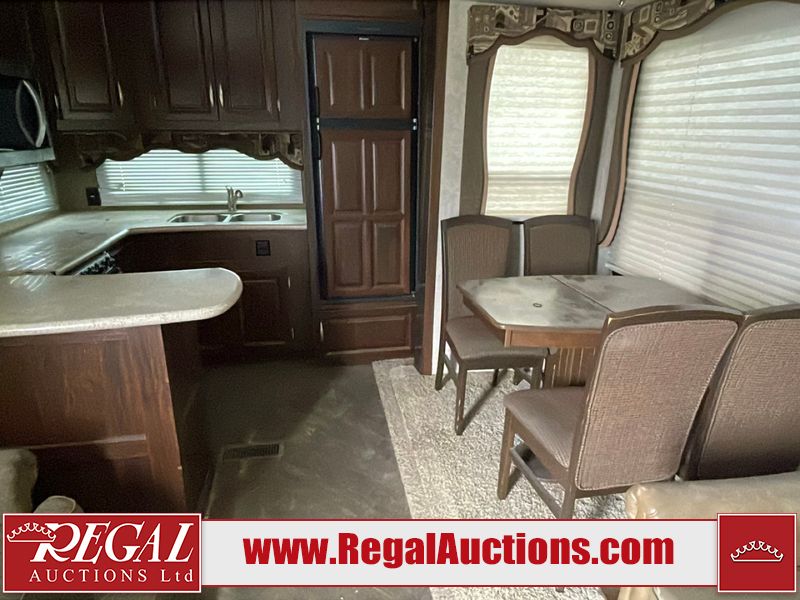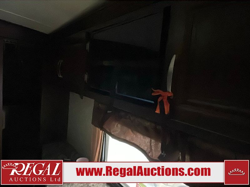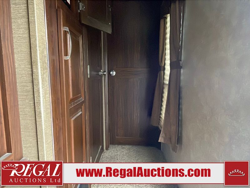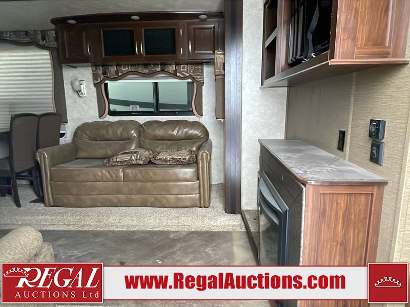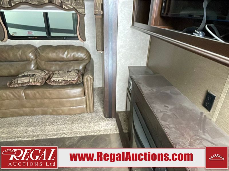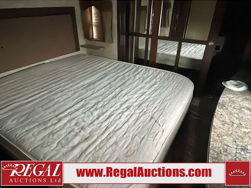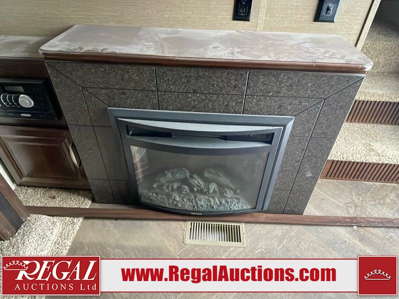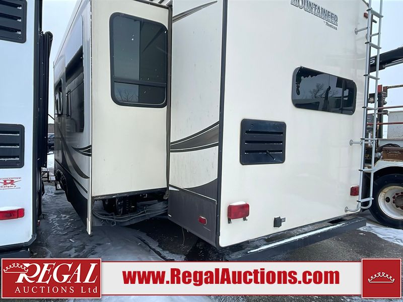 This RV is a 2014 Keystone Montana Mountaineer 295RKD model tandem axle fifth wheel trailer. It has a single door entry, roof air, and two slide outs, accommodating the living area. The interior is dirty. One of the wall trims has separated. The couch is stained. Both the master bedroom and bathroom door have peeling paint. The bathroom sky vent is cracked. The bed is worn and stained. The exterior walls are made of hard wall fiberglass. some walls are showing scratches and scuffs. Some decals are peeling. The left fender is separating. The right rear wall is showing minor water delamination. This unit gets power with external power applied. The battery is dead. Both propane tanks are missing. The tires are mounted to alloy rims and appear to be in good enough condition for use. It is equipped with a television, electrical fireplace, refrigerator, microwave, free, burner, stove, top, oven, and a stereo system. The layout consist of a master bedroom/bathroom in the front, living area in the center, and a kitchenette in the rear.