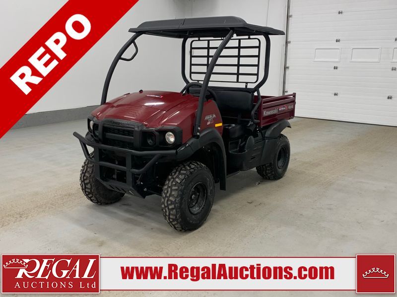 This ATV is a 2022 Kawasaki KF400P model side-by-side. The engine hours show 39 hours. The interior is clean. The leather is cracking in some areas of the seat. The crash bar is scratched. Some plastics are scuffed. Some decals are peeling. This unit starts and runs without a boost. This unit is powered by a 401cc single cylinder, four stroke Air cooled engine and a continuously variable transmission with a shaft final drive. The tires are mounted to alloy rims and appear to be in good enough condition for use. This unit is equipped with a differential lock, and a 2WD/4WD selector.