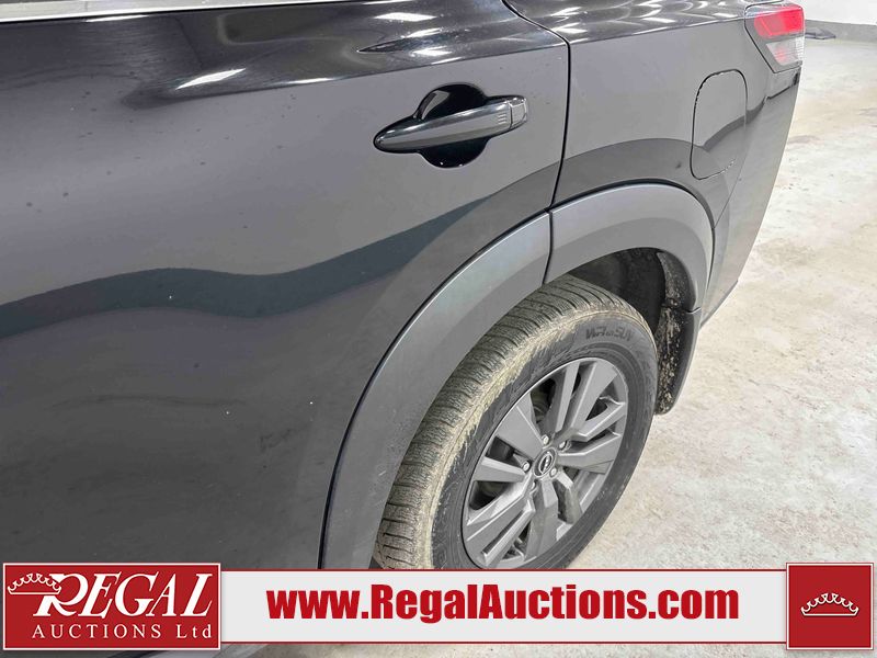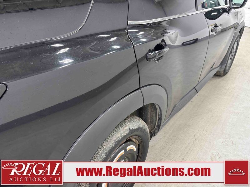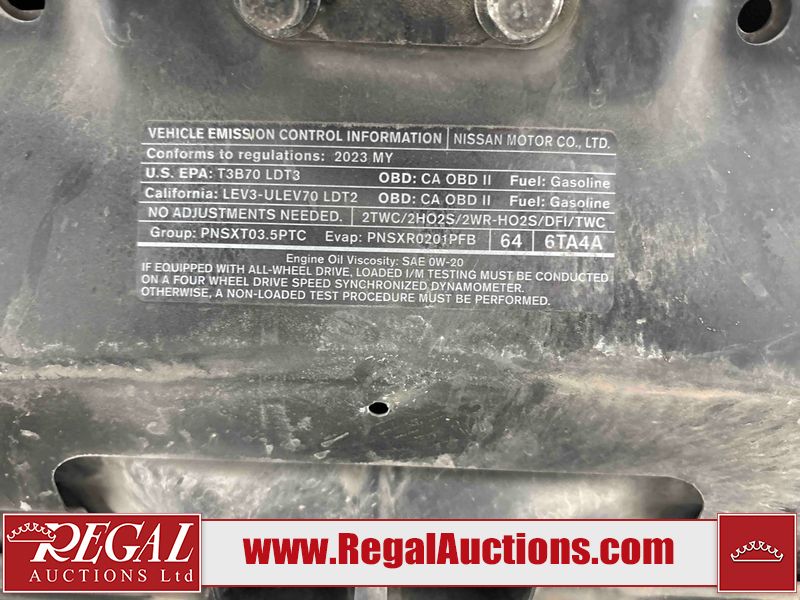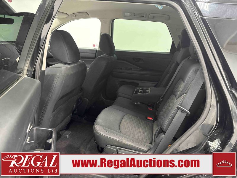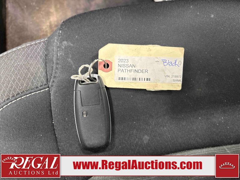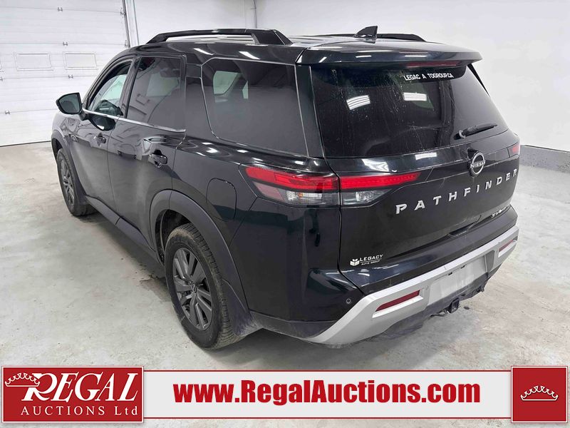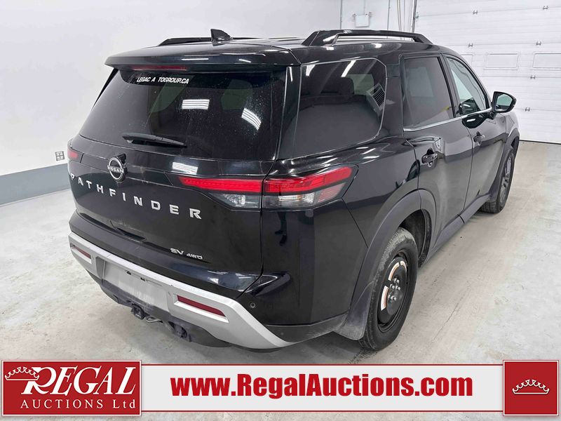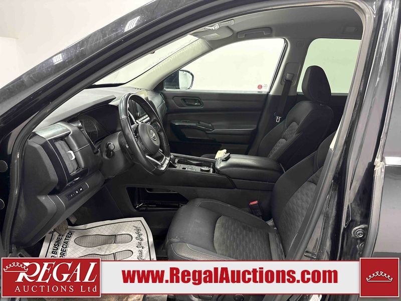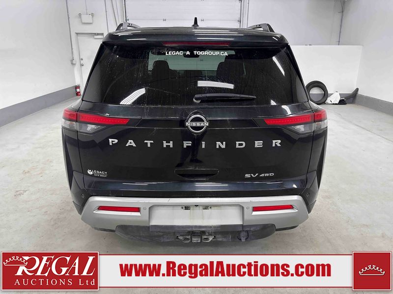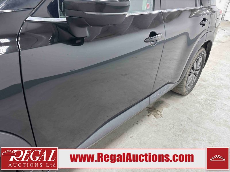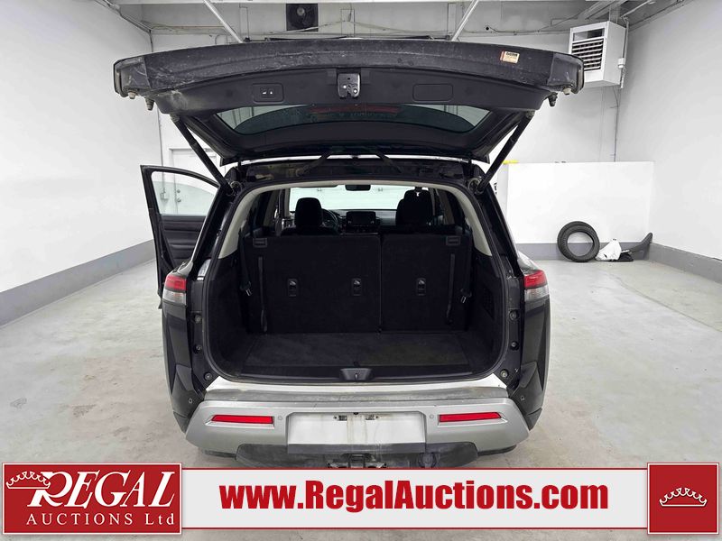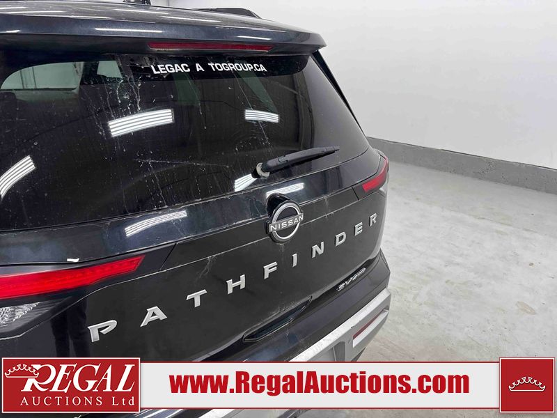 This 2023 NISSAN PATHFINDER SV 4D UTILITY 4WD 3.5L is powered by a 6 cylinder gasoline engine and an automatic transmission. It is equipped with four wheel drive. The SUV has seats for 7 people. The SUV has high mileage for its age. The vehicle has high value options including power seats, heated seats, a backup camera, and a power lift gate. The Check Engine and Tire Pressure lights are on. The body looks to be in rough condition overall. There are substantial scratches on the rear bumper. There are pronounced scratches on the left front fender and left front door. There are minor chips on the front bumper, grille, hood, roof, left front fender, left front door, left rear door, left rear fender, rear bumper, right rear fender, right rear door, right front door, and right front fender. There are scratches on the front bumper, hood, roof, left rear door, left rear fender, rear door, right rear fender, right rear door, right front door, and right front fender. There is slight dent damage on the rear door, right rear fender, and right rear door. There are very minor chips on the rear door. The interior looks to be in fair condition overall. The passenger seat and rear seats are stained. The carpet is dirty. One or more of the windows are broken. The windshield is chipped. The front tires are both worn. The passenger side rear tire is nearly bald and should be replaced. The right rear wheel is a spare. The driver's window glass is broken.