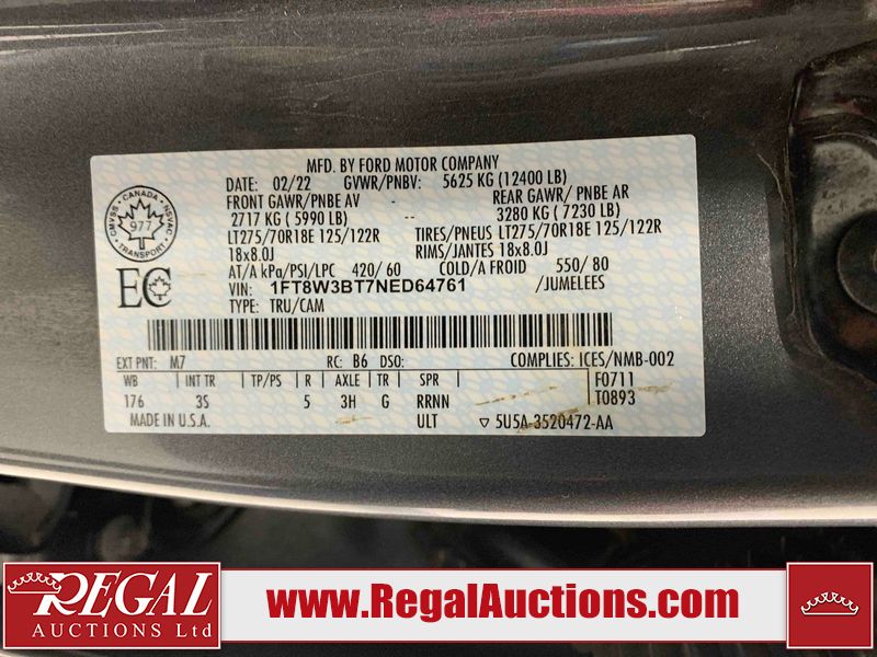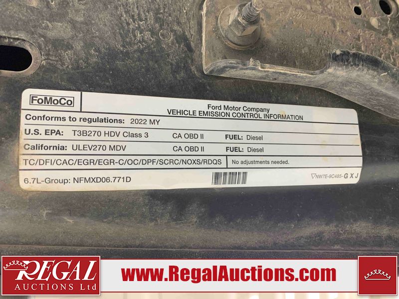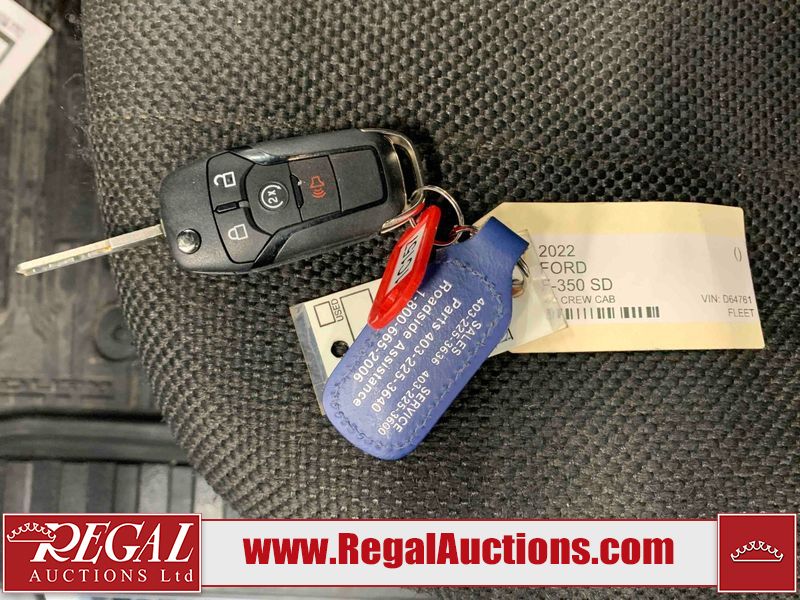 This 2022 FORD F-350 SD XLT CREW CAB SRW 4WD is powered by a turbocharged 6.7L V8 diesel engine and an automatic transmission. It is equipped with four-wheel drive. The truck has seats for 6 people. The truck has high mileage for its age. The vehicle has high-value options including power seats, heated seats, and a backup camera. The body looks to be in fair condition overall. There is rust on the front bumper. There are chips on the front bumper, hood, left front fender, left rear fender, right rear fender, and right front fender. The fascia is broken on the front bumper. There are scratches on the left rear fender, rear bumper, tailgate, right rear fender, and right rear door. There are very minor chips in many areas around the body. There is very minor dent damage on the hood. There are very minor scratches in some areas around the body. The interior looks to be in good condition overall. The front passenger window is cracked. The windshield is chipped. All of the tires have lots of tread remaining. This truck is being sold by the fleet department of a corporation or government body. The vehicle will be sold with the following declarations: Fleet Vehicle (See Footnote 1). Footnotes: 1) This vehicle is a commercially owned work vehicle. Regal Auctions Ltd. makes no guarantee or warranty, either express or implied, with respect to the data provided in this report. The information has been provided from the consignor and from sources generally believed to be reliable, however the accuracy of this information cannot be guaranteed by Regal Auctions.