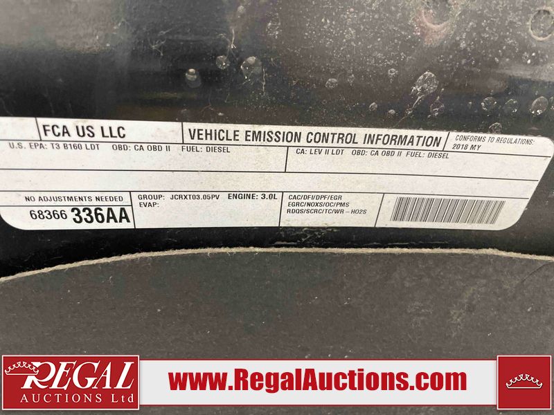 This 2018 RAM 1500 OUTDOORSMAN CREW CAB SWB 4WD 3.0L is powered by a turbocharged 6 cylinder diesel engine and an automatic transmission. It is equipped with four wheel drive. The truck has seats for 5 people. The truck has low mileage for its age. The vehicle has high value options including power seats, heated seats, and a backup camera. The body looks to be in fair condition overall. There are minor chips on the front bumper, grille, hood, left front fender, and right front fender. There is slight paint peeling on the left front door and tail gate. The left rear fender and tail gate have been repainted. There is incidental dent damage on the rear bumper and tail gate. There are incidental scratches on the right rear fender. There are very minor scratches in many areas around the body. There are very minor chips in many areas around the body. There is very minor dent damage on the left front door. The interior looks to be in fair condition overall. The passenger seat is stained. The dashboard is dirty. The carpet is dirty. The roof liner is dirty. The windshield is chipped. All of the tires have lots of tread remaining.