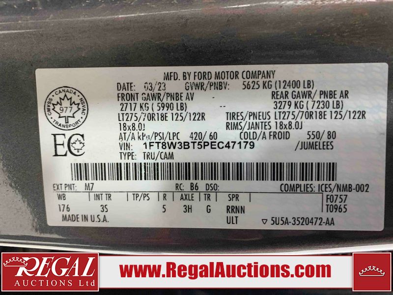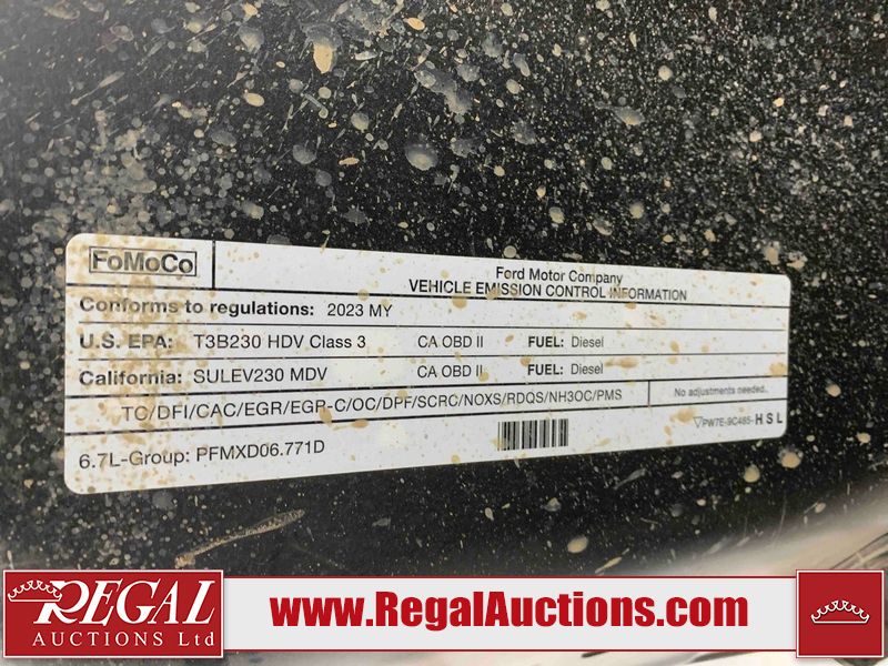 This 2023 FORD F-350 SD XLT CREW CAB SRW 4WD is powered by a turbocharged 6.7L V8 diesel engine and an automatic transmission. It is equipped with four-wheel drive. The truck has seats for 6 people. The truck has high mileage for its age. The vehicle has high-value options including power seats and a backup camera. The body looks to be in fair condition overall. There are a fair amount of scratches on the left rear fender. There are chips on the front bumper, hood, left front fender, and left rear fender. There is incidental dent damage on the hood and left front door. There are slight scratches on the left rear door, tailgate, right rear fender, right rear door, and right front door. There is minor paint peeling on the tailgate. There are very minor scratches in a few areas around the body. There are very minor chips in some areas around the body. There is very minor dent damage on the left rear fender. The fog lights are broken. The splashshield on the front bumper is cracked. The interior looks to be in good condition overall. The windshield is cracked. All of the tires have lots of tread remaining. This truck is being sold by the fleet department of a corporation or government body. The vehicle will be sold with the following declarations: Fleet Vehicle (See Footnote 1). Footnotes: 1) This vehicle is a commercially owned work vehicle. Regal Auctions Ltd. makes no guarantee or warranty, either express or implied, with respect to the data provided in this report. The information has been provided from the consignor and from sources generally believed to be reliable, however the accuracy of this information cannot be guaranteed by Regal Auctions.