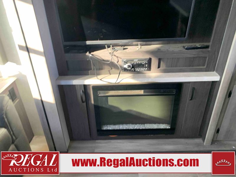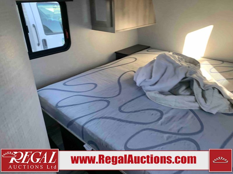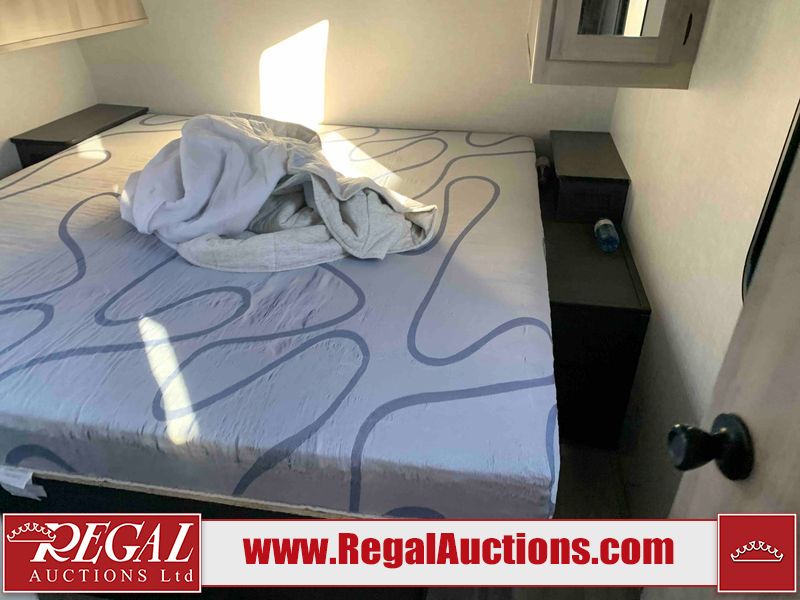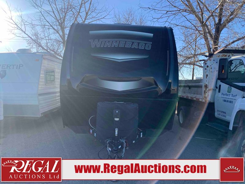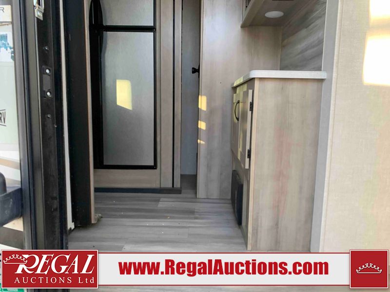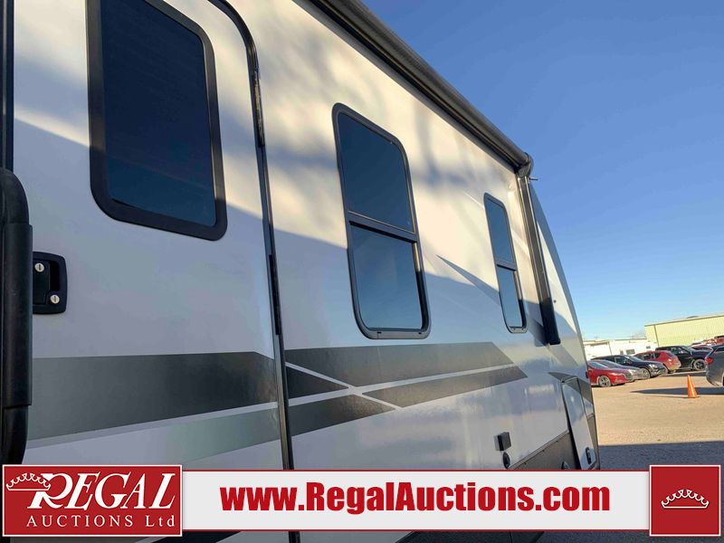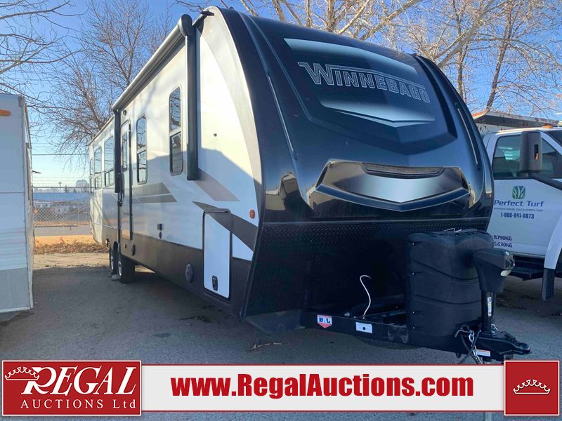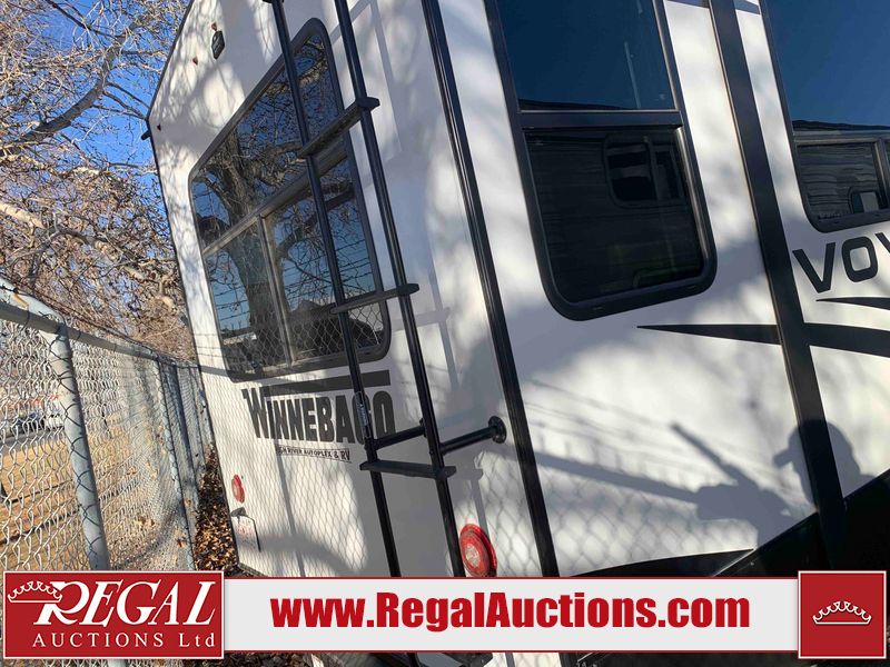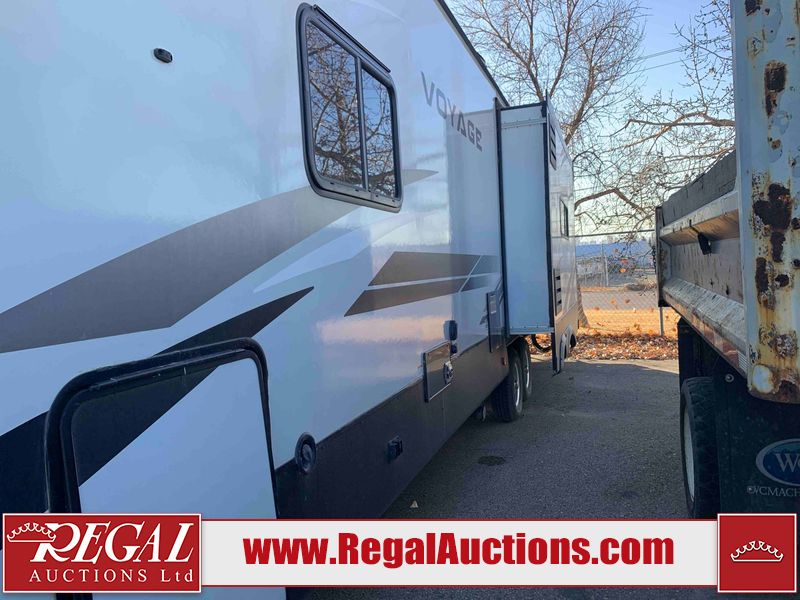 This RV is a 2021 Winnebago voyage series 3235R model bumper pull travel trailer. This unit has a single entry door, roof air and 2 slide out's accommodating the living area/kitchen. The interior is dirty. The floor has scratched and scuffs. Some of the wooden trim has chips and scrapes. The exterior walls are made of hardwall fiberglass. The front checker plate has chips. The right side wall has light scuffs. The kitchen slide has troubles, extending and retracting and may require repair. This unit is equipped with two propane tanks, the battery is missing. Unit is equipped with alloy rims, the tires appear to be in good condition for use. This RV is equipped with a stereo system, flatscreen television, electrical fire place, three burner stove top, oven, microwave and refrigerator. The lay out consists of master bedroom/bathroom in the front, and a kitchinette/living area in the rear.