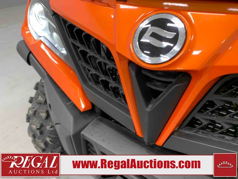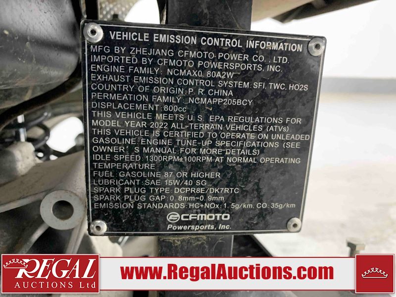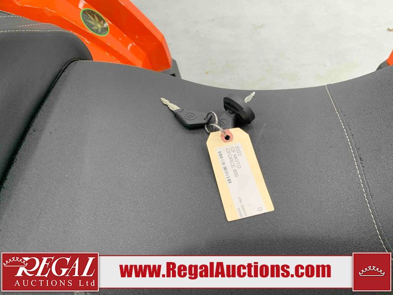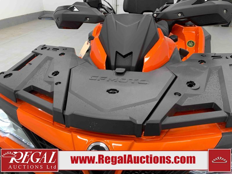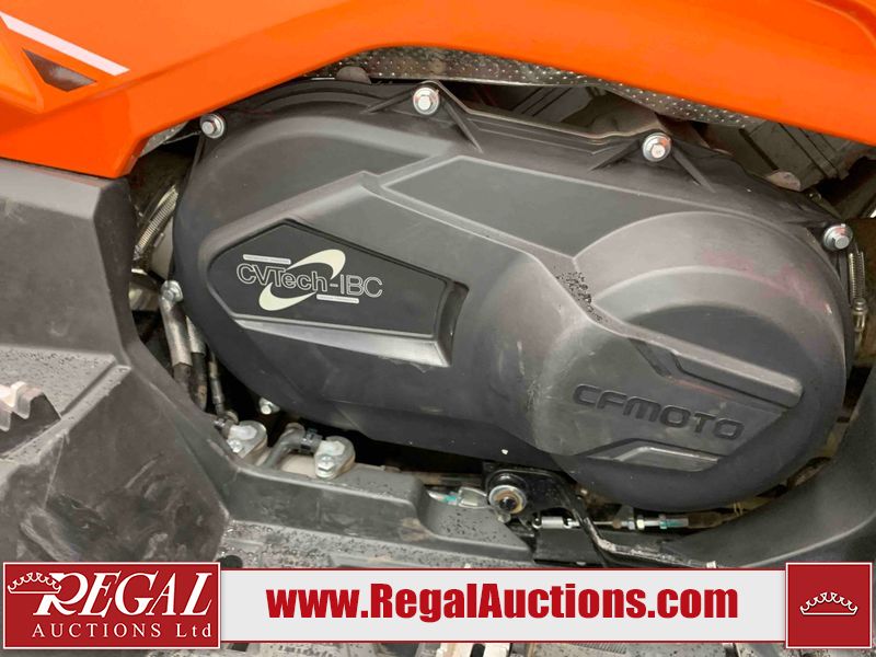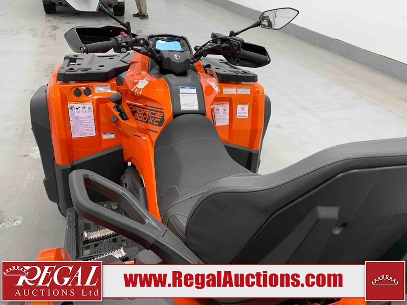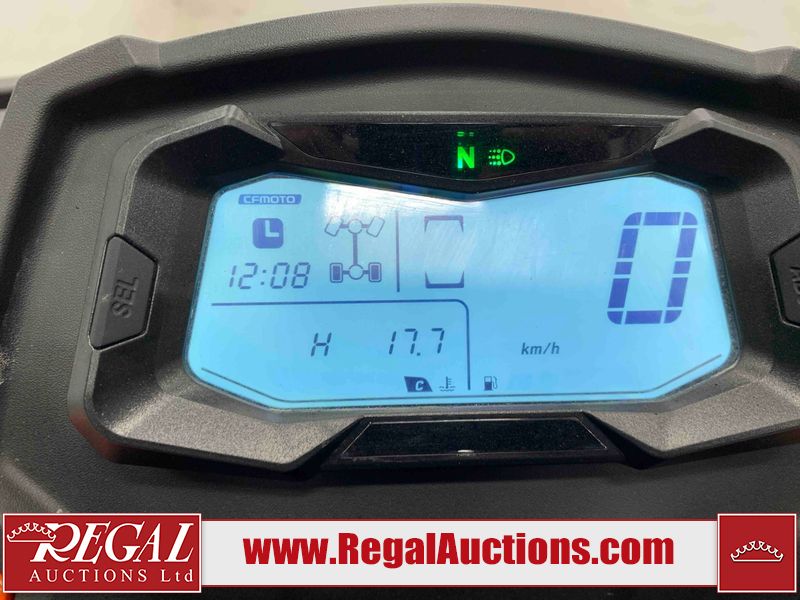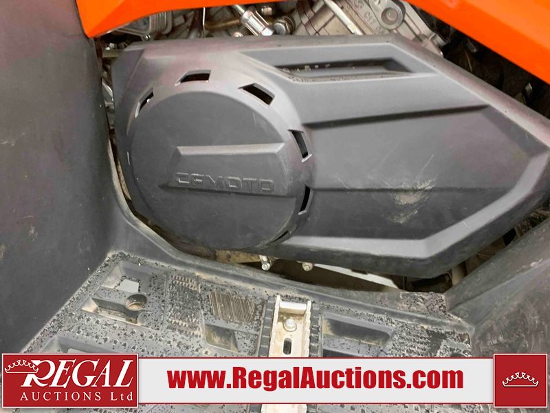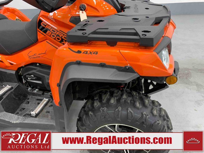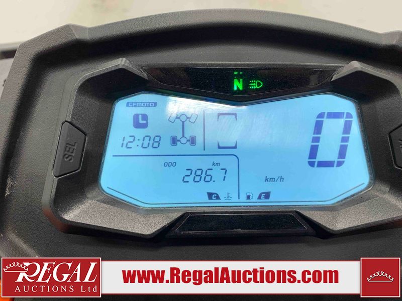 This ATV is a 2022 CFMoto Cforce 800 model. The odometer shows 286 km and 17 engine hours. The seat has scuffs. The crash bar is chipped. All plastics are showing scratches and scuffs. The left front fender is gouged. The rear compartment handle is broken. Some decals are peeling. This unit starts and runs without a boost. This unit is powered by a 800 cc V twin four stroke liquid cooled engine and a automatic transmission with a shaft final drive. The tires are mounted to all rims and appear to be in good enough condition for use. This unit is equipped with a 2WD/4WD selector.
