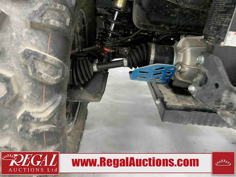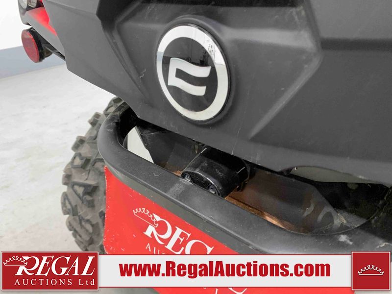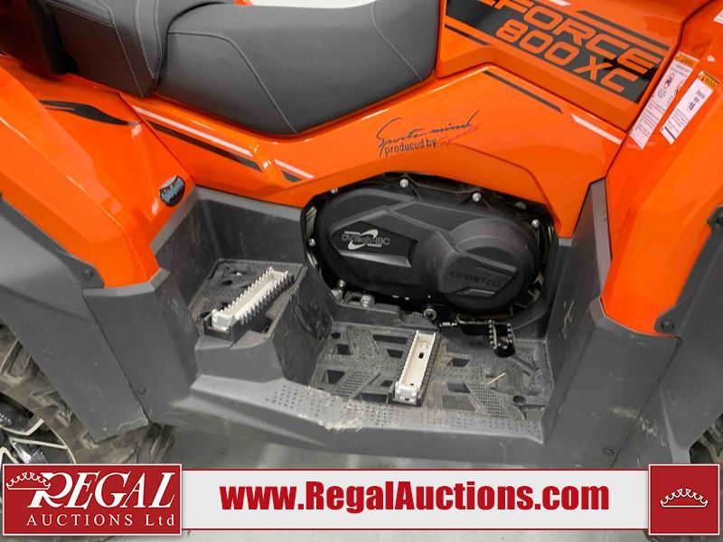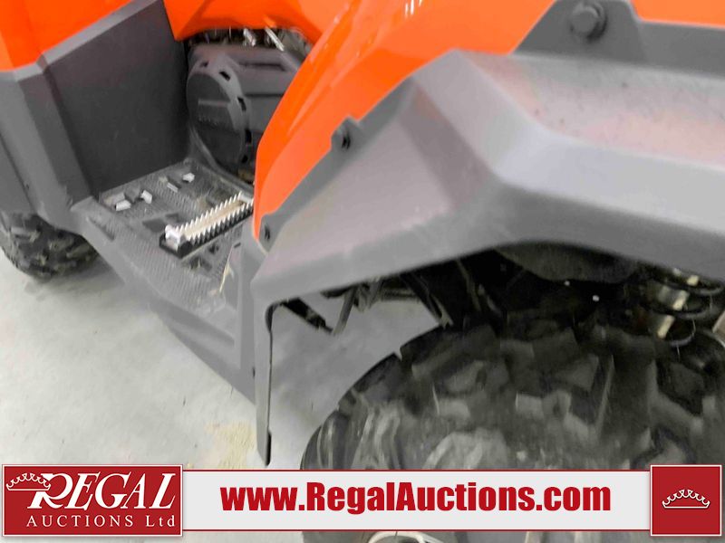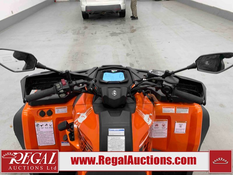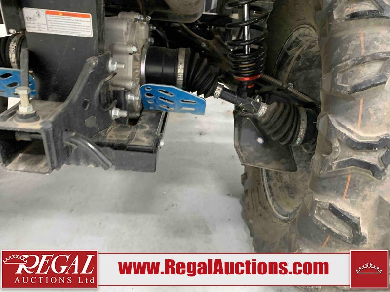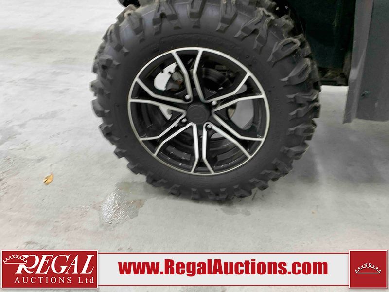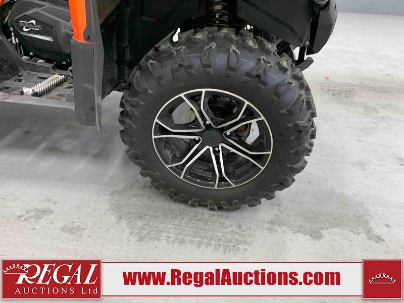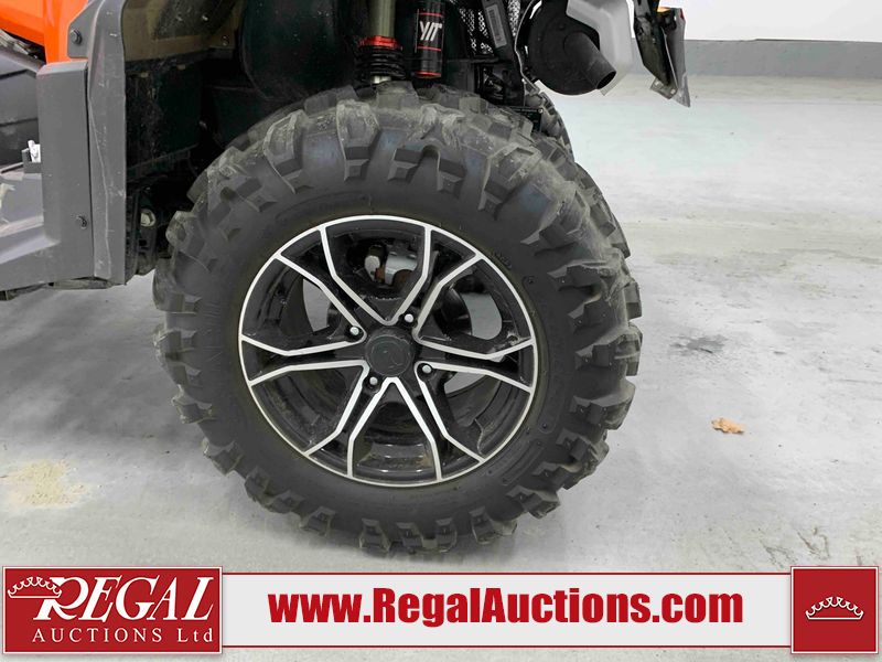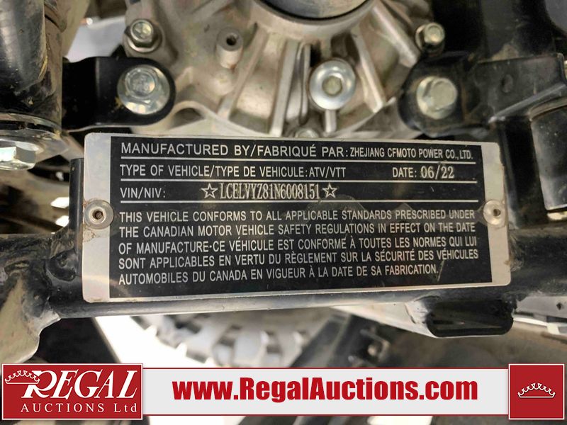 This ATV is a 2022 CFMoto Cforce 800 model. The odometer shows 286 km and 17 engine hours. The seat has scuffs. The crash bar is chipped. All plastics are showing scratches and scuffs. The left front fender is gouged. The rear compartment handle is broken. Some decals are peeling. This unit starts and runs without a boost. This unit is powered by a 800 cc V twin four stroke liquid cooled engine and a automatic transmission with a shaft final drive. The tires are mounted to all rims and appear to be in good enough condition for use. This unit is equipped with a 2WD/4WD selector.