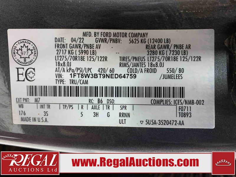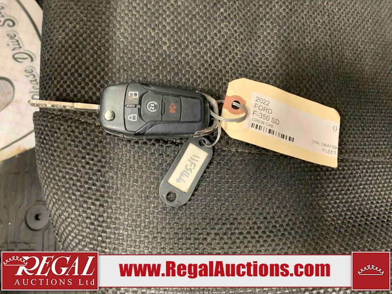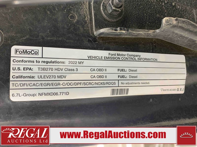 This 2022 FORD F-350 SD XLT CREW CAB is powered by a turbocharged 6.7L V8 diesel engine and an automatic transmission. It is equipped with four-wheel drive. The truck has seats for 6 people. The truck has high mileage for its age. The vehicle has high-value options including power seats, heated seats, and a backup camera. The body looks to be in fair condition overall. The fascia is cracked on the front bumper. There are slight scratches on the front bumper, left rear door, left rear fender, rear bumper, right rear fender, and right rear door. There is slight rust on the front bumper. There are chips on the hood, left front fender, left rear fender, right rear fender, and right front fender. There is minimal dent damage on the tailgate. There are very minor chips in many areas around the body. There are very minor scratches in a few areas around the body. The interior looks to be in good condition overall. The windshield is cracked. All of the tires have lots of tread remaining. This truck is being sold by the fleet department of a corporation or government body. The vehicle will be sold with the following declarations: Fleet Vehicle (See Footnote 1). Footnotes: 1) This vehicle is a commercially owned work vehicle. Regal Auctions Ltd. makes no guarantee or warranty, either express or implied, with respect to the data provided in this report. The information has been provided from the consignor and from sources generally believed to be reliable, however the accuracy of this information cannot be guaranteed by Regal Auctions.