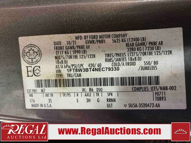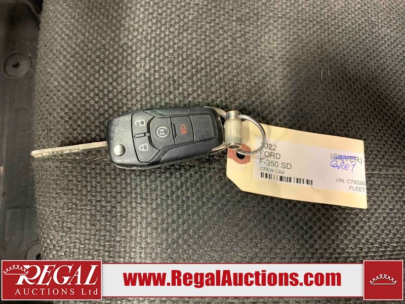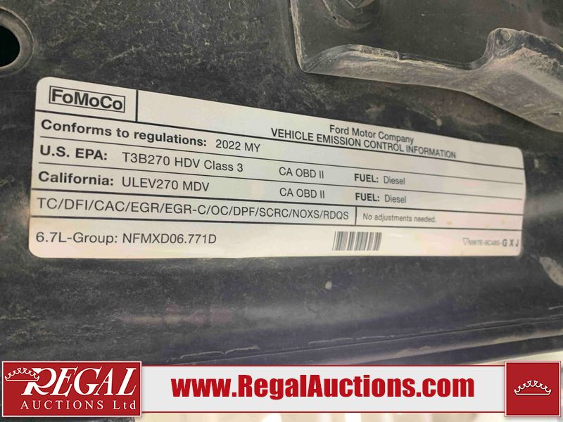 This 2022 FORD F-350 SD XLT CREW CAB is powered by a turbocharged 6.7L V8 diesel engine and an automatic transmission. It is equipped with four-wheel drive. The truck has seats for 6 people. The truck has high mileage for its age. The vehicle has high-value options including power seats and heated seats. The Camera Fault light is on. The body looks to be in fair condition overall. There are minor chips on the front bumper, hood, left rear fender, and right rear fender. There are slight scratches on the left rear door, left rear fender, rear bumper, right rear fender, right rear door, and right front door. There are very minor chips in many areas around the body. There is very minor dent damage on the hood. There are very minor scratches in a few areas around the body. The interior looks to be in good condition overall. The windshield is cracked. All of the tires have lots of tread remaining. This truck is being sold by the fleet department of a corporation or government body. The vehicle will be sold with the following declarations: Fleet Vehicle (See Footnote 1). Footnotes: 1) This vehicle is a commercially owned work vehicle. Regal Auctions Ltd. makes no guarantee or warranty, either express or implied, with respect to the data provided in this report. The information has been provided from the consignor and from sources generally believed to be reliable, however the accuracy of this information cannot be guaranteed by Regal Auctions.