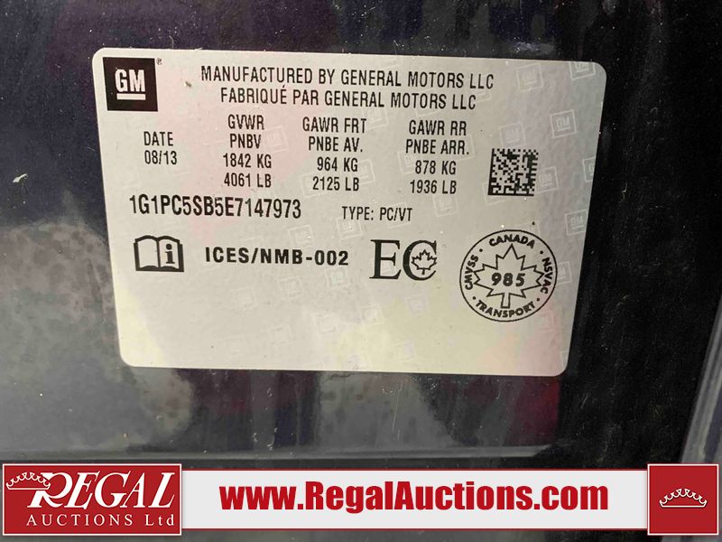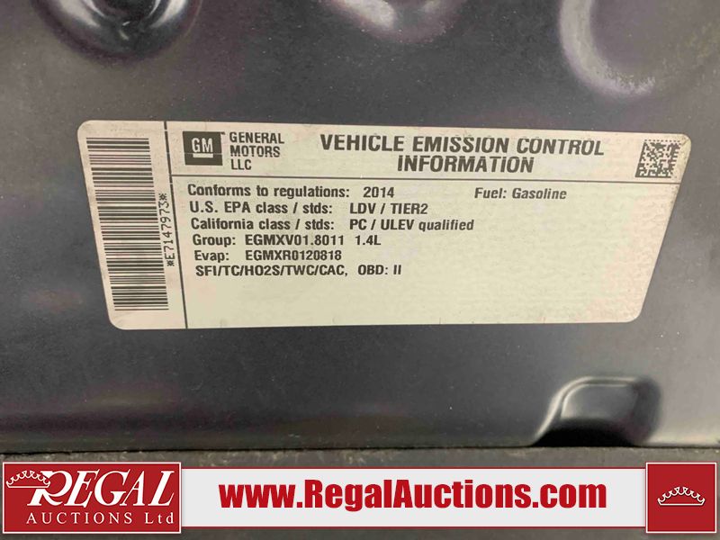 This 2014 CHEVROLET CRUZE 1LT 4D SEDAN FWD is powered by a turbocharged 1.4L 4-cylinder gasoline engine and an automatic transmission. The car has seats for 5 people. The car has low mileage for its age. The body looks to be in rough condition overall. There are pronounced scratches on the hood, roof, left rear door, and trunk lid. There are minor chips on the front bumper, hood, left front fender, right rear door, right front door, and right front fender. There is hail on the hood, roof, and trunk lid. There are scratches on the left front door, rear bumper, right rear door, and right front door. There is incidental dent damage on the left rear door and right rear fender. There are very minor chips in a few areas around the body. There are very minor scratches in a few areas around the body. The interior looks to be in fair condition overall. There are moderate stains on the driver's seat and passenger seat. The rear seats are dirty. The windshield is cracked. The tires are all worn. This car is being sold by the fleet department of a corporation or government body. The vehicle will be sold with the following declarations: Claims Total $1000 - $2999 (See Footnote 1) and Fleet Vehicle (See Footnote 2). Footnotes: 1) The vehicle's total recorded insurance claims history is between $1,000 - $2,999. This is the amount of money that was paid out by an insurance company for repairs to cover claims against the vehicle's insurance policy. This information is provided by CarFax. 2) This vehicle is a commercially owned work vehicle. Regal Auctions Ltd. makes no guarantee or warranty, either express or implied, with respect to the data provided in this report. The information has been provided from the consignor and from sources generally believed to be reliable, however the accuracy of this information cannot be guaranteed by Regal Auctions.