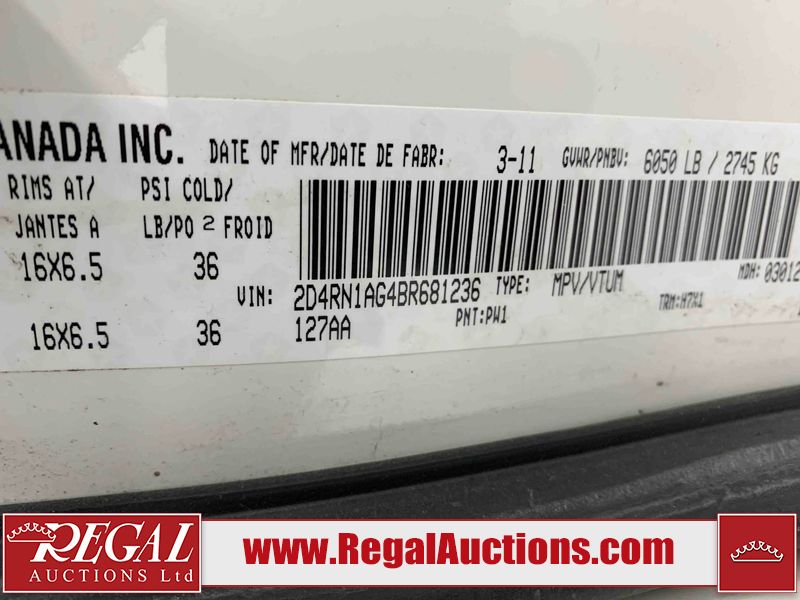 This 2011 DODGE GRAND CARAVAN C/V CARGO VAN is powered by a 3.6L V6 gasoline engine and an automatic transmission. The van has seats for 2 people. The van has low mileage for its age. The body looks to be in rough condition overall. The front bumper is cracked. There is severe rust on the left rear fender. There is considerable dent damage on the rear door. There is pronounced paint peeling on the hood. There is a fair amount of rust on the roof, left front fender, left front door, left rear door, right rear fender, right front door, and right front fender. There are incidental chips on the front bumper, left front fender, and right front fender. There are scratches on the hood, left front fender, left front door, left rear door, left rear fender, rear bumper, right rear fender, right rear door, and right front door. There is dent damage on the right rear door and right front door. The interior looks to be in good condition overall. The windshield is cracked. All of the tires have lots of tread remaining. This van is being sold by the fleet department of a company or government body. The vehicle will be sold with the following declarations: Alberta Government Fleet (See Footnote 1). Footnotes: 1) This vehicle is owned by the Government of Alberta. Regal Auctions Ltd. makes no guarantee or warranty, either express or implied, with respect to the data provided in this report. The information has been provided from the consignor and from sources generally believed to be reliable, however the accuracy of this information cannot be guaranteed by Regal Auctions.