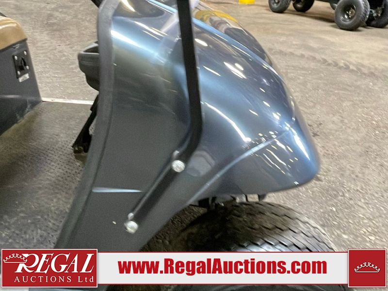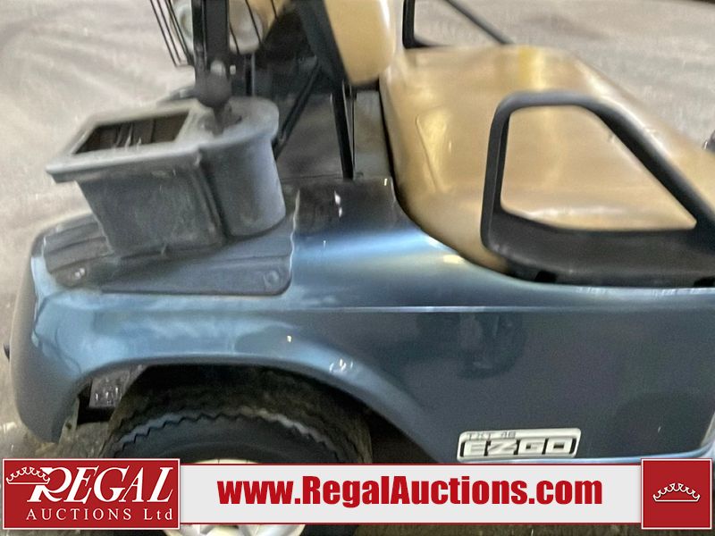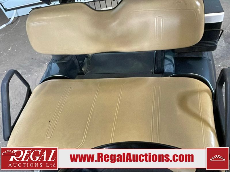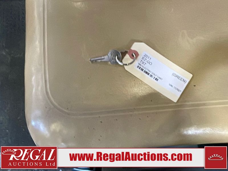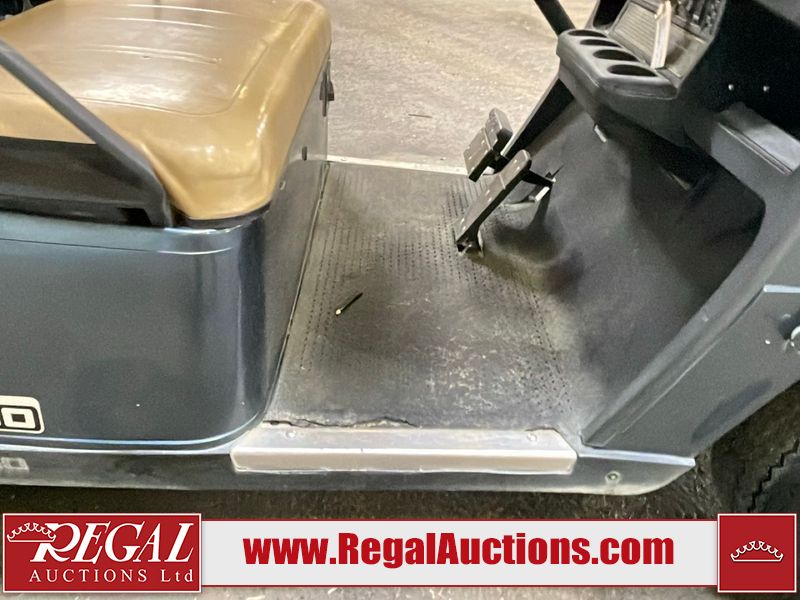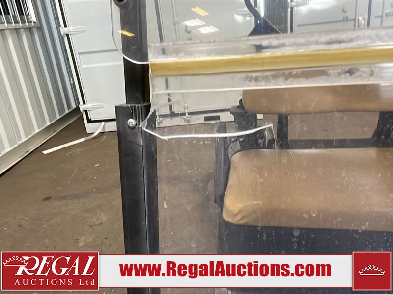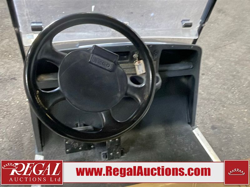 This unit is a 2011 EZ-GO TXTE 48V model club car. Its maximum payload capacity is 800 LBS. The interior is dirty. The leather is fading. The seat has a cigarette burn. Exterior plastics are showing scratches and scuffs. This unit is missing its rear cover. This unit starts and runs. This unit is powered by six 8 Volt batteries. The tires are mounted to steel rims and appear to be in good enough condition for use.