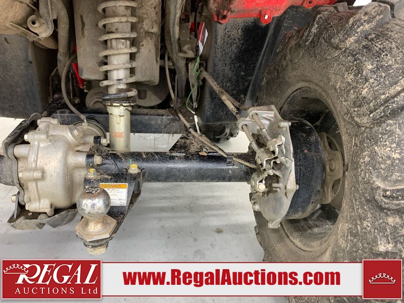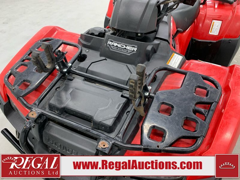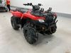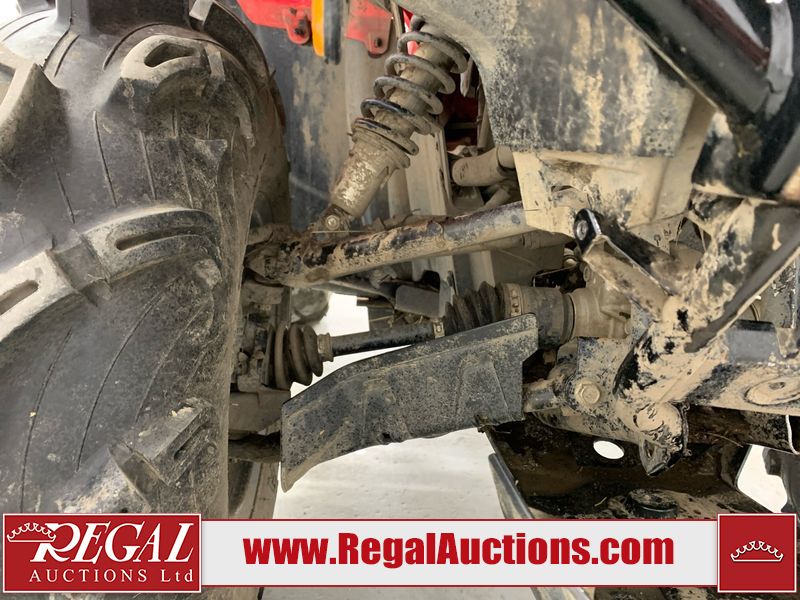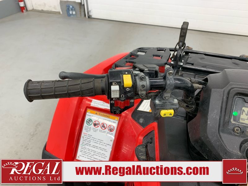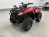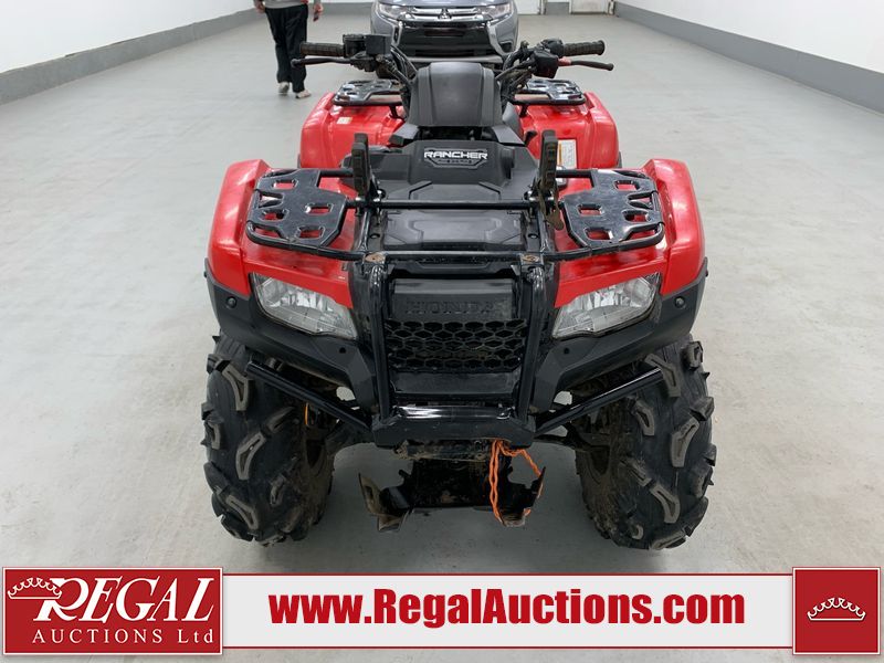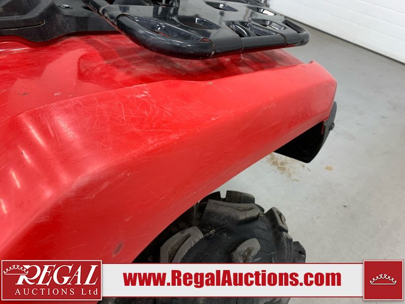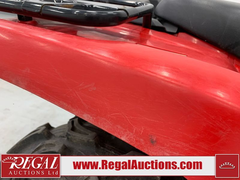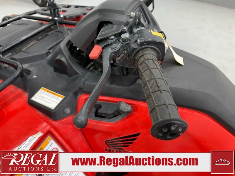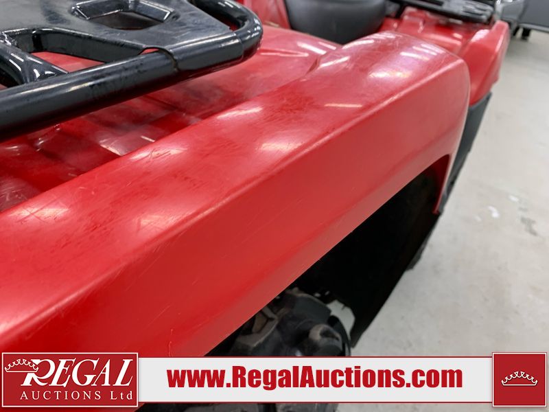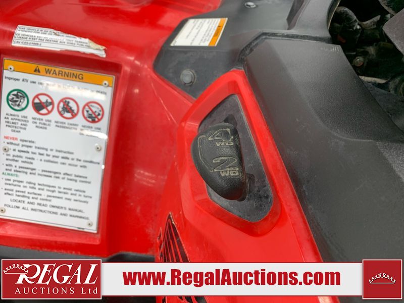 This ATV is a 2021 Honda TRX420FM1 Rancher model. The odometer shows 2,236 km and 219 hours. The operator seat is torn. The front crash bar is loose and missing bolts. The front skid plate is hanging. All plastics are showing scratches and scuffs. Alloy rims are mounted, the tires appear to be in good enough condition for use. The battery is missing. This unit is powered by a 420cc liquid cooled, single cylinder engine and a five speed manual transmission with reverse and a shaft final drive. The front winch is missing. This ATV is equipped with a 4WD/2WD selector knob.
