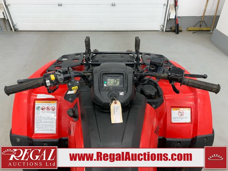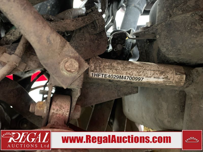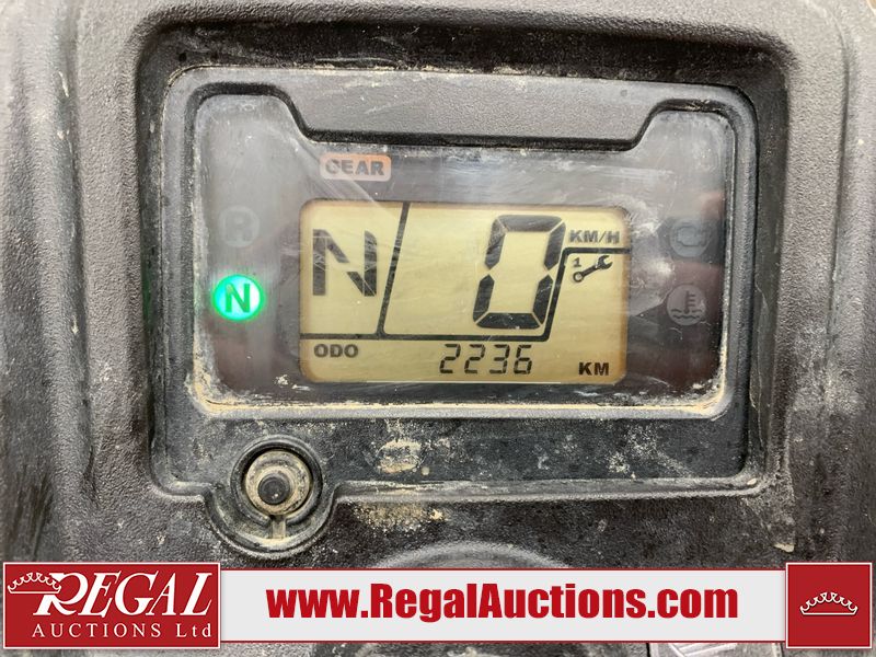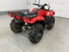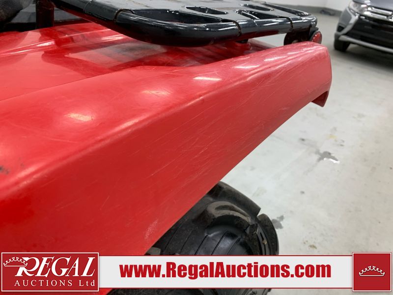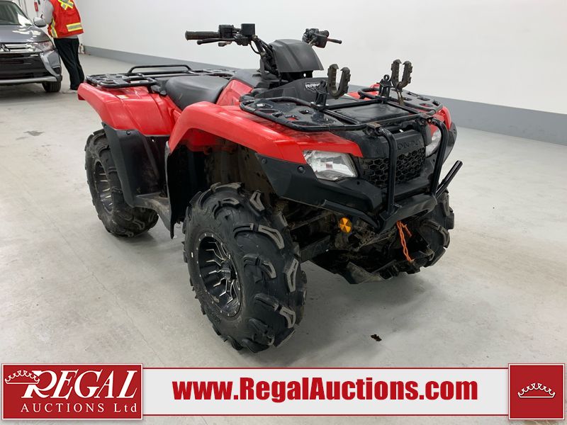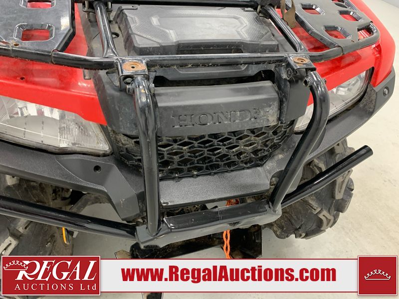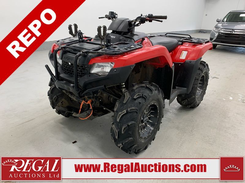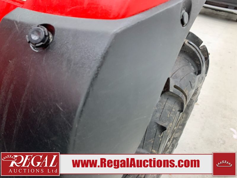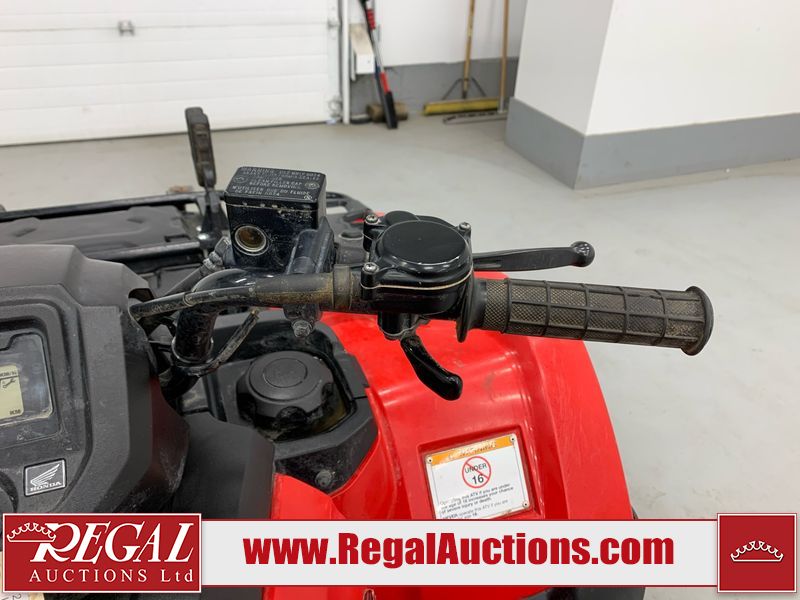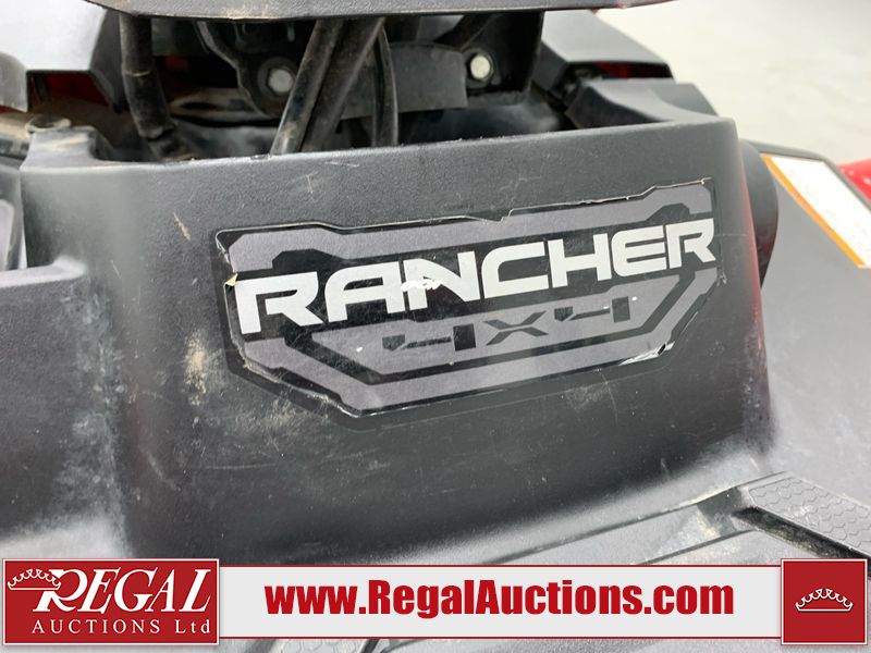 This ATV is a 2021 Honda TRX420FM1 Rancher model. The odometer shows 2,236 km and 219 hours. The operator seat is torn. The front crash bar is loose and missing bolts. The front skid plate is hanging. All plastics are showing scratches and scuffs. Alloy rims are mounted, the tires appear to be in good enough condition for use. The battery is missing. This unit is powered by a 420cc liquid cooled, single cylinder engine and a five speed manual transmission with reverse and a shaft final drive. The front winch is missing. This ATV is equipped with a 4WD/2WD selector knob.