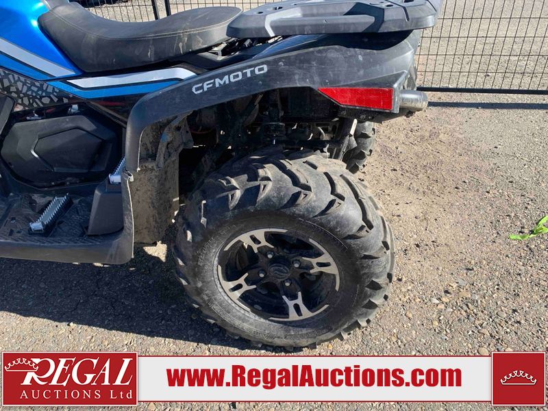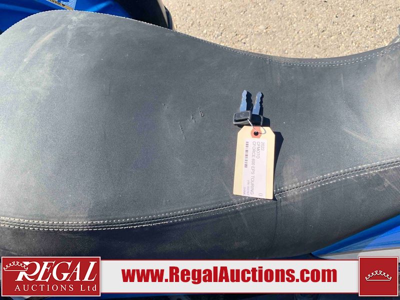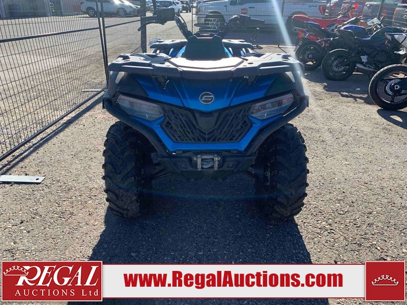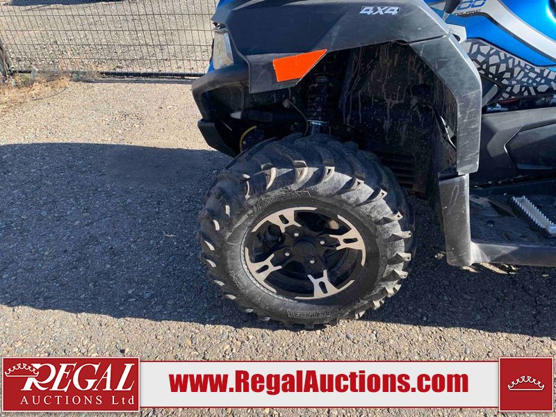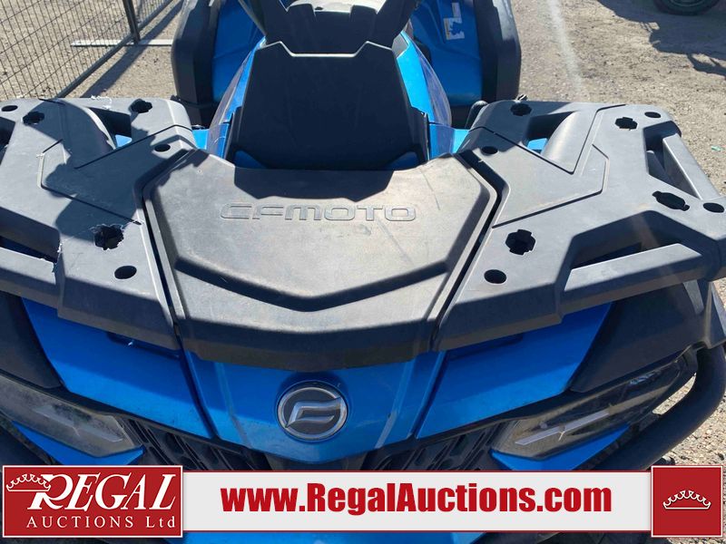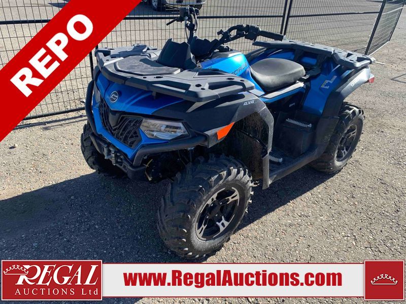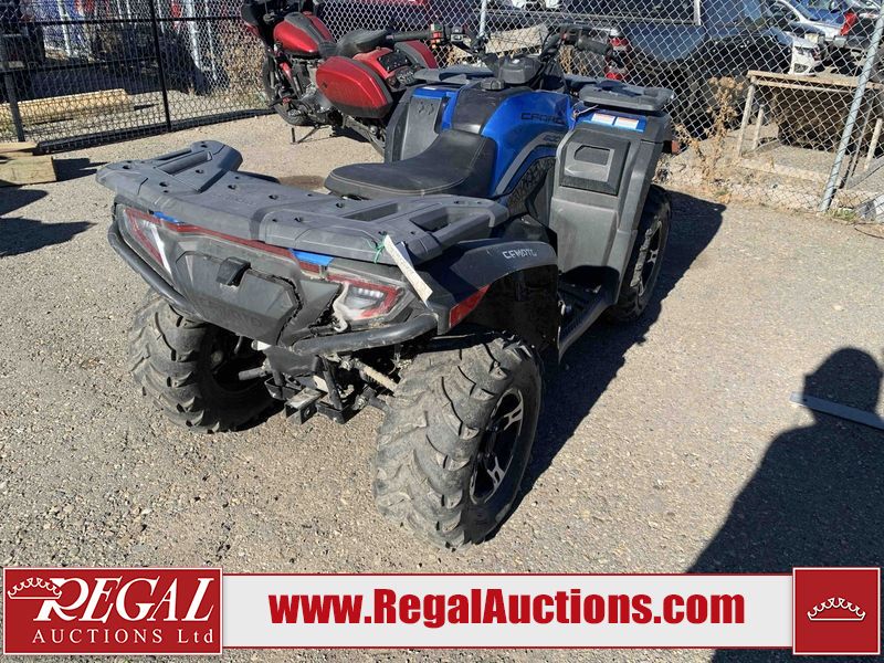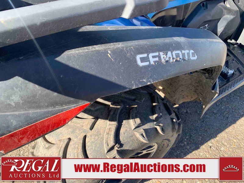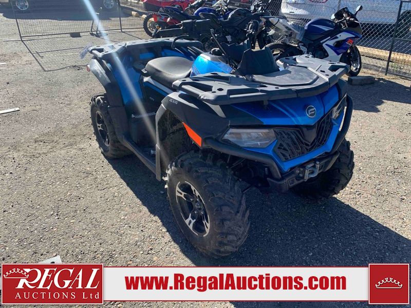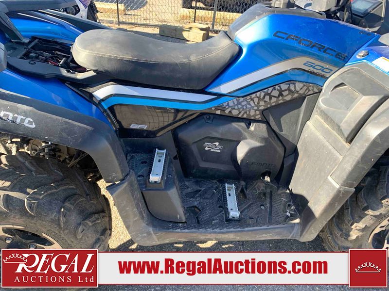 This ATV is a 2022 CF model C force 600 EPS touring model. The odometer cannot be confirmed. The seat is worn. The battery cover is missing. There are scratches and scuffs on all panels. The front crash bar is scuffed. Some decals are peeling. The left centre panel is cracked and misaligned. The rear crash bar is dented and has peeling paint. The rear plastics and write tail light appeared to have fire damage and have melted. The license plate mount is gouged. The right centre plastic is misaligned. This unit does not get power with external power applied. This unit is powered by a 580 cc single cylinder four stroke liquid cooled engine with a continuously variable transmission and shaft final drive. This unit will need to be told through the auction, its engine, transmission, and drive train cannot be confirmed. Diagnostics will need to be performed to determine its exact problems. The tires are mounted to alloy rims and appear to be in good enough condition for use. This unit is equipped with a winch, and a 2WD/4WD selector.