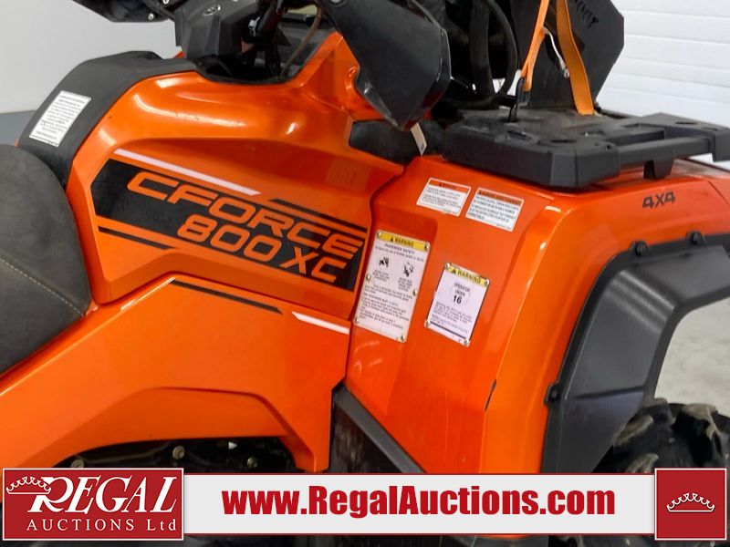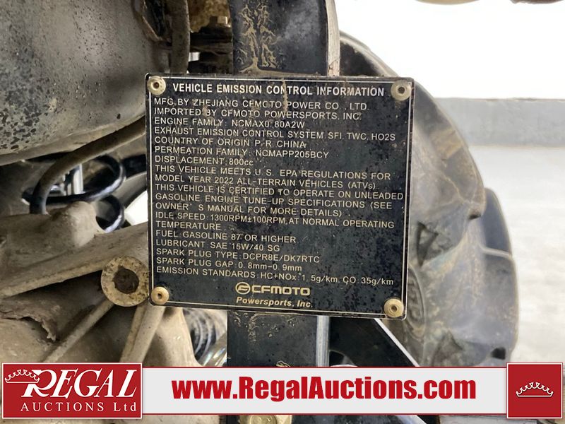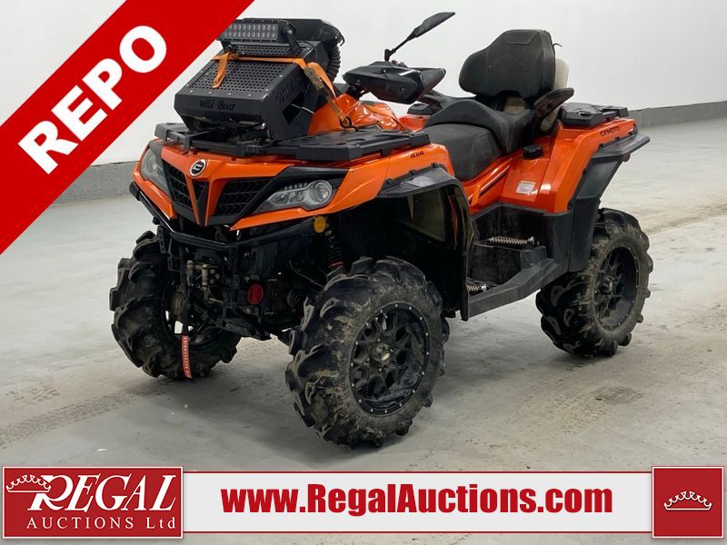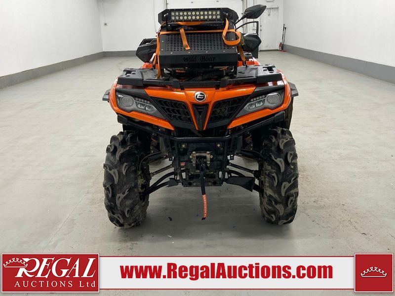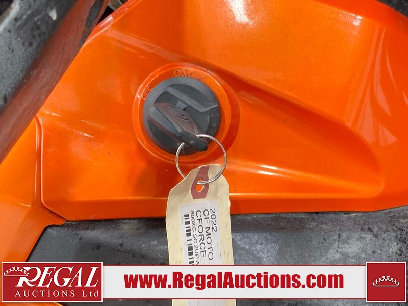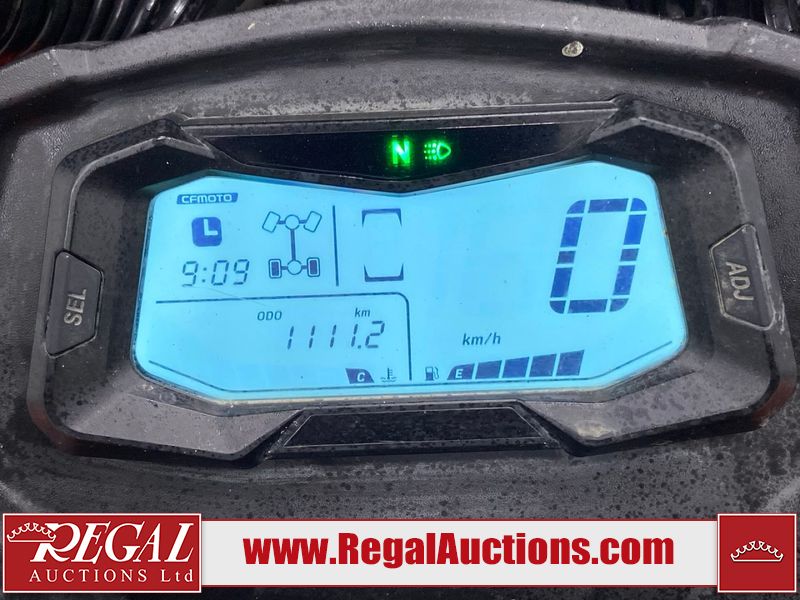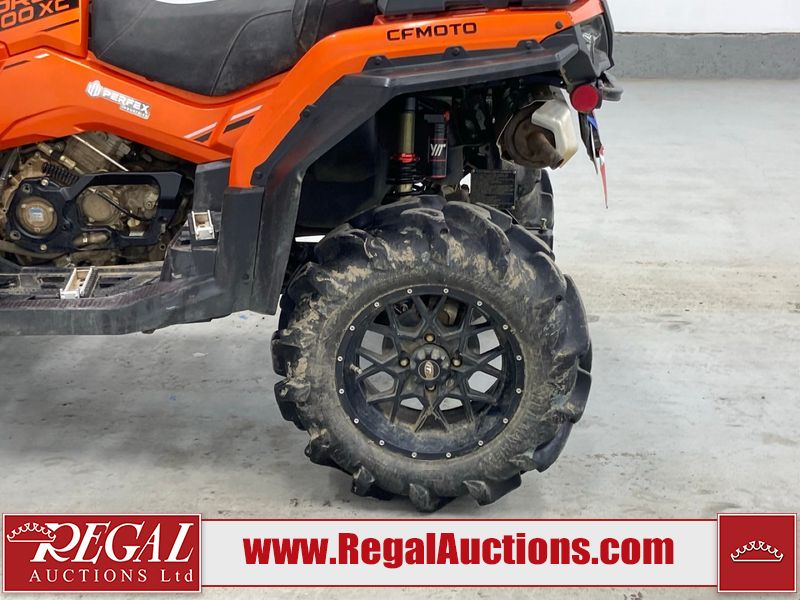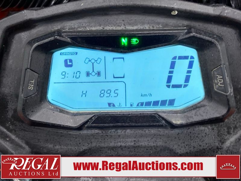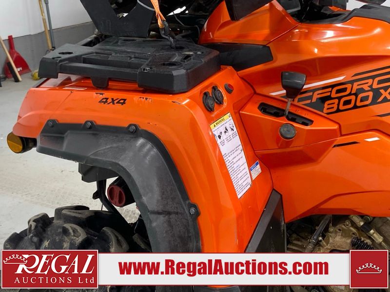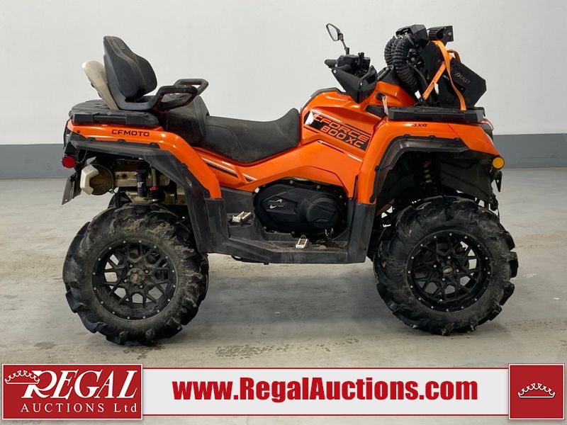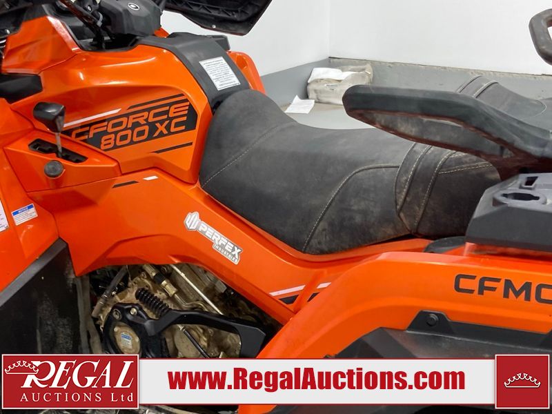 This ATV is a 2022 CF MOTO CFORCE 800XC EPS LX. The odometer reads 1111kms and 89.5 engine hours. The right side mirror is missing. The front and rear plastics and showing scuffs and scratches. This unit starts and runs without a boost. The transmission does not engage in reverse. It is powered by a 800 cc two cylinder four stroke engine with a continuously variable transmission with a shaft final drive. The tires appear to be in good condition for use. It is equipped with 4WD/2WD selector winch and hitch receiver.