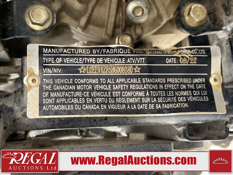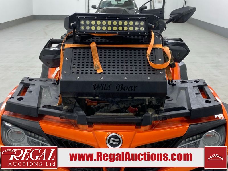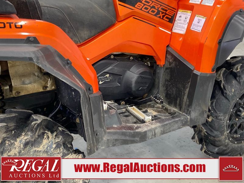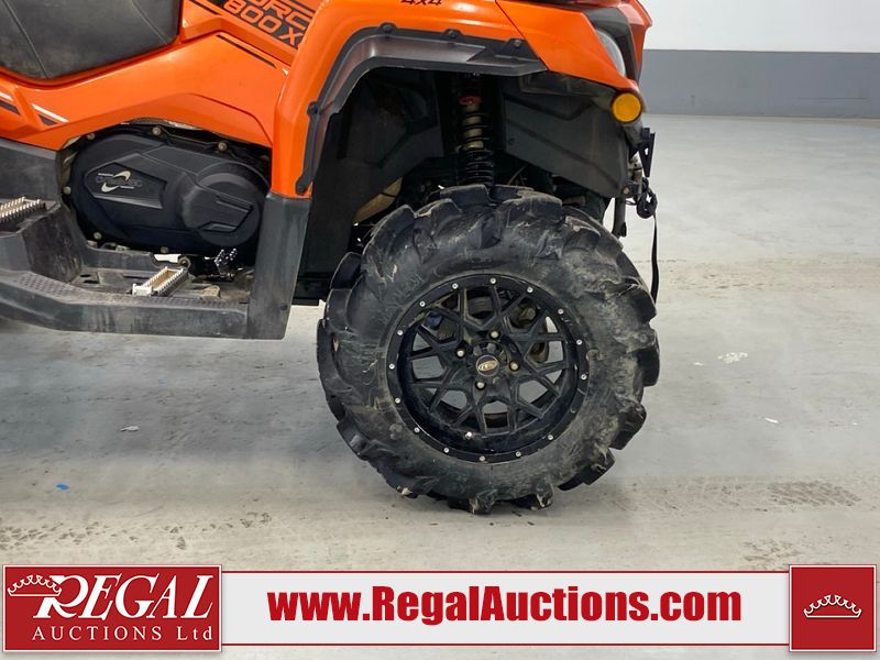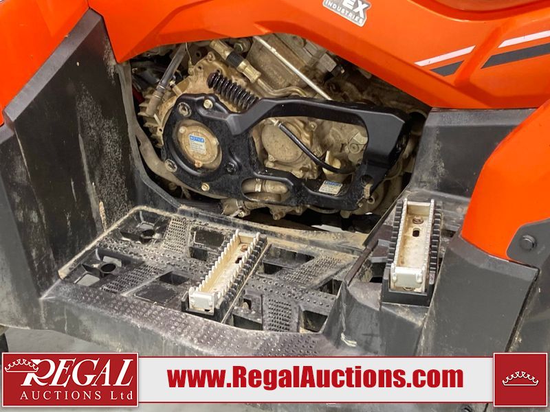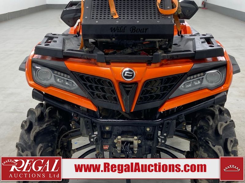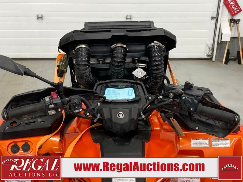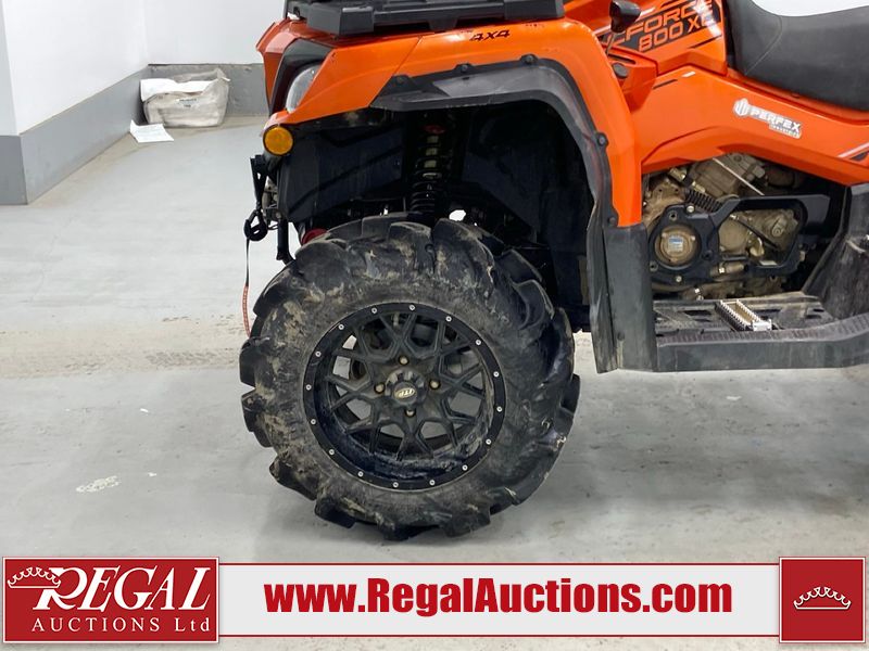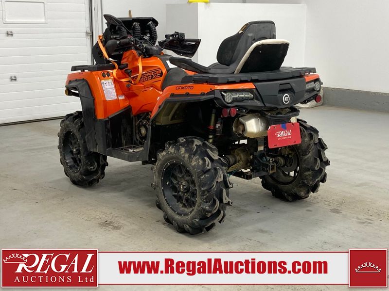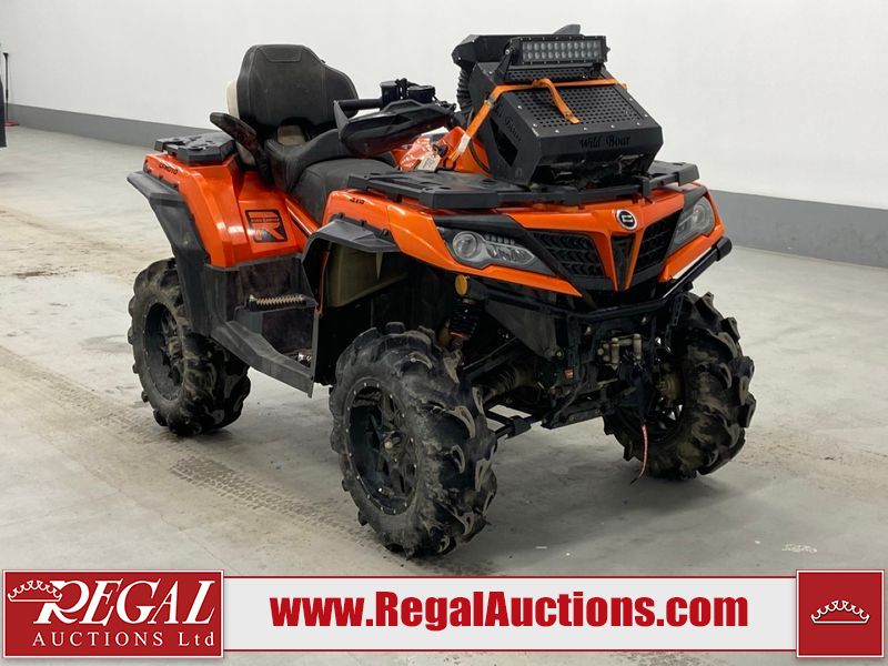 This ATV is a 2022 CF MOTO CFORCE 800XC EPS LX. The odometer reads 1111kms and 89.5 engine hours. The right side mirror is missing. The front and rear plastics and showing scuffs and scratches. This unit starts and runs without a boost. The transmission does not engage in reverse. It is powered by a 800 cc two cylinder four stroke engine with a continuously variable transmission with a shaft final drive. The tires appear to be in good condition for use. It is equipped with 4WD/2WD selector winch and hitch receiver.
