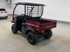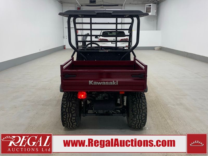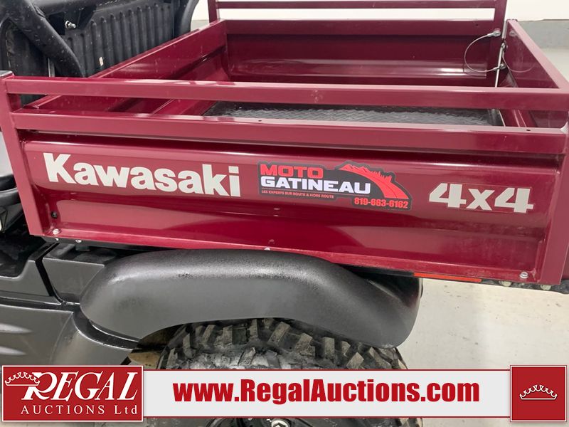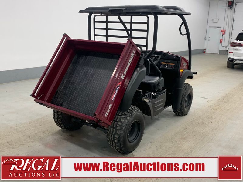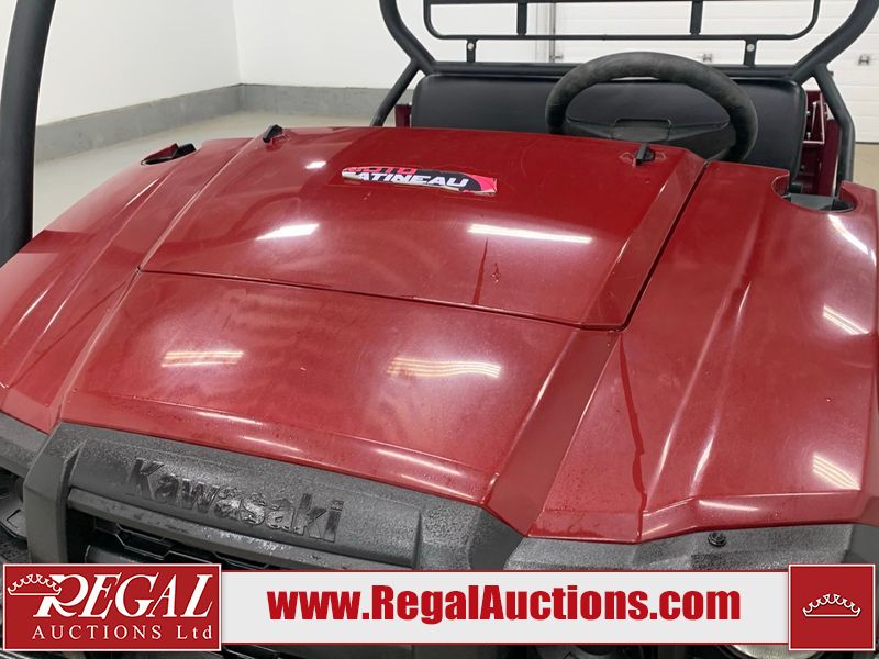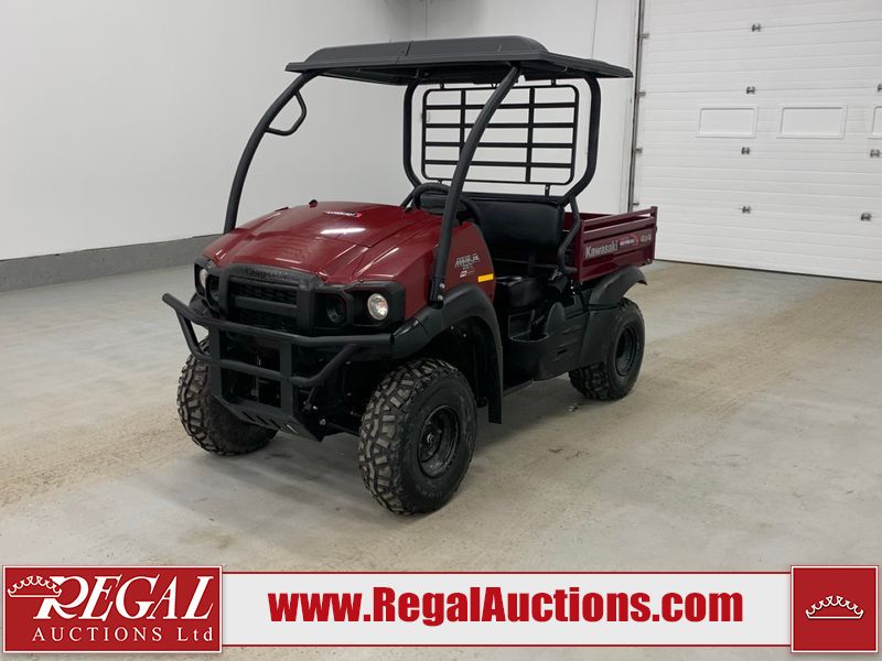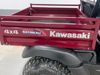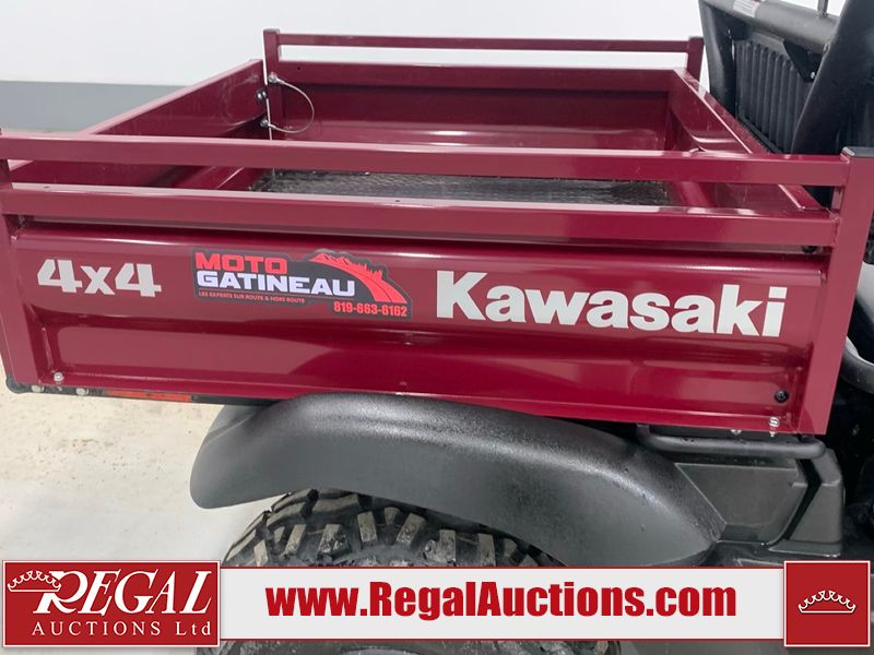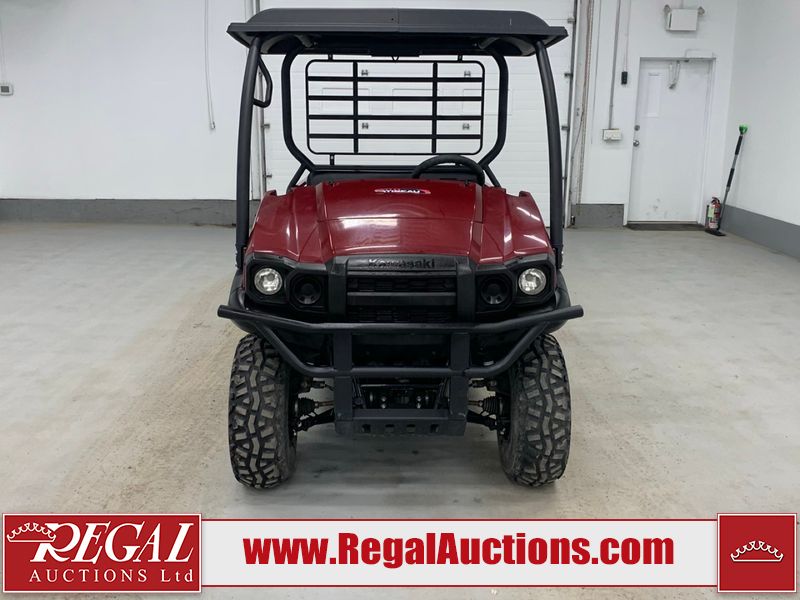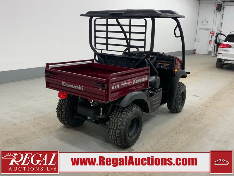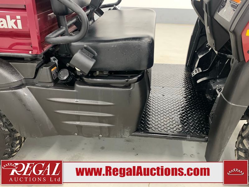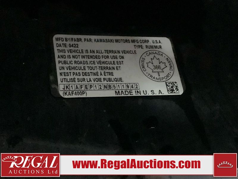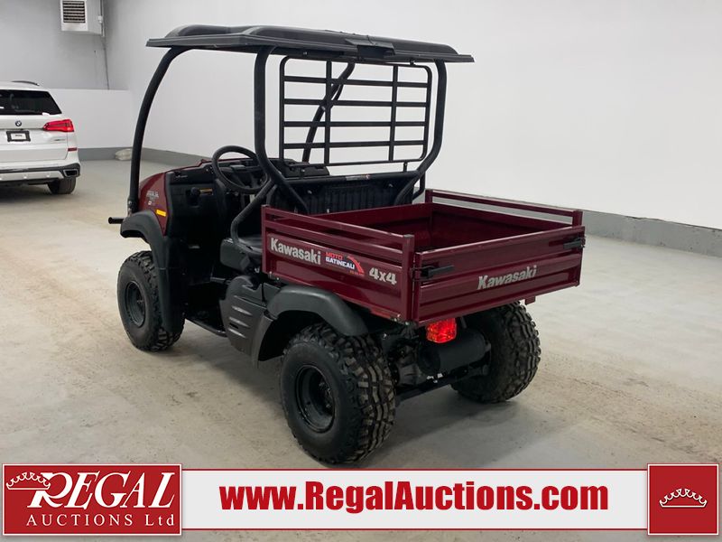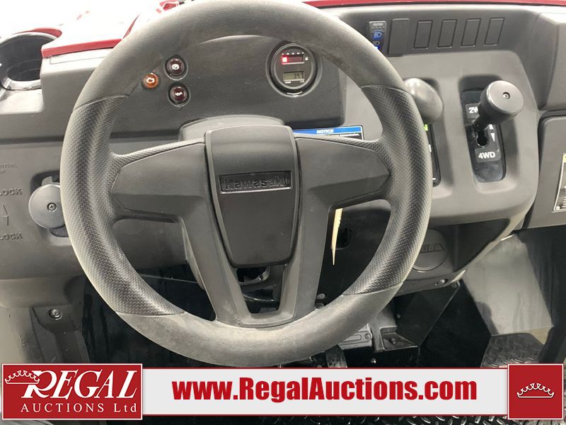 This ATV is a 2022 Kawasaki KF400P model side-by-side. The engine hours show 39 hours. The interior is clean. The leather is cracking in some areas of the seat. The crash bar is scratched. Some plastics are scuffed. Some decals are peeling. This unit starts and runs without a boost. This unit is powered by a 401cc single cylinder, four stroke Air cooled engine and a continuously variable transmission with a shaft final drive. The tires are mounted to alloy rims and appear to be in good enough condition for use. This unit is equipped with a differential lock, and a 2WD/4WD selector.