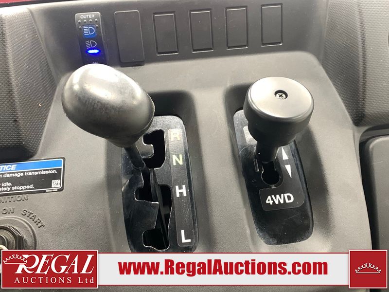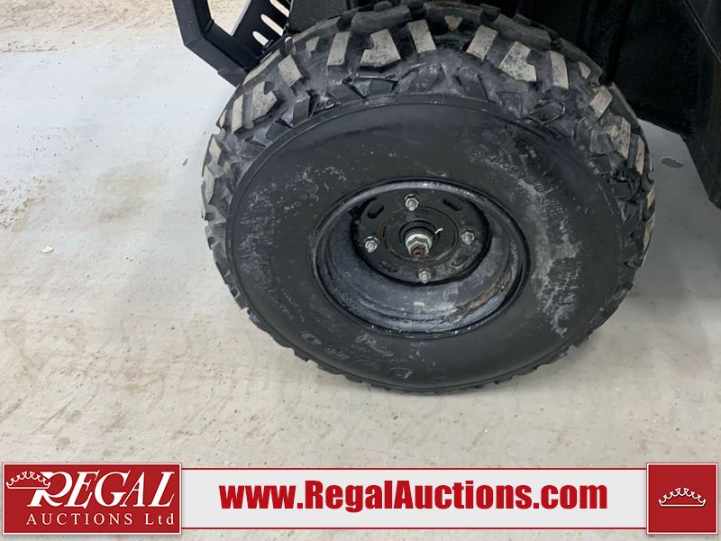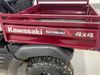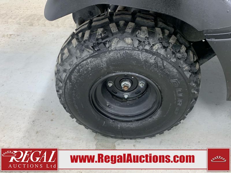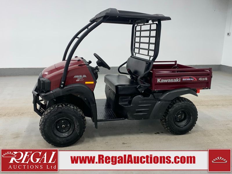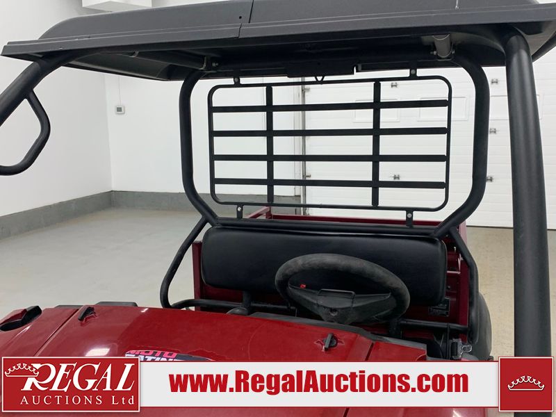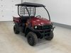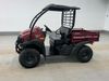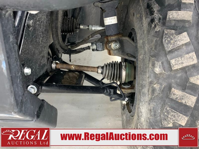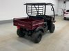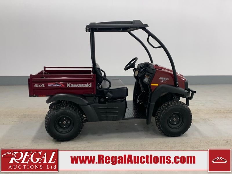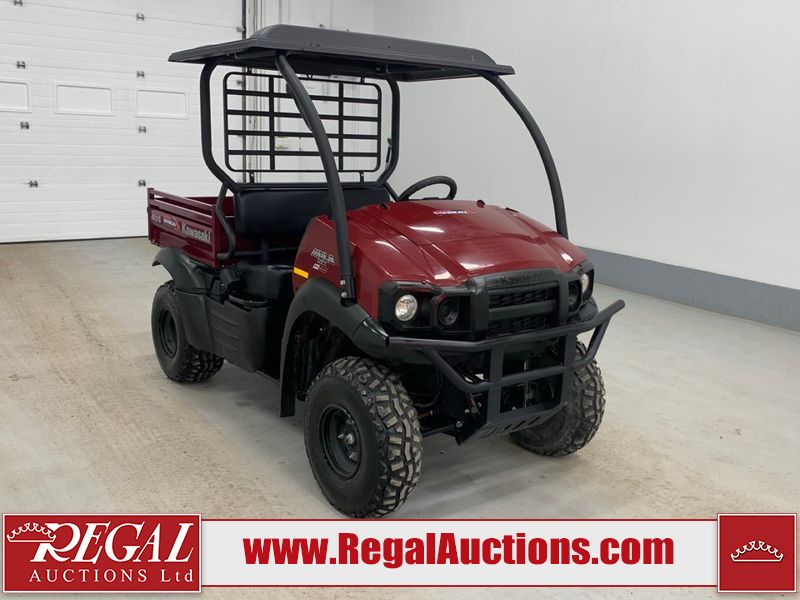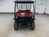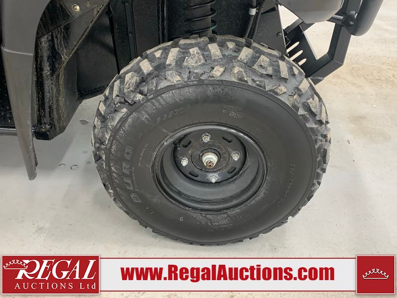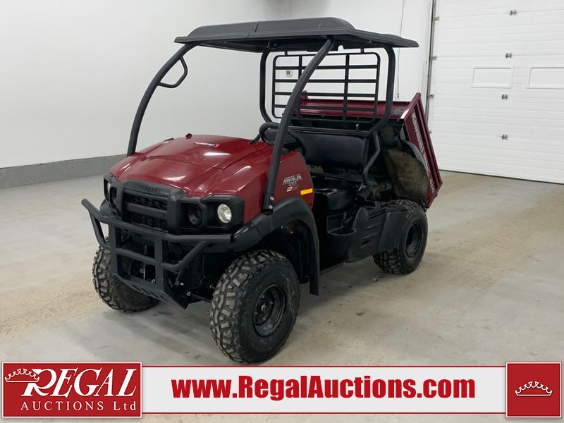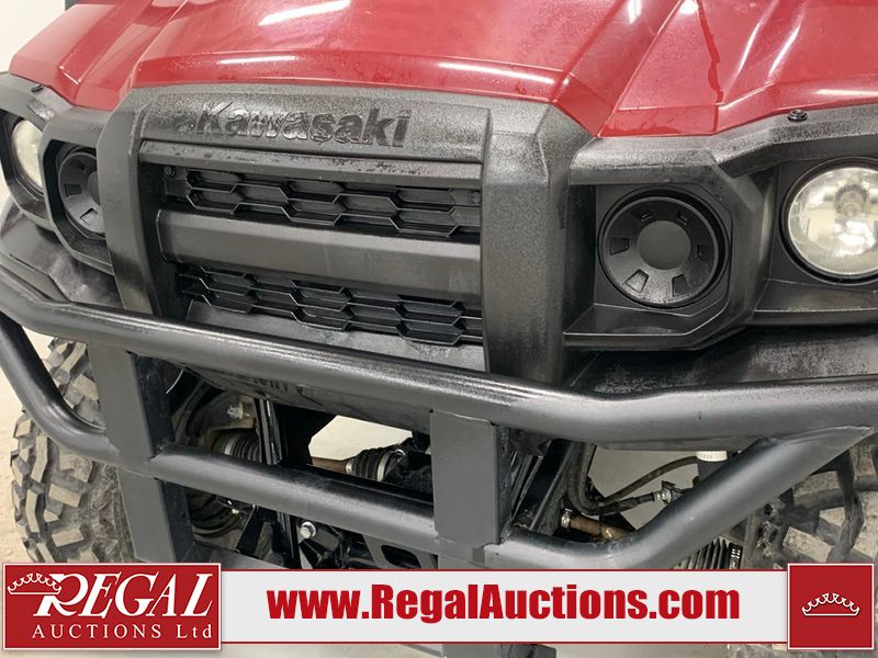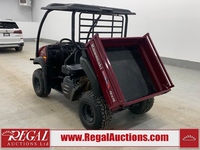 This ATV is a 2022 Kawasaki KF400P model side-by-side. The engine hours show 39 hours. The interior is clean. The leather is cracking in some areas of the seat. The crash bar is scratched. Some plastics are scuffed. Some decals are peeling. This unit starts and runs without a boost. This unit is powered by a 401cc single cylinder, four stroke Air cooled engine and a continuously variable transmission with a shaft final drive. The tires are mounted to alloy rims and appear to be in good enough condition for use. This unit is equipped with a differential lock, and a 2WD/4WD selector.