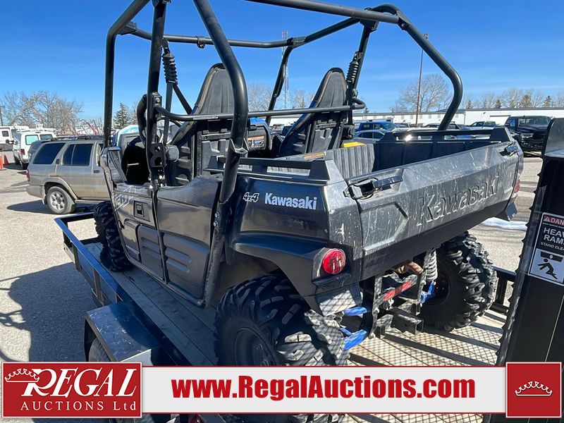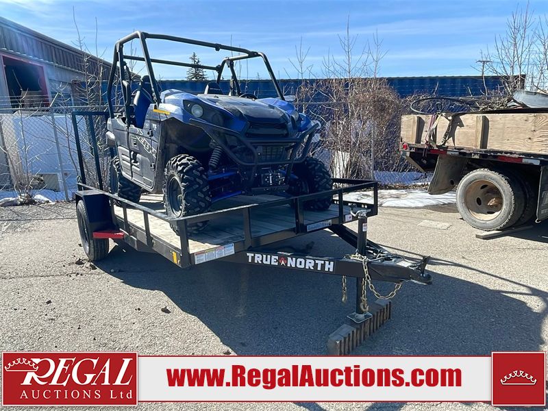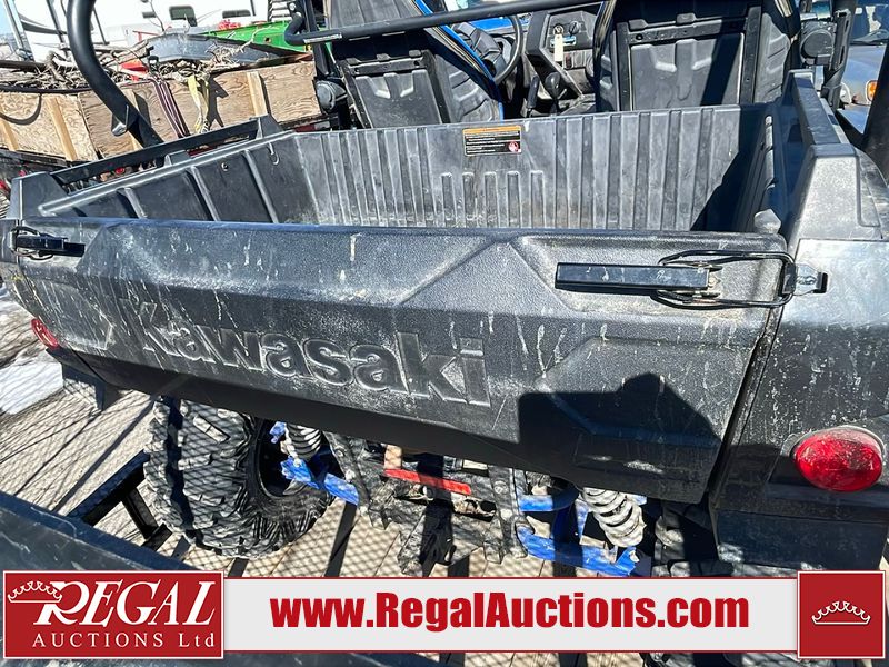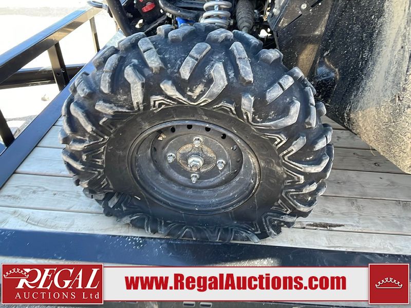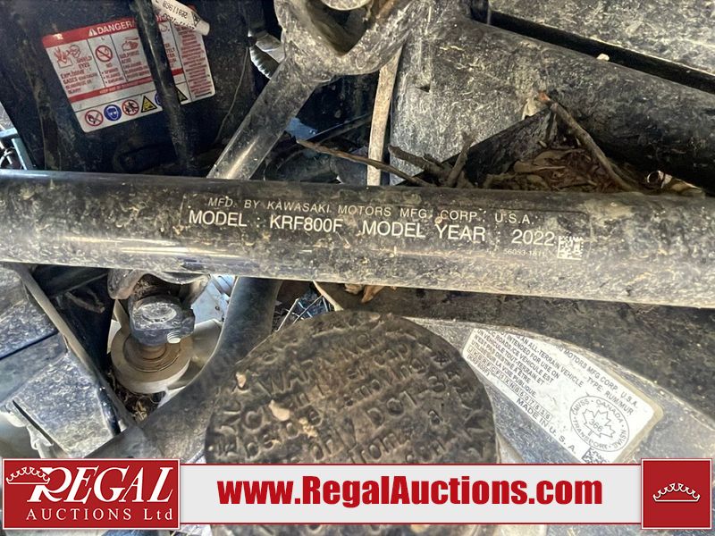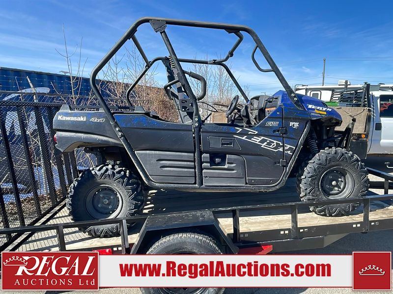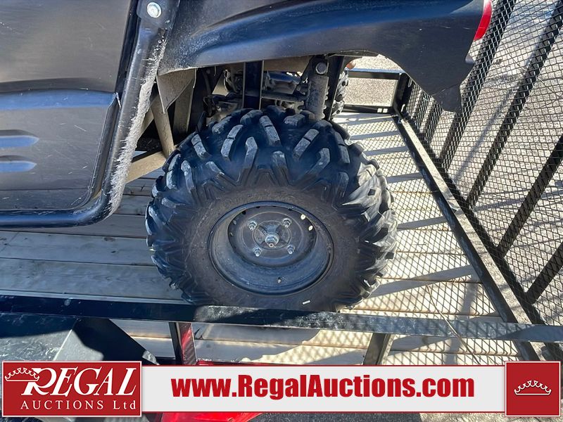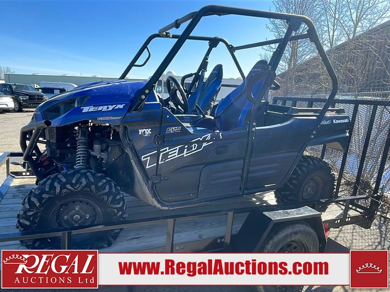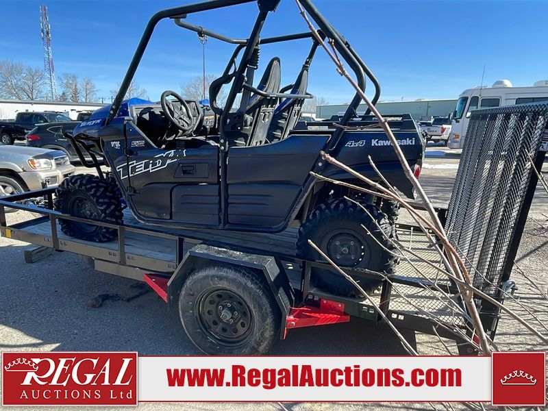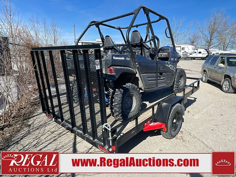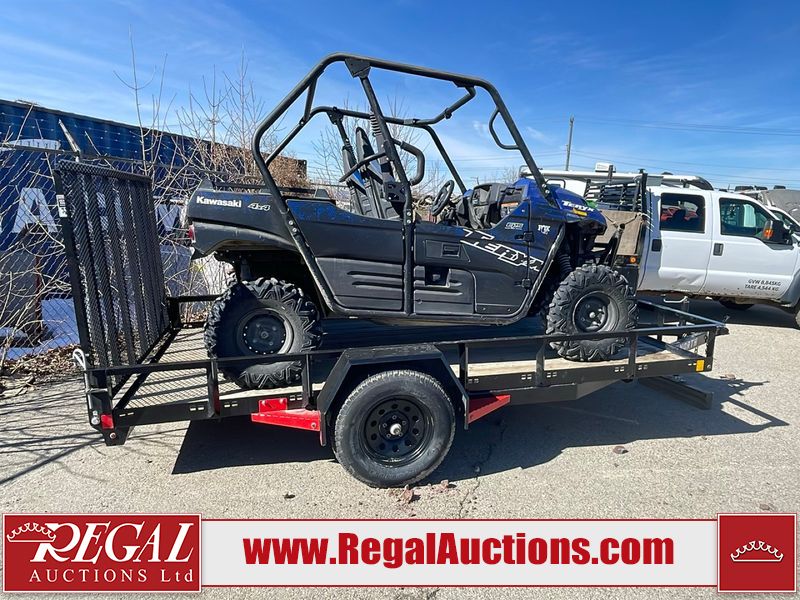 This UTV is a 2022 Kawasaki Terex KRF800F EPS model side-by-side. The odometer shows 4588km and 300 engine hours. This unit comes mounted on a 2024 12 foot PJ trailers model TNU721231DSFK single axle flatbed trailer. The interior is dirty and will require a detail. The front right fender is misaligned. The roof is missing. Some plastics are showing scratches and scuffs. Some decals are peeling. This unit starts and runs. The left front tire is off the rim. It's driveline is unknown. This unit is powered by 783cc V-twin liquid cooled two cylinder, four stroke engine and a continuously variable transmission with a shaft final drive. The rest of the tires appear to be in good enough condition for use. The trailer is showing minor chips, scratches, and scuffs. The right side of the frame is showing minor surface rust. This unit is equipped with leaf spring suspension. The tires are mounted to alloy rims and appeared to be a good enough condition for use. The ATV is equipped with a front winch system, and a 2WD/4WD selector. The trailer is equipped with a single full down wrap.