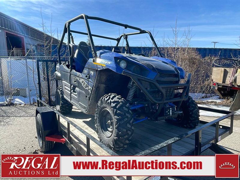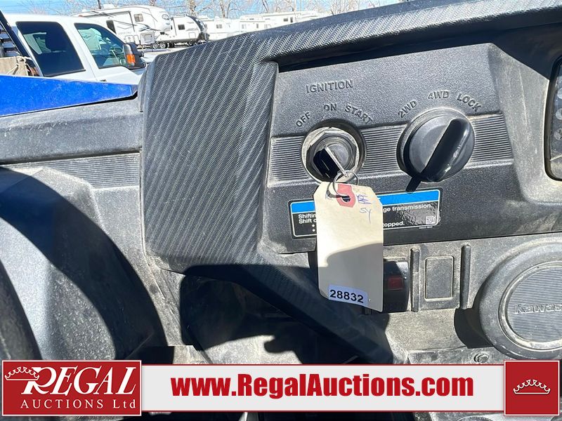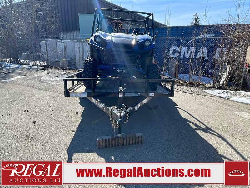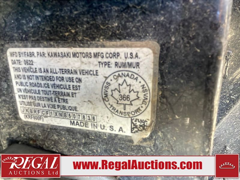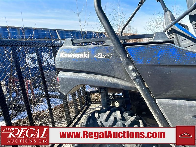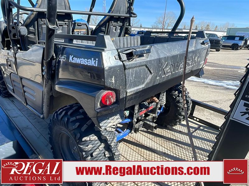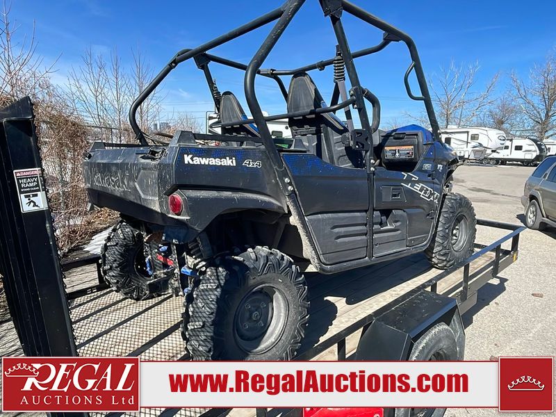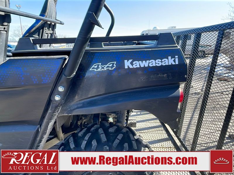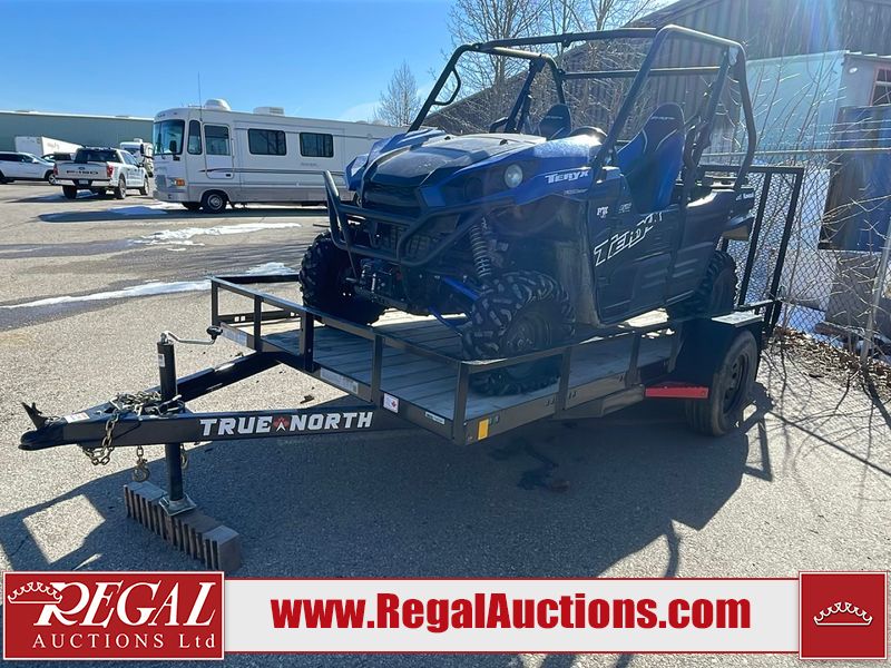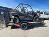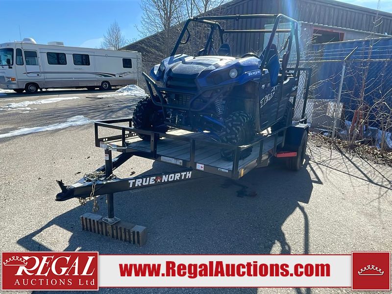This UTV is a 2022 Kawasaki Terex KRF800F EPS model side-by-side. The odometer shows 4588km and 300 engine hours. This unit comes mounted on a 2024 12 foot PJ trailers model TNU721231DSFK single axle flatbed trailer. The interior is dirty and will require a detail. The front right fender is misaligned. The roof is missing. Some plastics are showing scratches and scuffs. Some decals are peeling. This unit starts and runs. The left front tire is off the rim. It's driveline is unknown. This unit is powered by 783cc V-twin liquid cooled two cylinder, four stroke engine and a continuously variable transmission with a shaft final drive. The rest of the tires appear to be in good enough condition for use. The trailer is showing minor chips, scratches, and scuffs. The right side of the frame is showing minor surface rust. This unit is equipped with leaf spring suspension. The tires are mounted to alloy rims and appeared to be a good enough condition for use. The ATV is equipped with a front winch system, and a 2WD/4WD selector. The trailer is equipped with a single full down wrap.