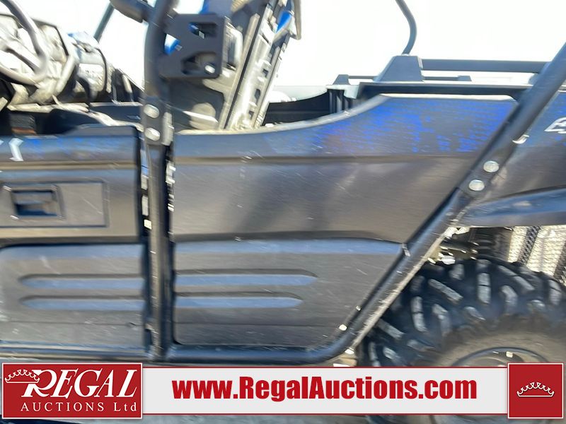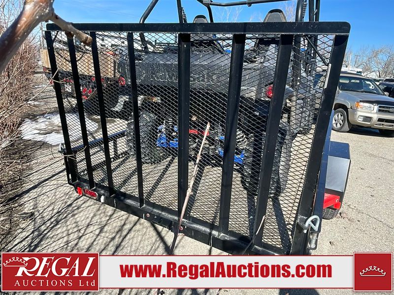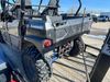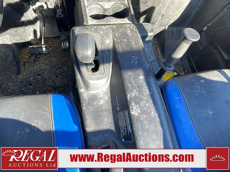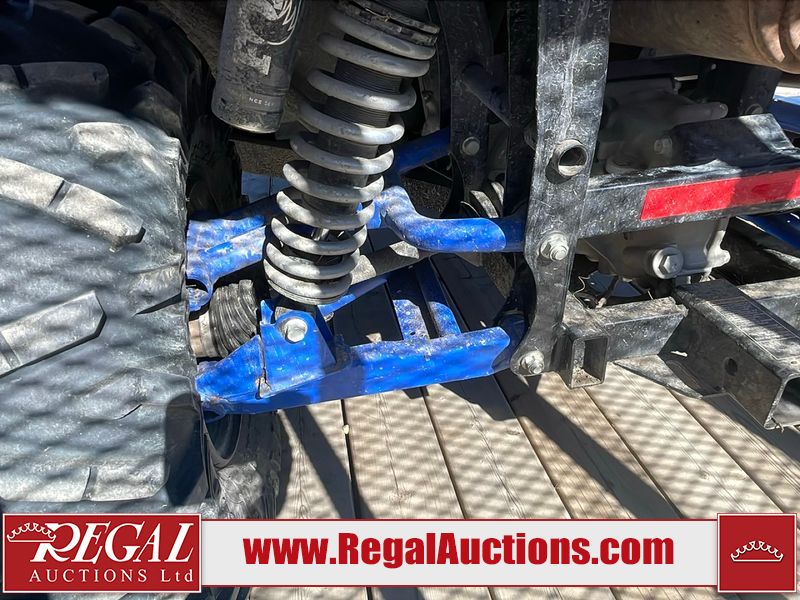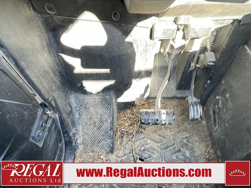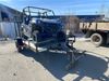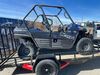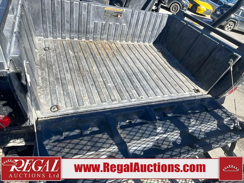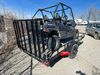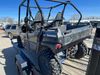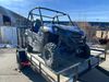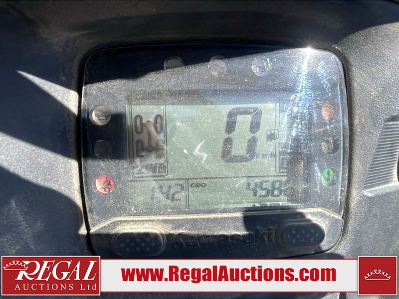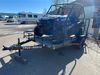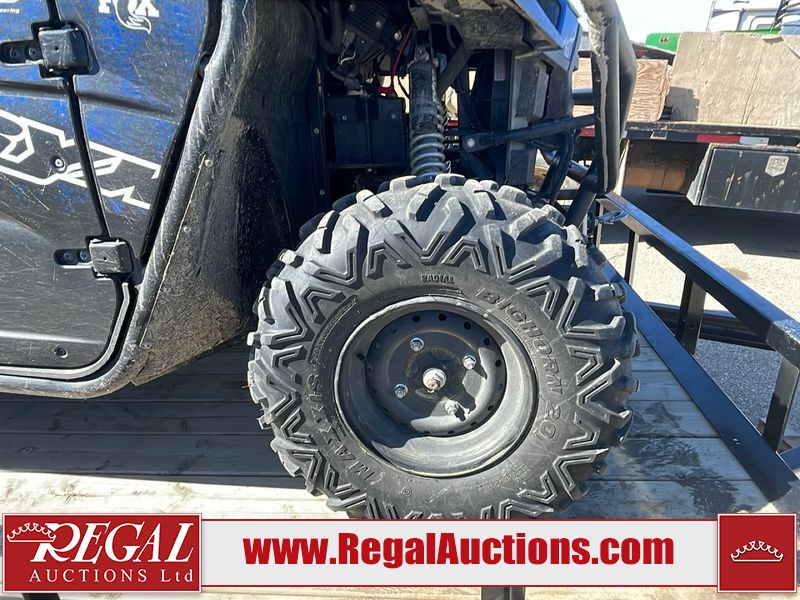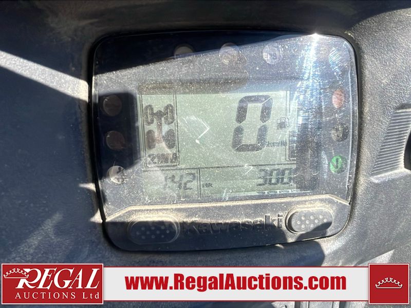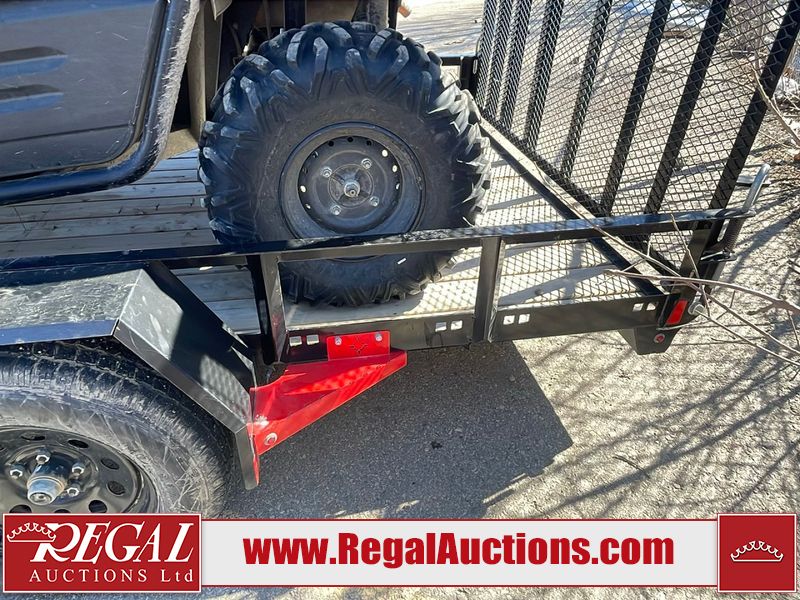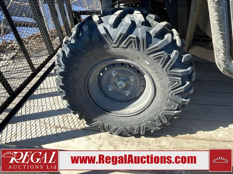 This UTV is a 2022 Kawasaki Terex KRF800F EPS model side-by-side. The odometer shows 4588km and 300 engine hours. This unit comes mounted on a 2024 12 foot PJ trailers model TNU721231DSFK single axle flatbed trailer. The interior is dirty and will require a detail. The front right fender is misaligned. The roof is missing. Some plastics are showing scratches and scuffs. Some decals are peeling. This unit starts and runs. The left front tire is off the rim. It's driveline is unknown. This unit is powered by 783cc V-twin liquid cooled two cylinder, four stroke engine and a continuously variable transmission with a shaft final drive. The rest of the tires appear to be in good enough condition for use. The trailer is showing minor chips, scratches, and scuffs. The right side of the frame is showing minor surface rust. This unit is equipped with leaf spring suspension. The tires are mounted to alloy rims and appeared to be a good enough condition for use. The ATV is equipped with a front winch system, and a 2WD/4WD selector. The trailer is equipped with a single full down wrap.