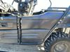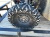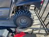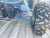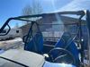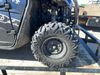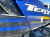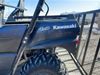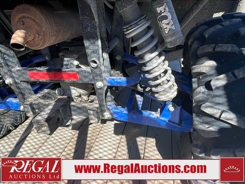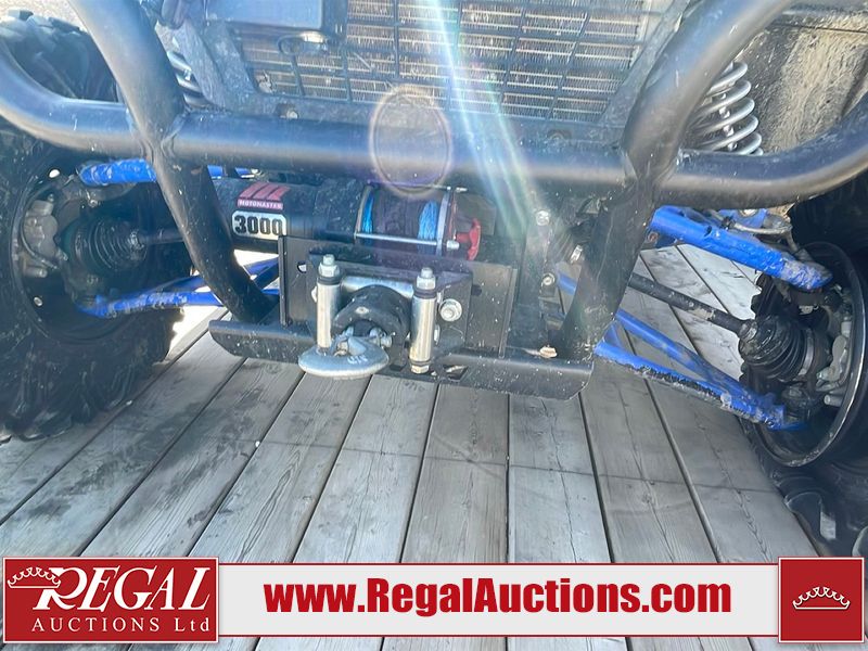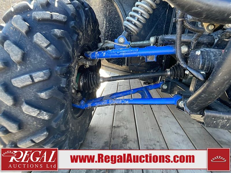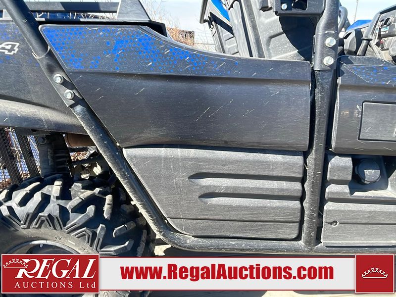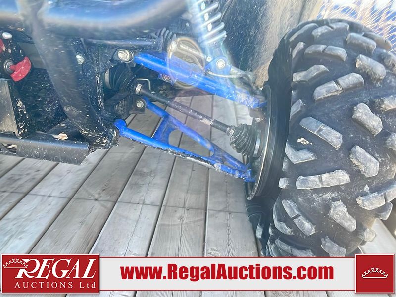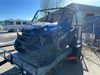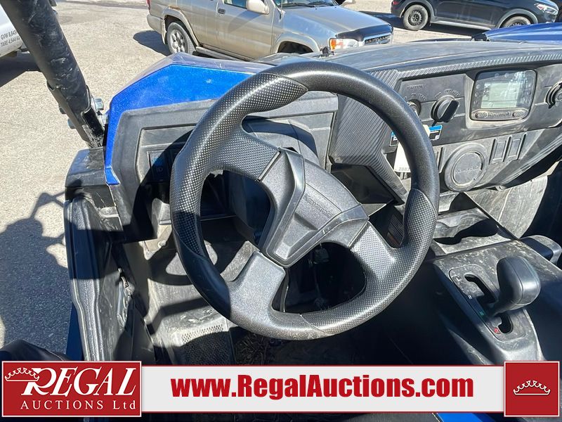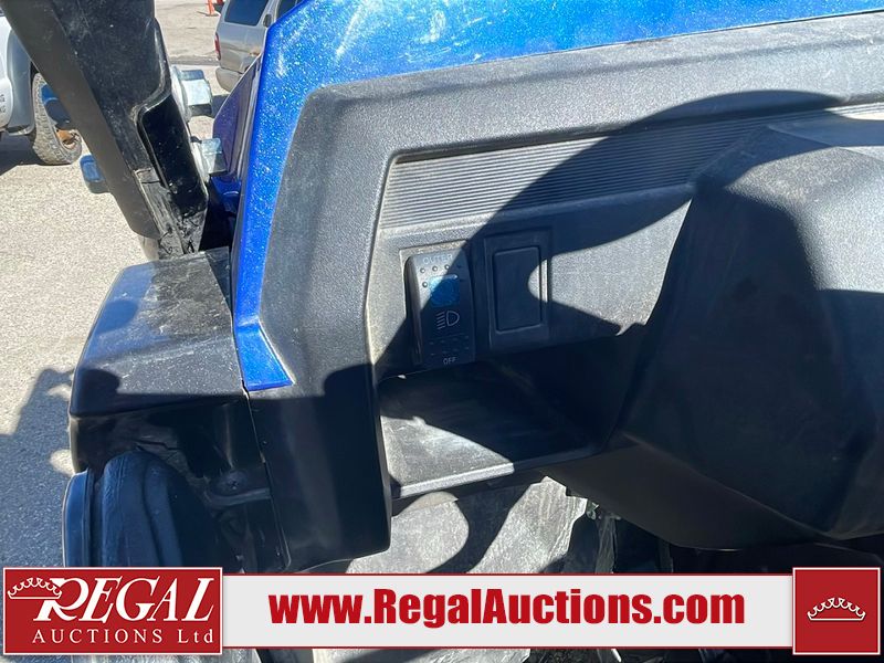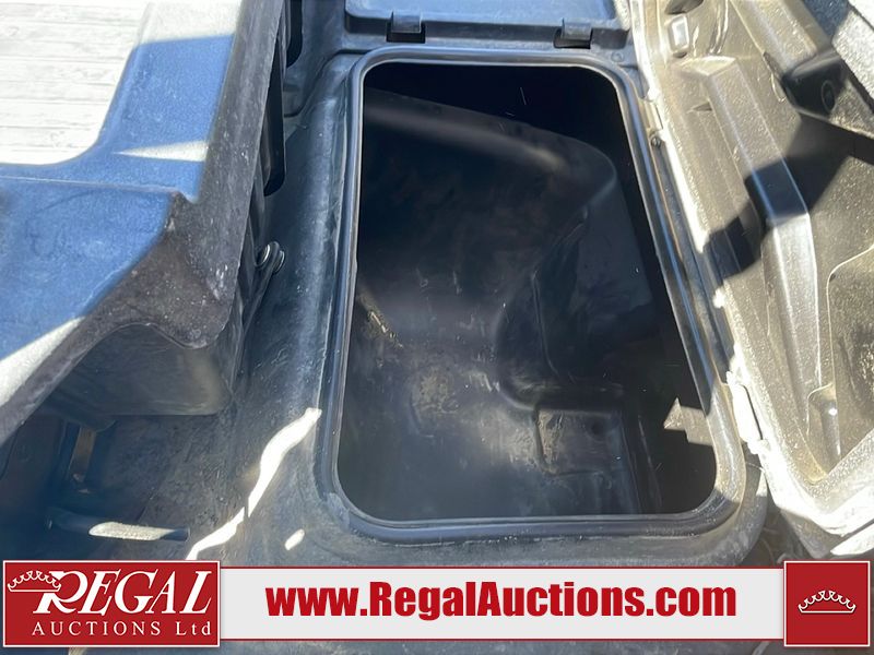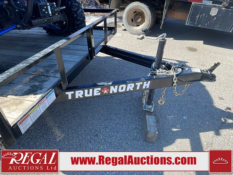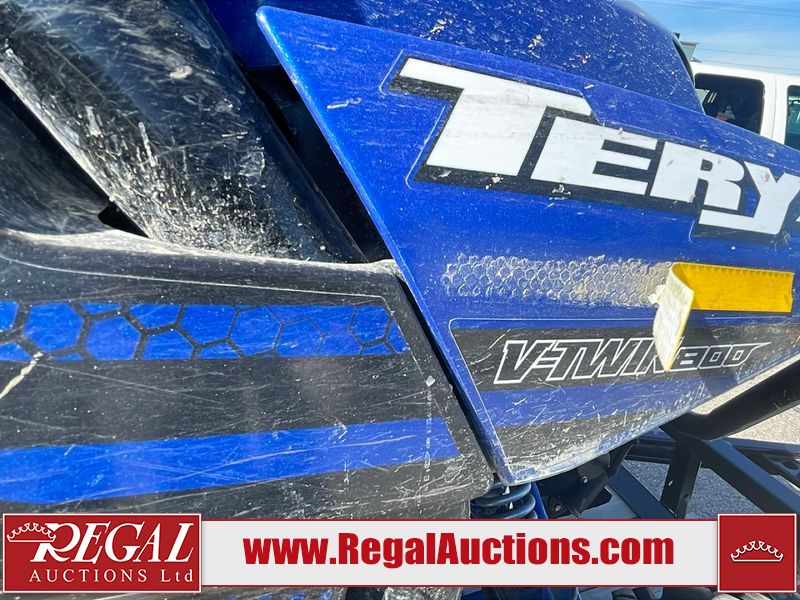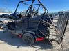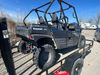 This UTV is a 2022 Kawasaki Terex KRF800F EPS model side-by-side. The odometer shows 4588km and 300 engine hours. This unit comes mounted on a 2024 12 foot PJ trailers model TNU721231DSFK single axle flatbed trailer. The interior is dirty and will require a detail. The front right fender is misaligned. The roof is missing. Some plastics are showing scratches and scuffs. Some decals are peeling. This unit starts and runs. The left front tire is off the rim. It's driveline is unknown. This unit is powered by 783cc V-twin liquid cooled two cylinder, four stroke engine and a continuously variable transmission with a shaft final drive. The rest of the tires appear to be in good enough condition for use. The trailer is showing minor chips, scratches, and scuffs. The right side of the frame is showing minor surface rust. This unit is equipped with leaf spring suspension. The tires are mounted to alloy rims and appeared to be a good enough condition for use. The ATV is equipped with a front winch system, and a 2WD/4WD selector. The trailer is equipped with a single full down wrap.