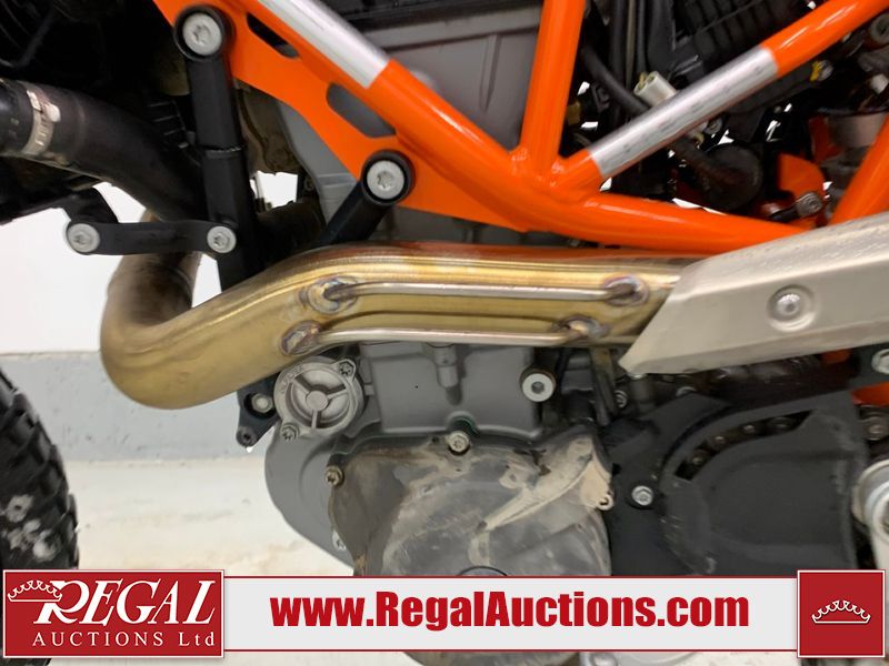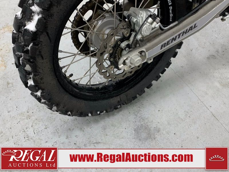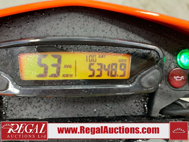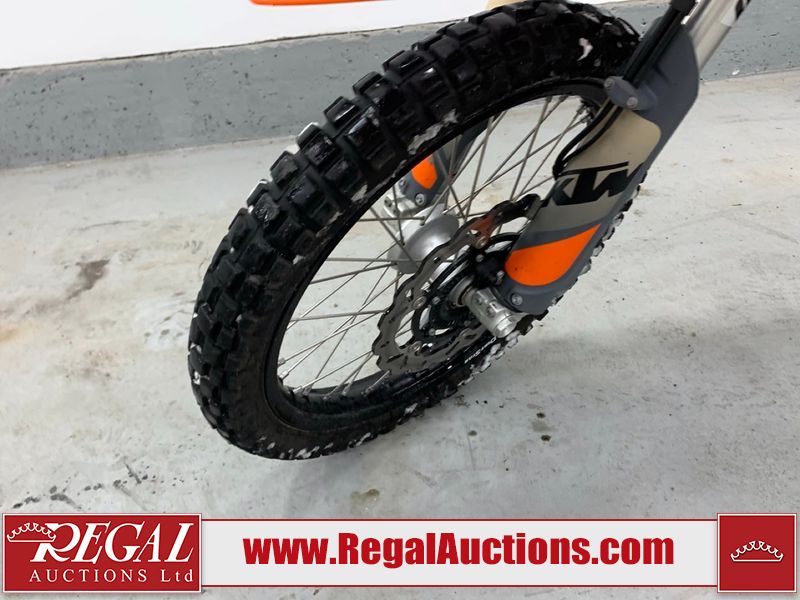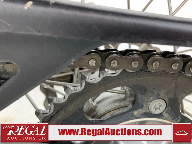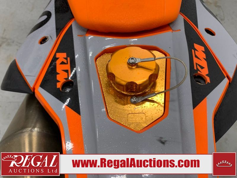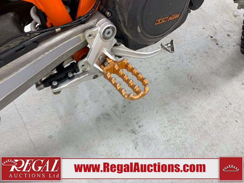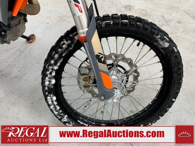 This dual sports style motorcycle is a 2023 KTM 690 Enduro R model. The odometer reads 5348 km. The front fender and rear side plastics have scratches. There are chips on the front fairing. An aftermarket gas cap and foot pegs have been installed. The engine starts and runs. The unit is powered by a 692 cc single cylinder liquid cooled four stroke engine and a six speed manual transmission with a chain final drive. The chain and sprockets are showing fair overall condition. Both tires are in good condition for use.