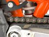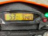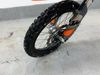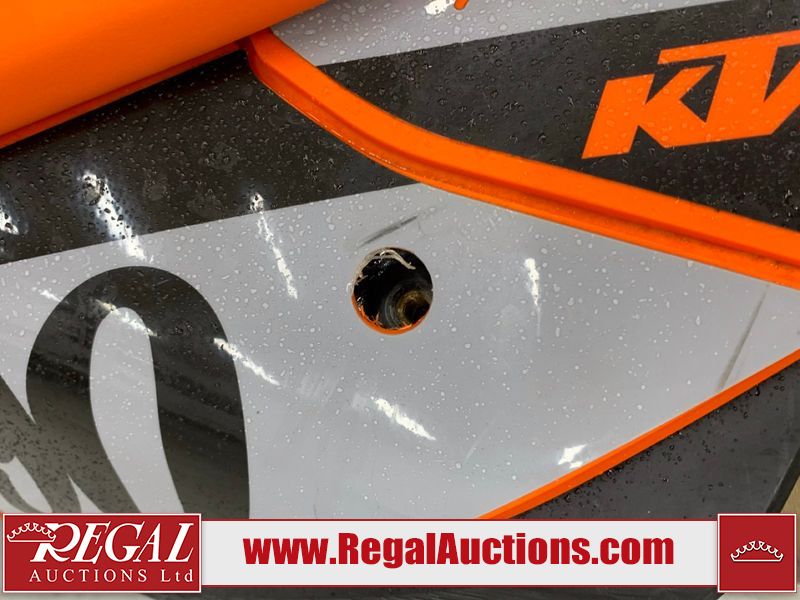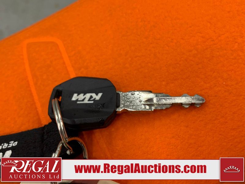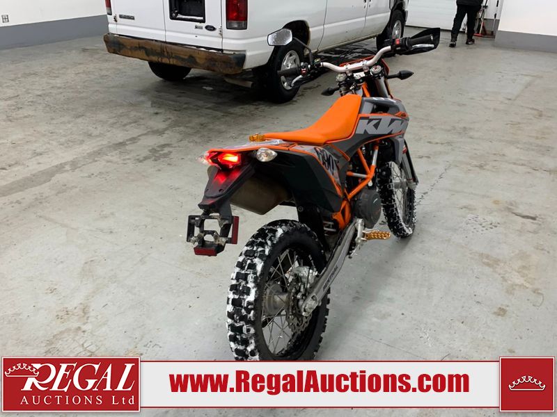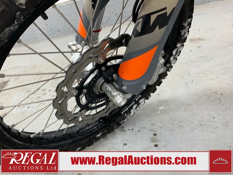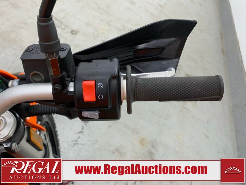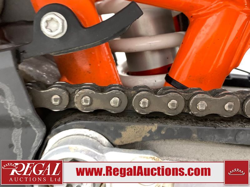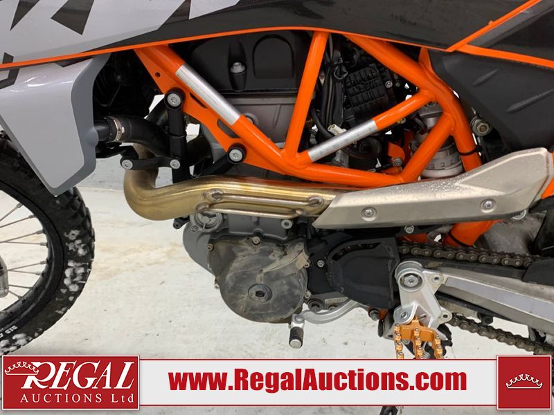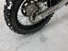 This dual sports style motorcycle is a 2023 KTM 690 Enduro R model. The odometer reads 5348 km. The front fender and rear side plastics have scratches. There are chips on the front fairing. An aftermarket gas cap and foot pegs have been installed. The engine starts and runs. The unit is powered by a 692 cc single cylinder liquid cooled four stroke engine and a six speed manual transmission with a chain final drive. The chain and sprockets are showing fair overall condition. Both tires are in good condition for use.
