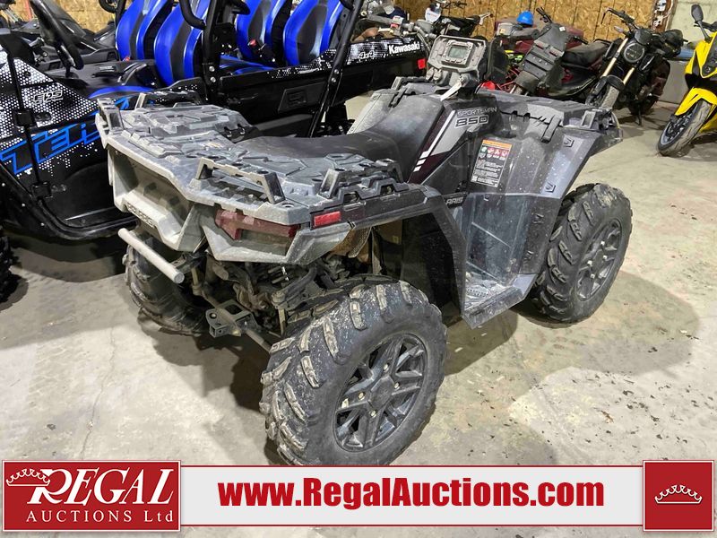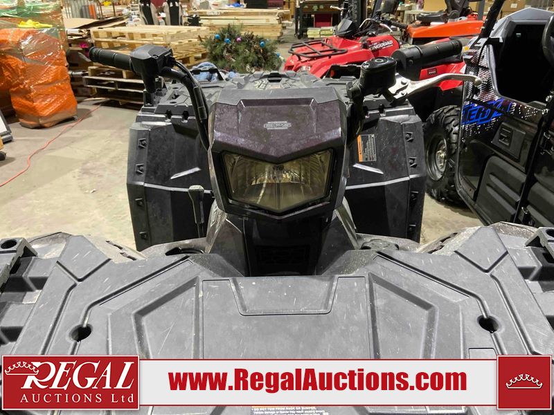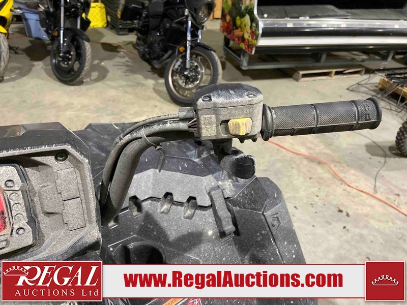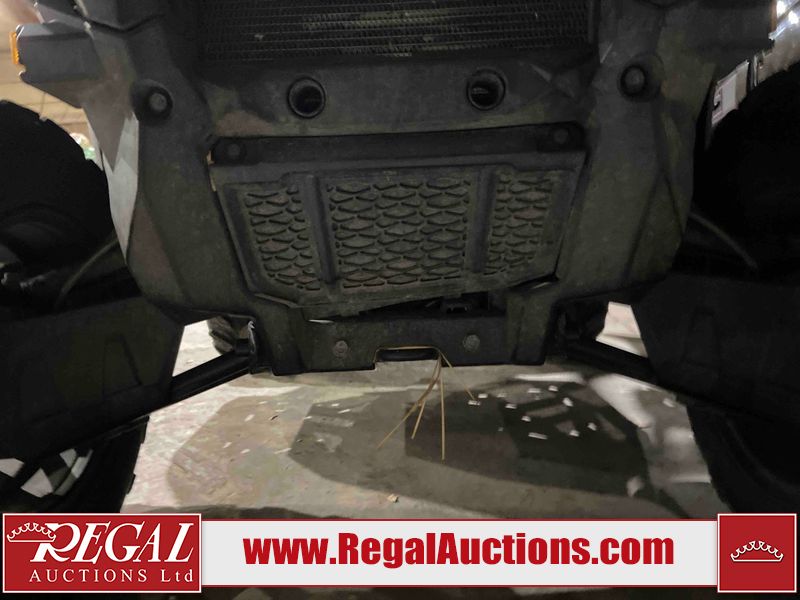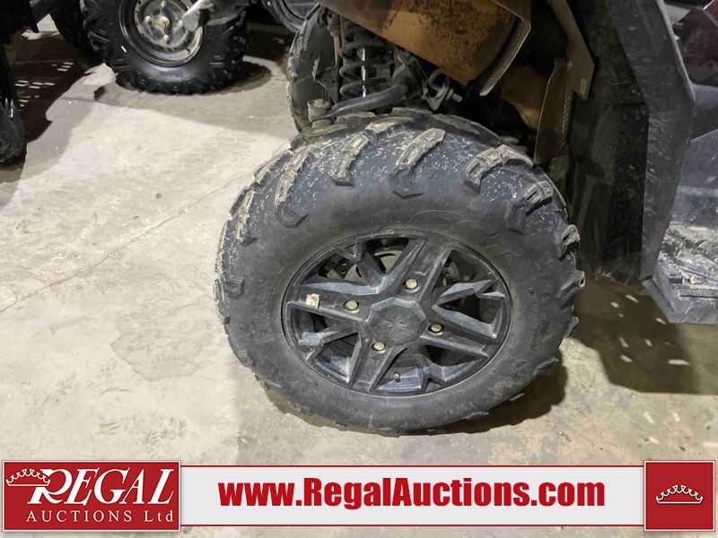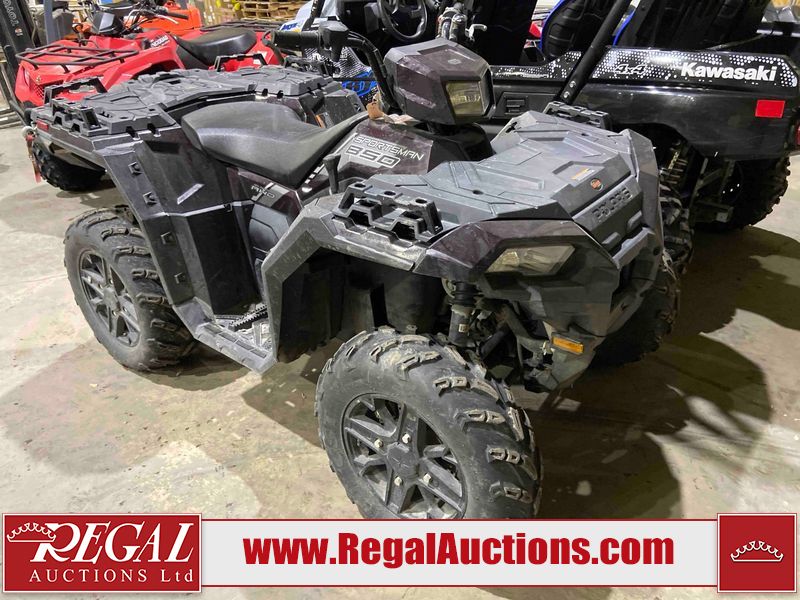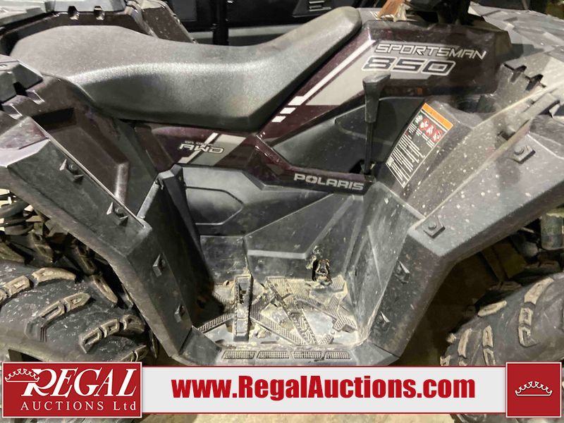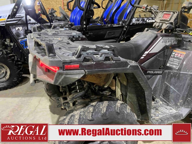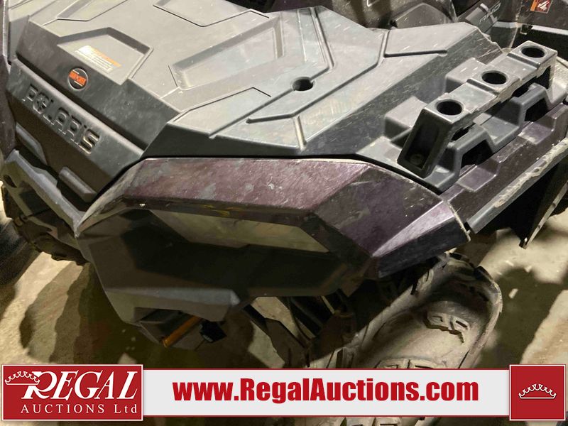 This ATV is a 2023 Polaris sportsman 850 EPS PREMIUM model. The odometer shows the odometer shows 1706 km and 71 engine hours. This unit is dirty, not all damages cannot be determined. All panels are showing minor chips, scratches, and scuffs. The rear crash bar has dents. This unit has power, but does not crank. When the power is activated, a sounding tick initiates and then stops. This unit is powered by a 850 cc two cylinder for a stroke, liquid cooled engine and a continuously variable transmission with a shaft final drive. The tires are mounted on alloy rims and appear to be in good enough condition to be for use. This unit is equipped with a 2WD/4WD selector.