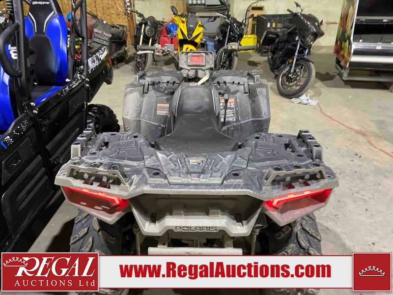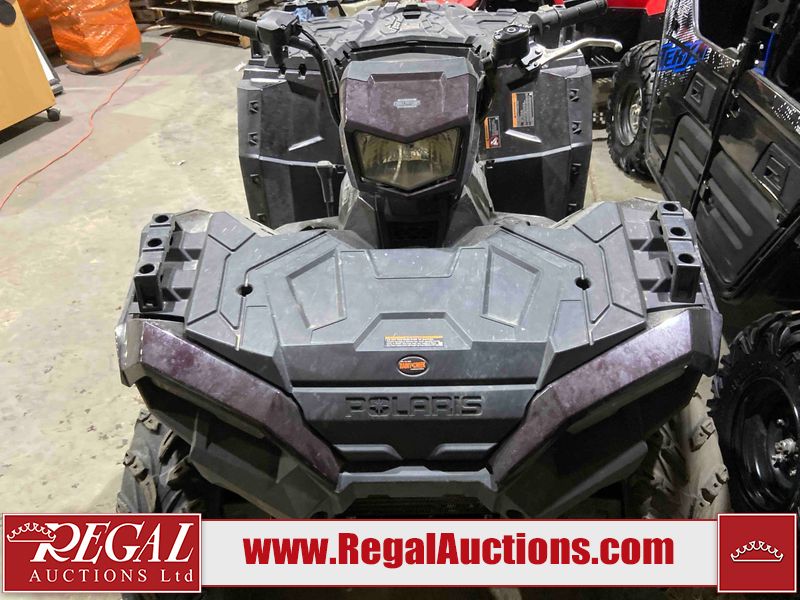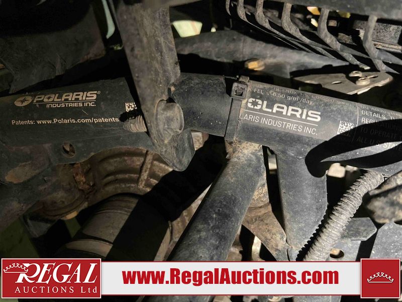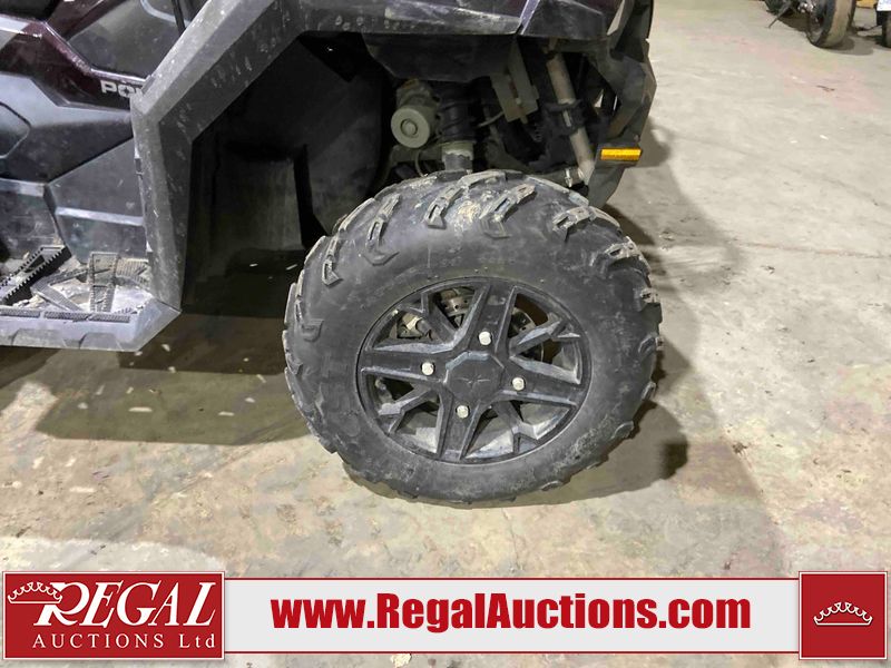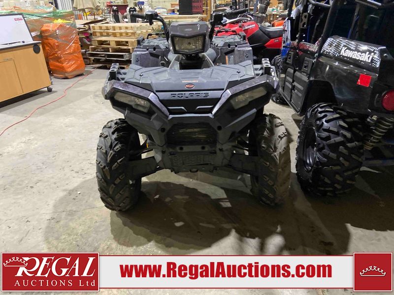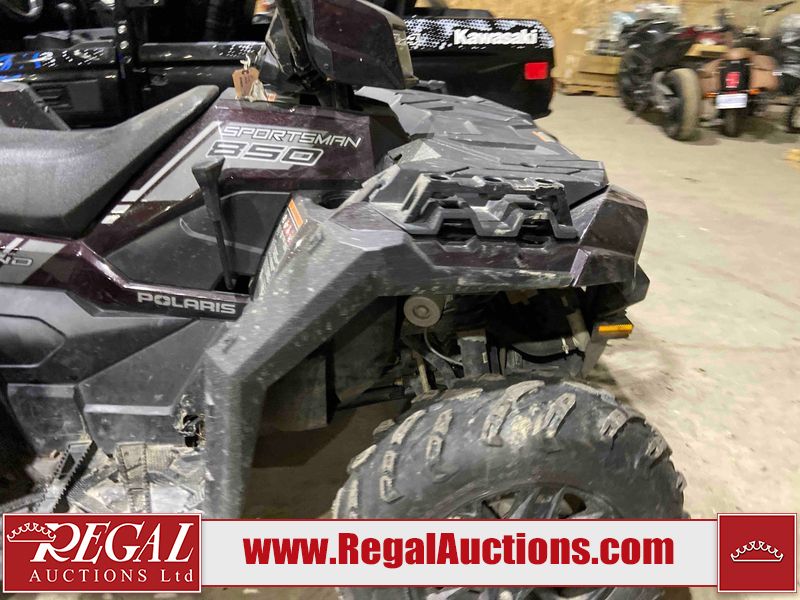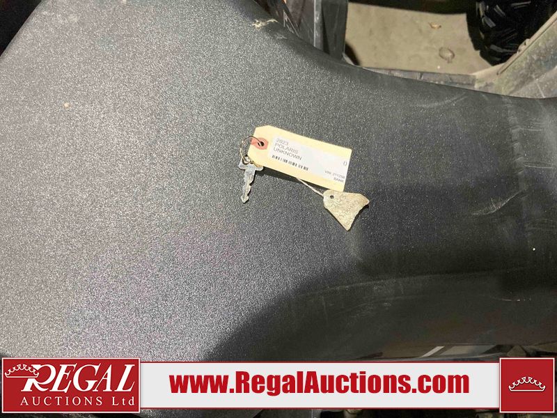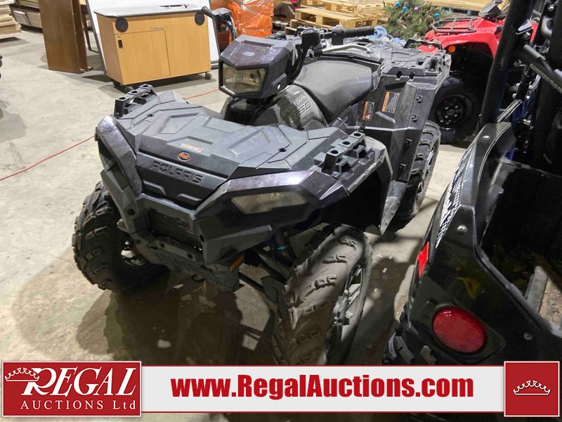 This ATV is a 2023 Polaris sportsman 850 EPS PREMIUM model. The odometer shows the odometer shows 1706 km and 71 engine hours. This unit is dirty, not all damages cannot be determined. All panels are showing minor chips, scratches, and scuffs. The rear crash bar has dents. This unit has power, but does not crank. When the power is activated, a sounding tick initiates and then stops. This unit is powered by a 850 cc two cylinder for a stroke, liquid cooled engine and a continuously variable transmission with a shaft final drive. The tires are mounted on alloy rims and appear to be in good enough condition to be for use. This unit is equipped with a 2WD/4WD selector.