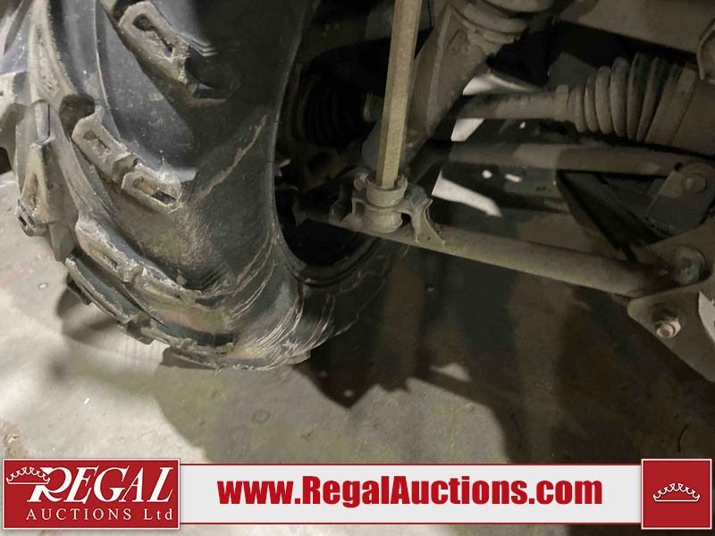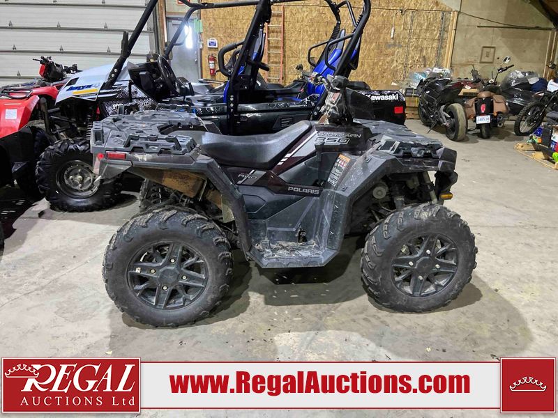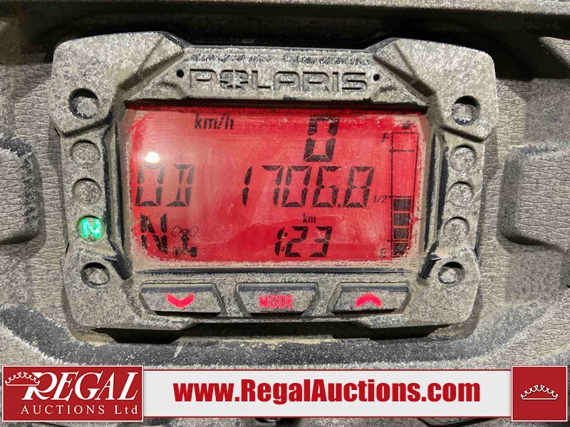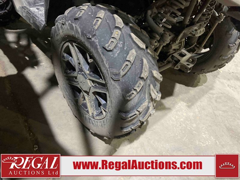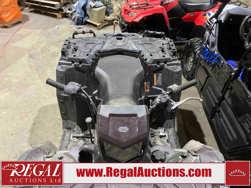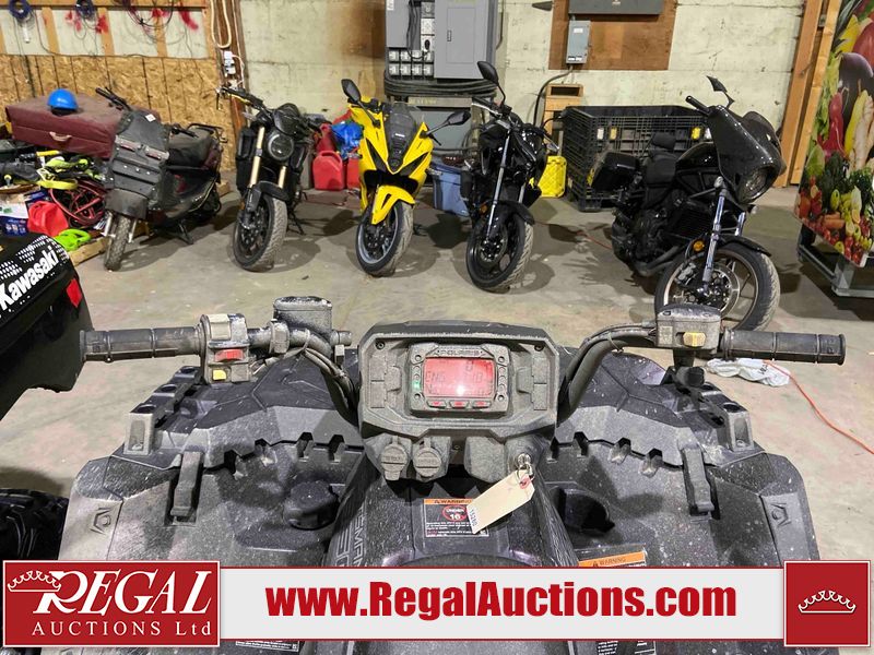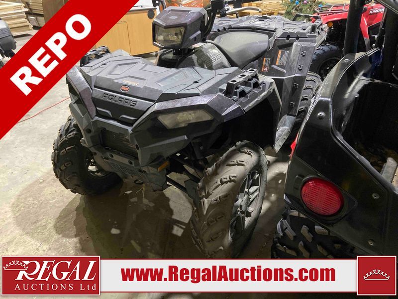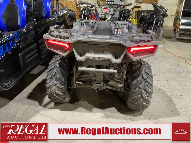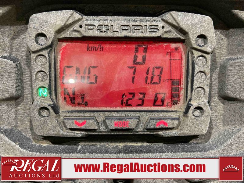 This ATV is a 2023 Polaris sportsman 850 EPS PREMIUM model. The odometer shows the odometer shows 1706 km and 71 engine hours. This unit is dirty, not all damages cannot be determined. All panels are showing minor chips, scratches, and scuffs. The rear crash bar has dents. This unit has power, but does not crank. When the power is activated, a sounding tick initiates and then stops. This unit is powered by a 850 cc two cylinder for a stroke, liquid cooled engine and a continuously variable transmission with a shaft final drive. The tires are mounted on alloy rims and appear to be in good enough condition to be for use. This unit is equipped with a 2WD/4WD selector.