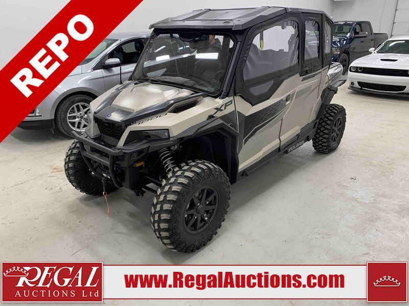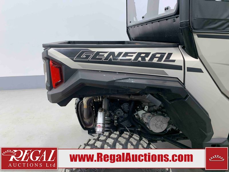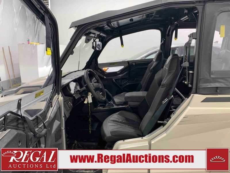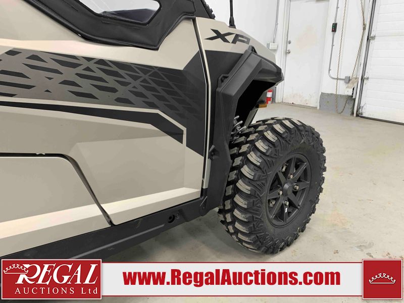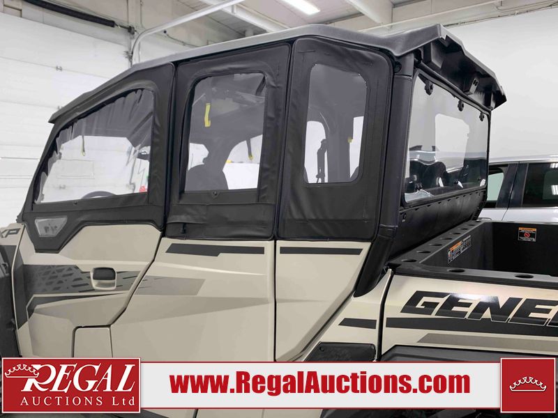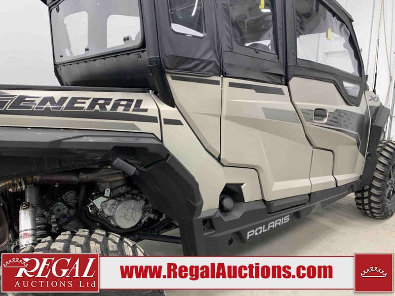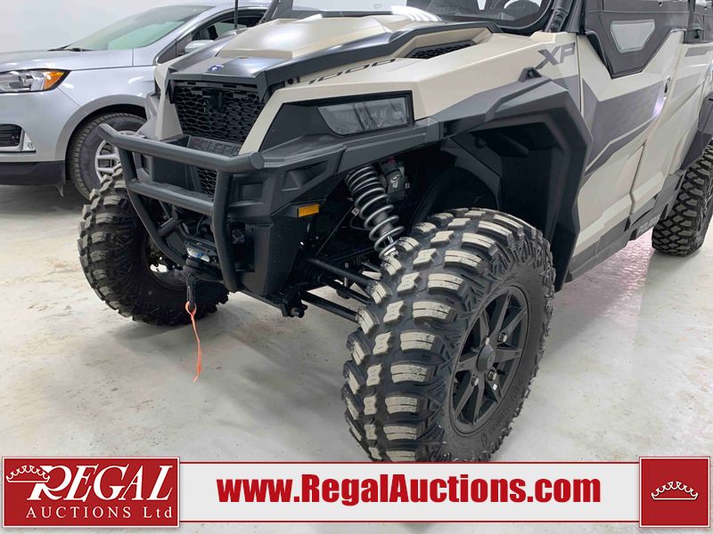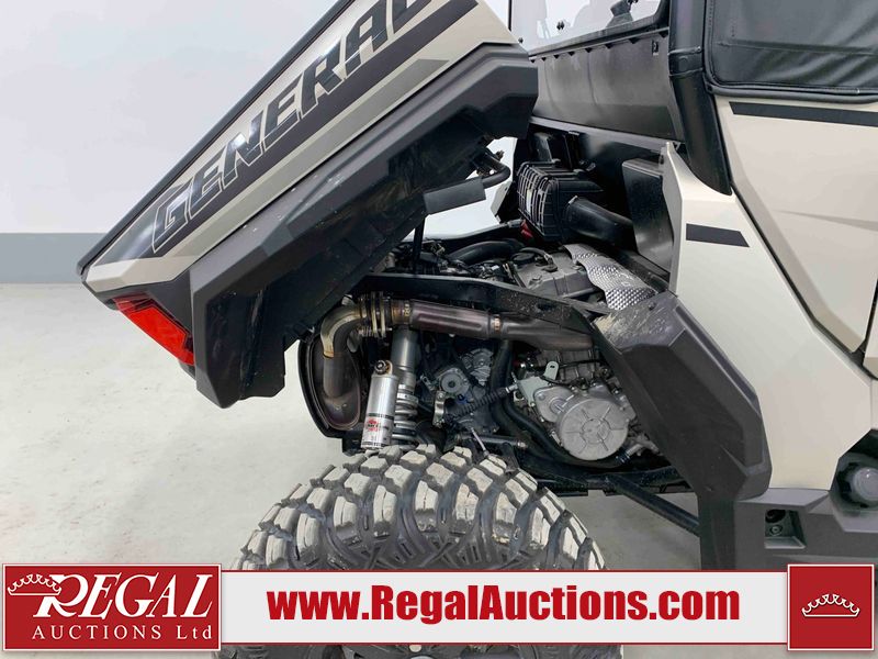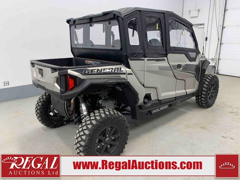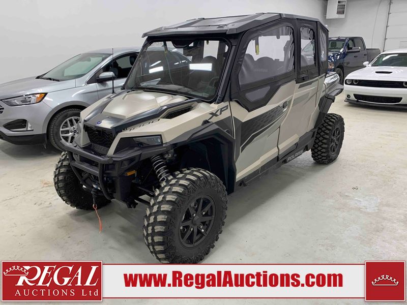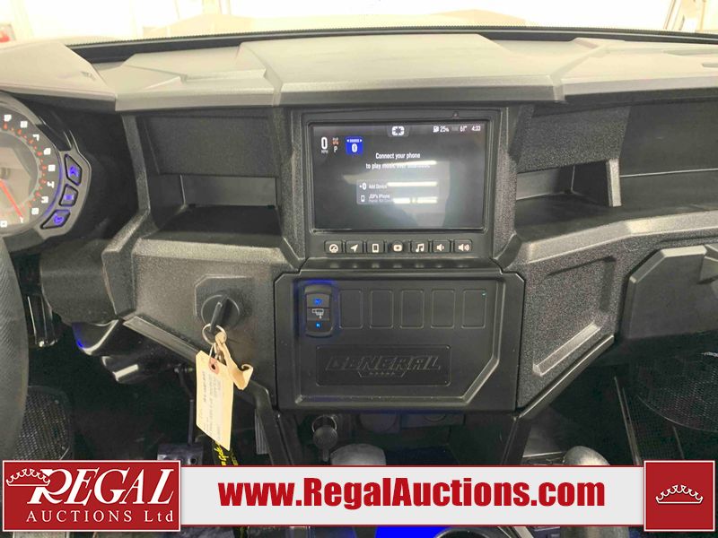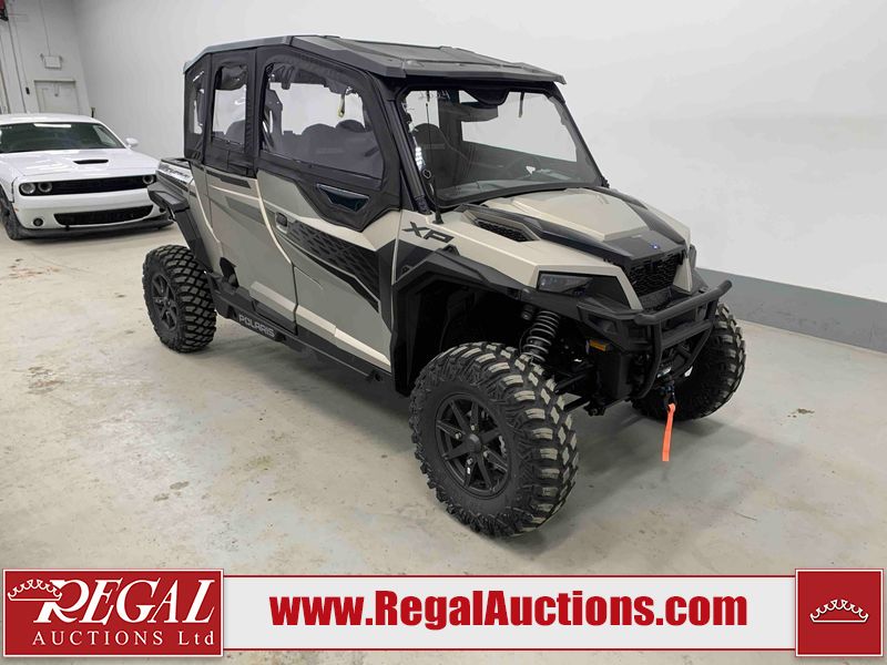 This ATV is a 2024 Polaris General XP 4 1000 Premium. The odometer reads 192 kms and 15 engine hours. The interior is clean. The exterior has minor chips and scratches. The plastic roof has some scuffs and scratches. This unit runs and start without a boost. This unit is powered by a 1000cc liquid cooled two cylinder four stroke engine and a continuously variable transmission with a shaft final drive. The tires have been mounted to alloy rims and appear to be in good enough condition for use. It is equipped with a 4x4 selector, media system, and a backup camera.