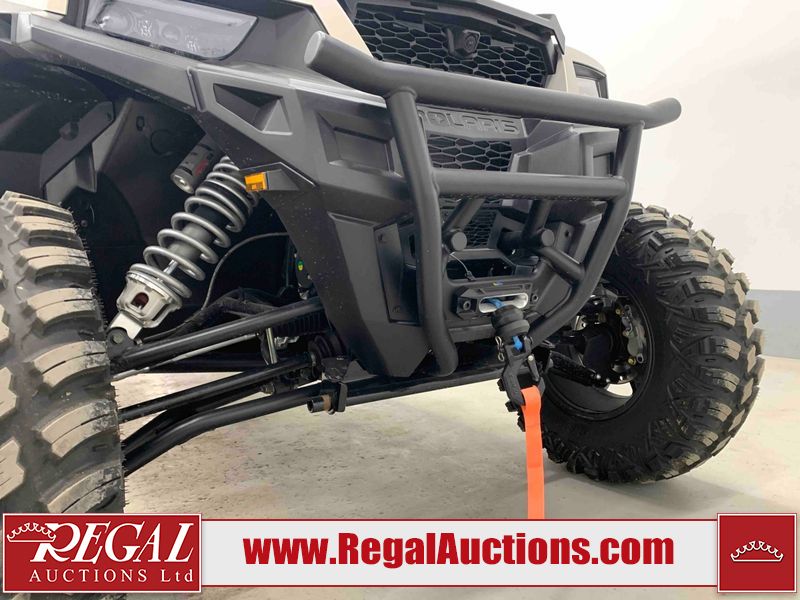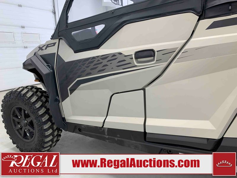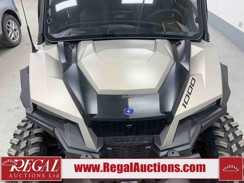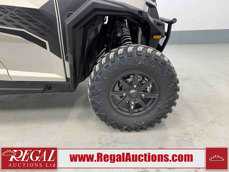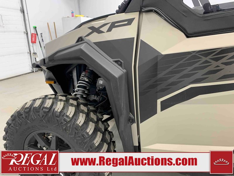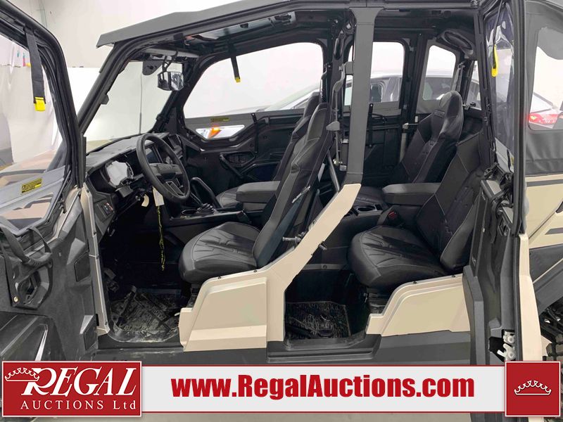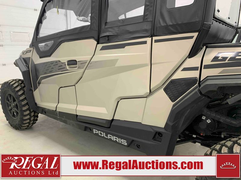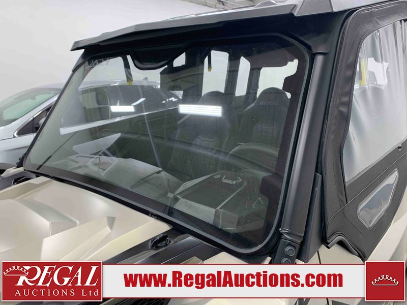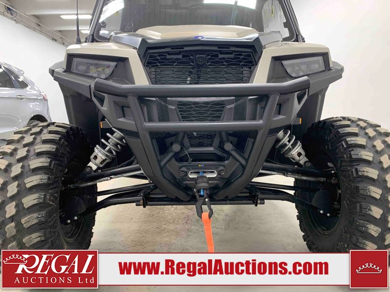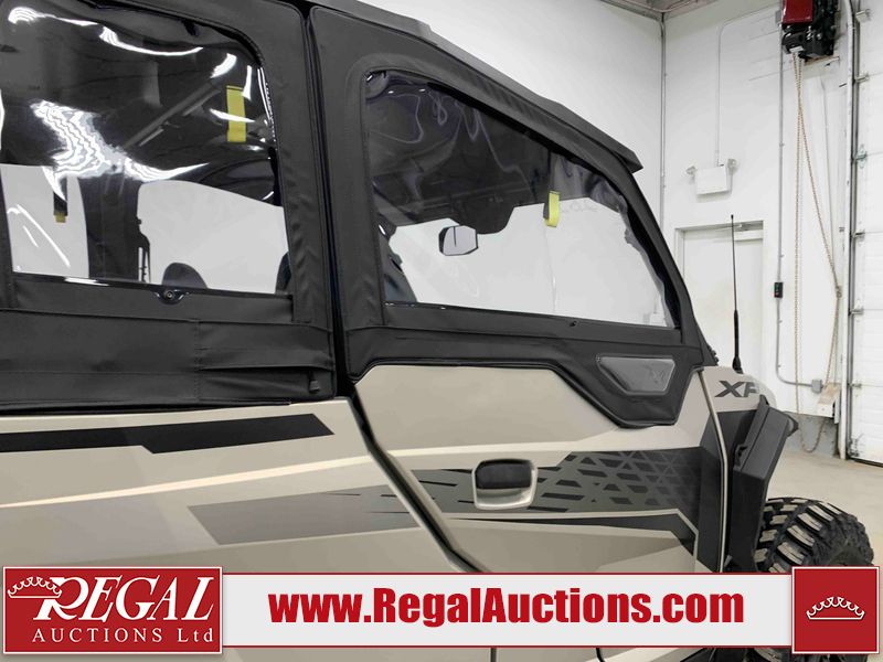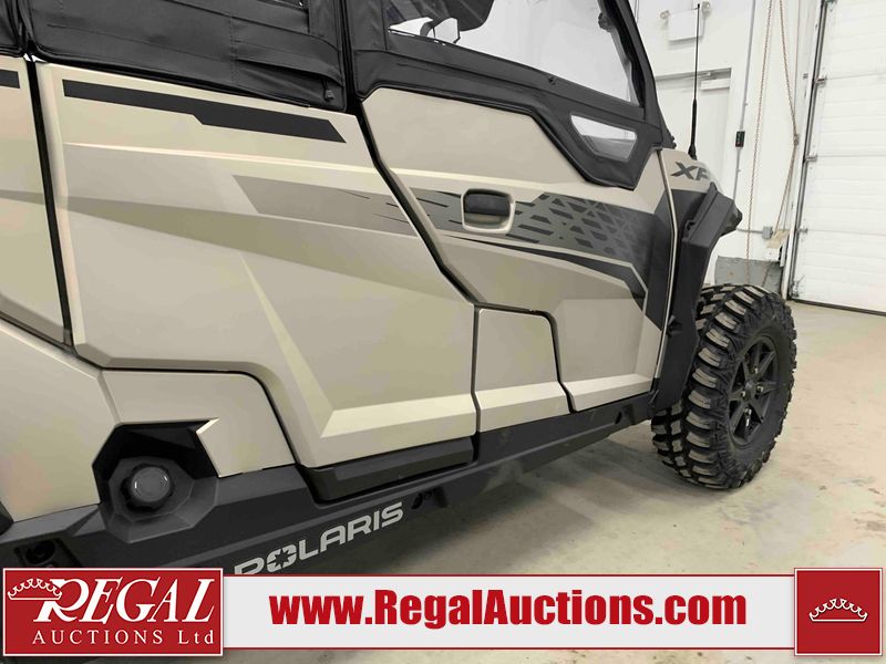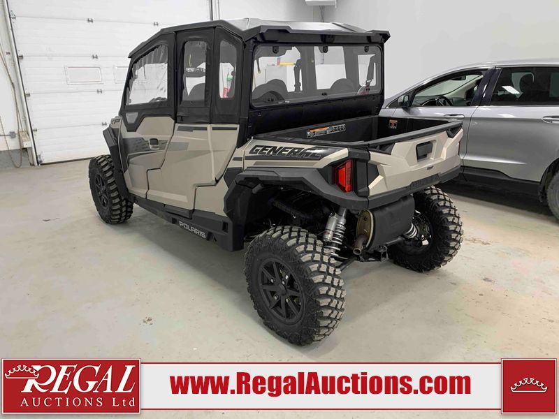 This ATV is a 2024 Polaris General XP 4 1000 Premium. The odometer reads 192 kms and 15 engine hours. The interior is clean. The exterior has minor chips and scratches. The plastic roof has some scuffs and scratches. This unit runs and start without a boost. This unit is powered by a 1000cc liquid cooled two cylinder four stroke engine and a continuously variable transmission with a shaft final drive. The tires have been mounted to alloy rims and appear to be in good enough condition for use. It is equipped with a 4x4 selector, media system, and a backup camera.