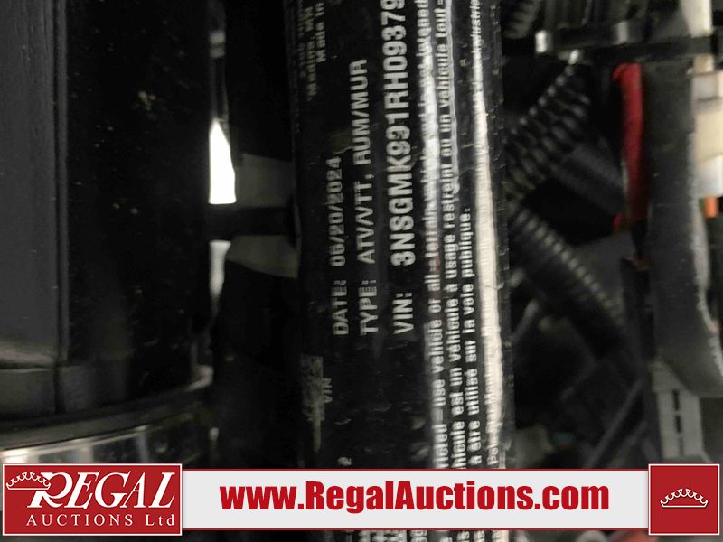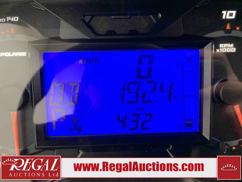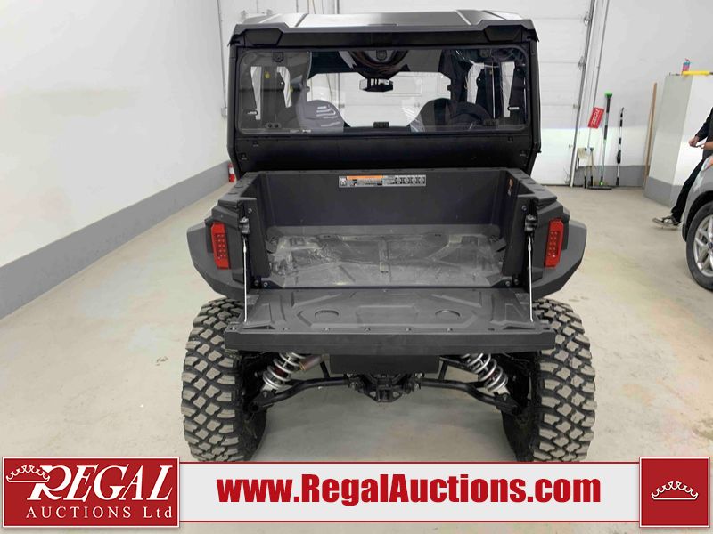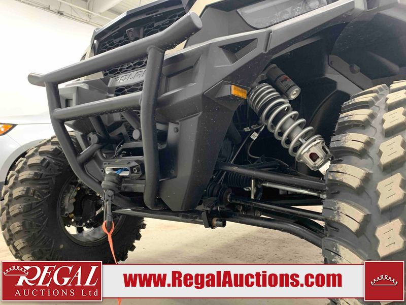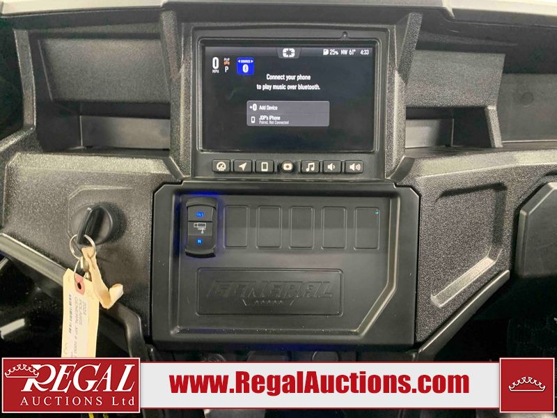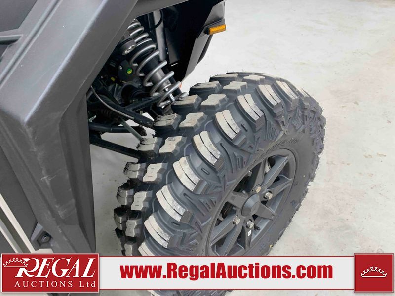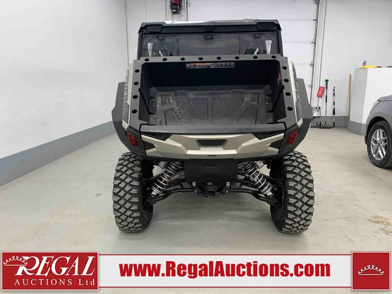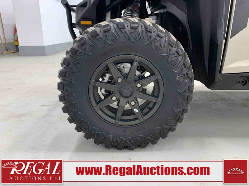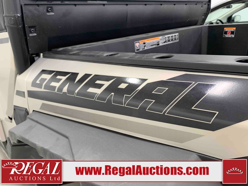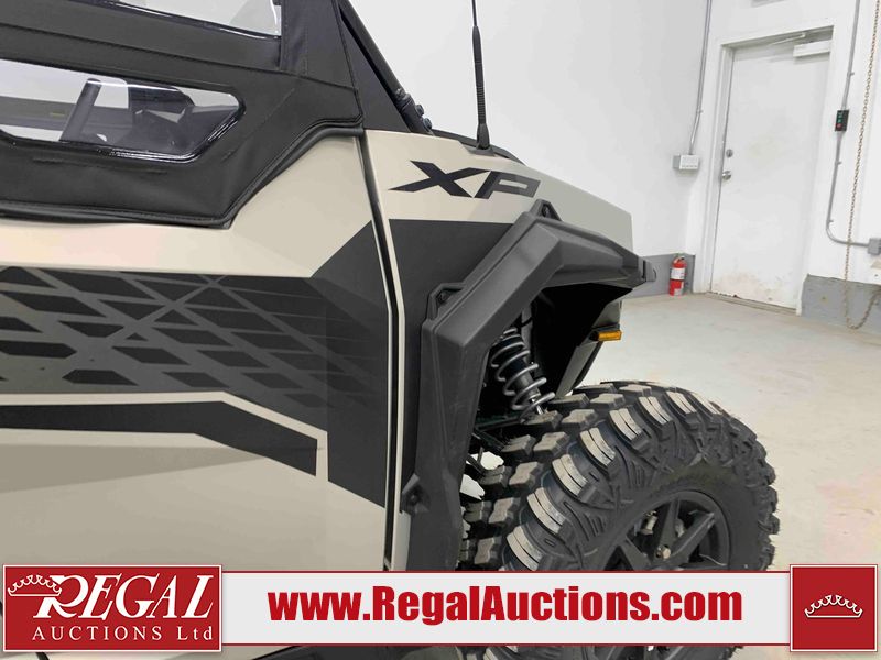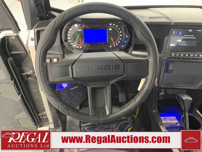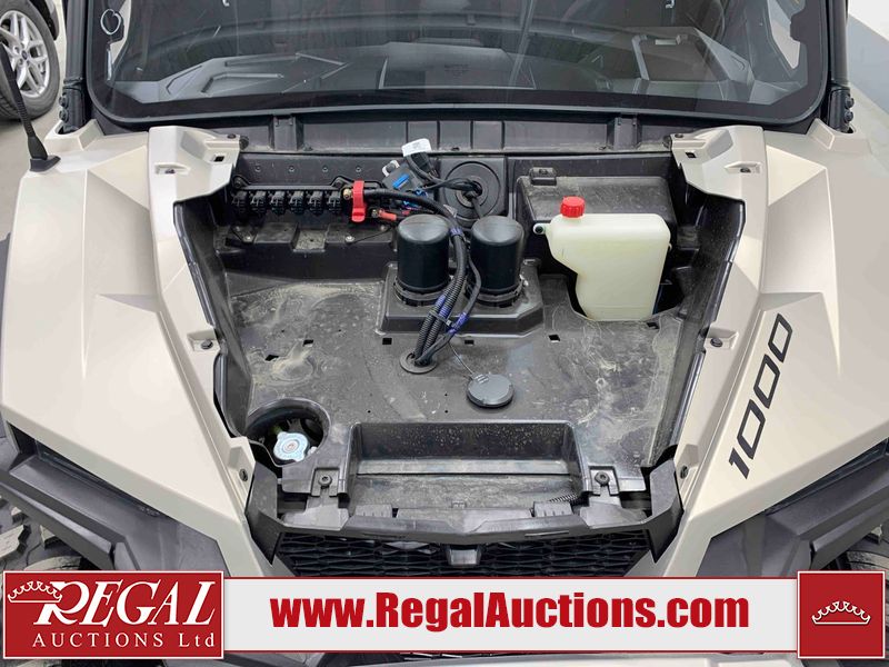 This ATV is a 2024 Polaris General XP 4 1000 Premium. The odometer reads 192 kms and 15 engine hours. The interior is clean. The exterior has minor chips and scratches. The plastic roof has some scuffs and scratches. This unit runs and start without a boost. This unit is powered by a 1000cc liquid cooled two cylinder four stroke engine and a continuously variable transmission with a shaft final drive. The tires have been mounted to alloy rims and appear to be in good enough condition for use. It is equipped with a 4x4 selector, media system, and a backup camera.