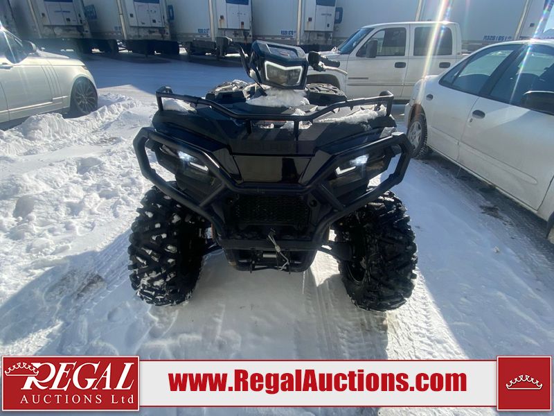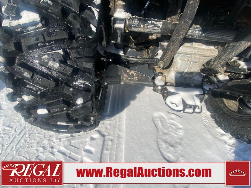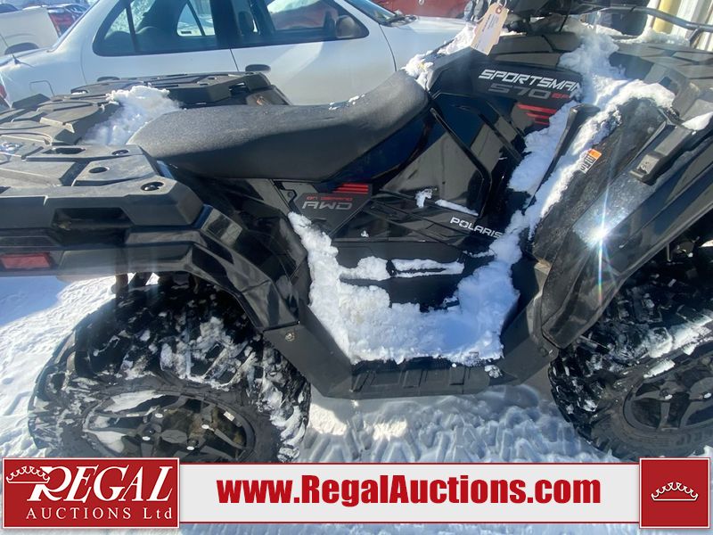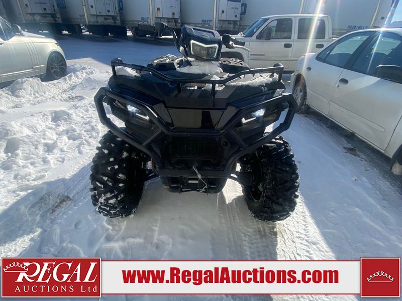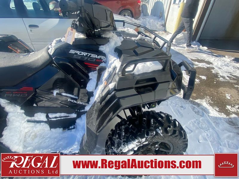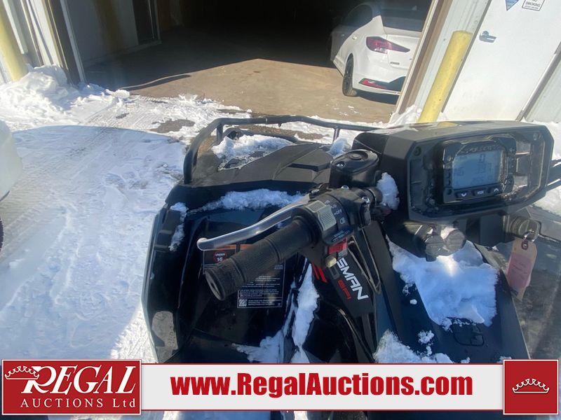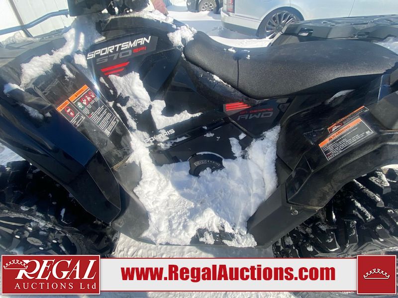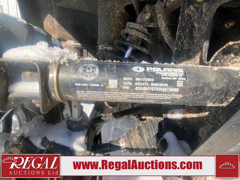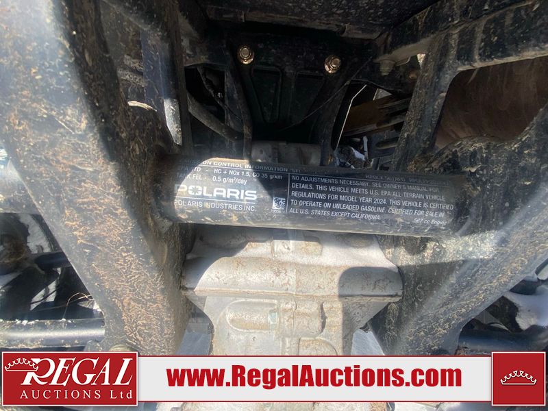 This ATV is a 2024 Polaris sportsman 570 model. The odometer shows 600 km and 39 engine hours. This unit is dirty, not all damages can be determined. Most panels are showing scratches and scuffs. The crash bar has peeling paint. The front suspension is broken. The steering is misaligned. This unit starts and runs without a boost. This unit is powered by 570cc V twin single cylinder two stroke liquid cooled engine and a continuously variable transmission with a shaft final drive. This unit is equipped with a front winch, and a 2WD/4WD selector.