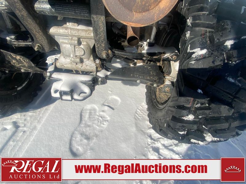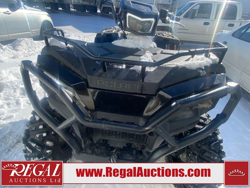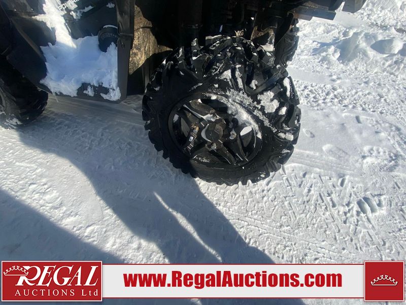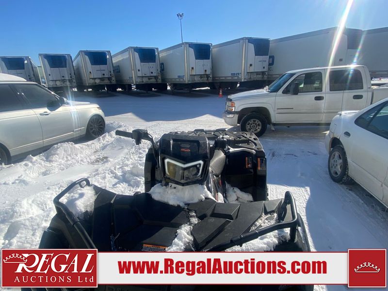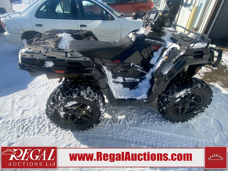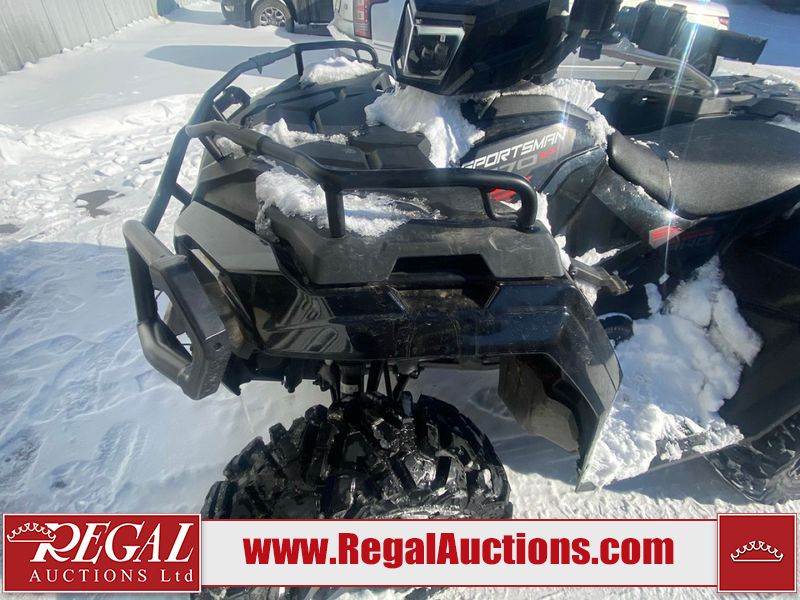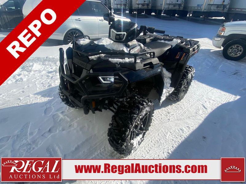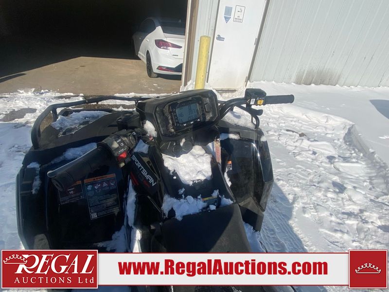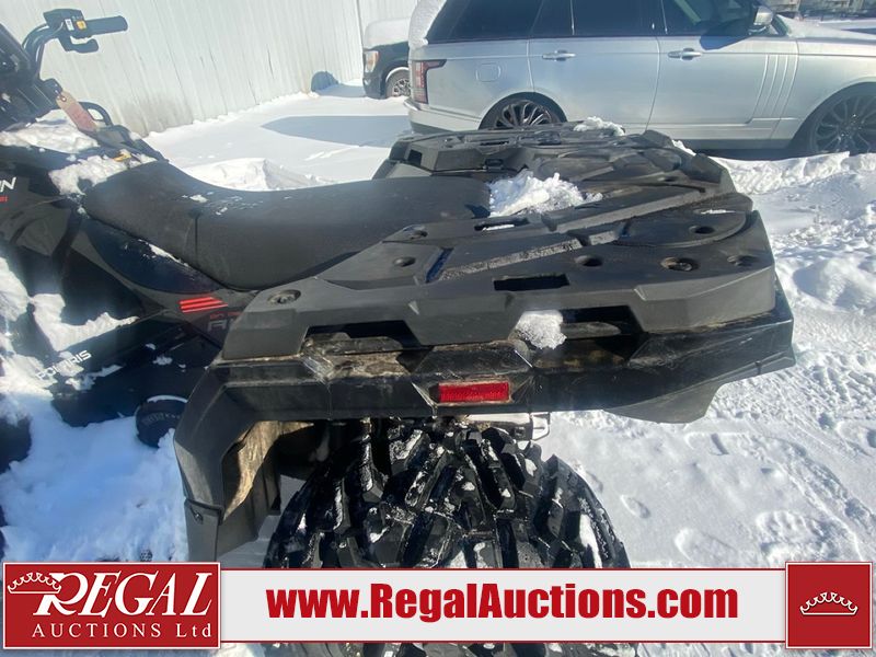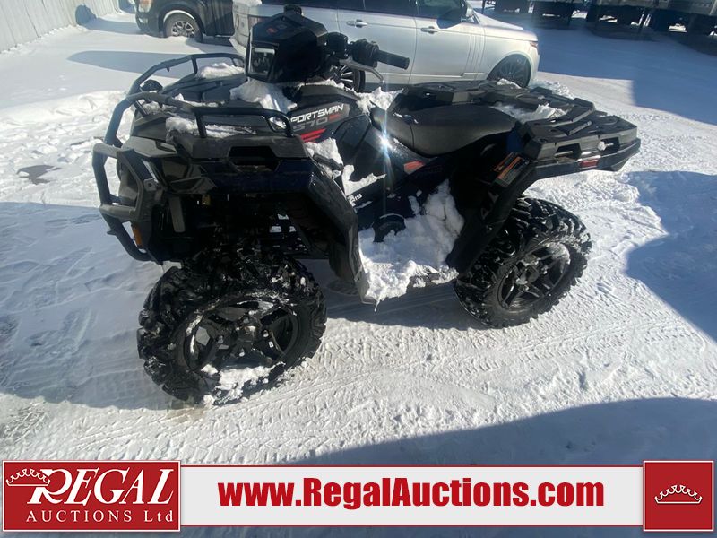 This ATV is a 2024 Polaris sportsman 570 model. The odometer shows 600 km and 39 engine hours. This unit is dirty, not all damages can be determined. Most panels are showing scratches and scuffs. The crash bar has peeling paint. The front suspension is broken. The steering is misaligned. This unit starts and runs without a boost. This unit is powered by 570cc V twin single cylinder two stroke liquid cooled engine and a continuously variable transmission with a shaft final drive. This unit is equipped with a front winch, and a 2WD/4WD selector.