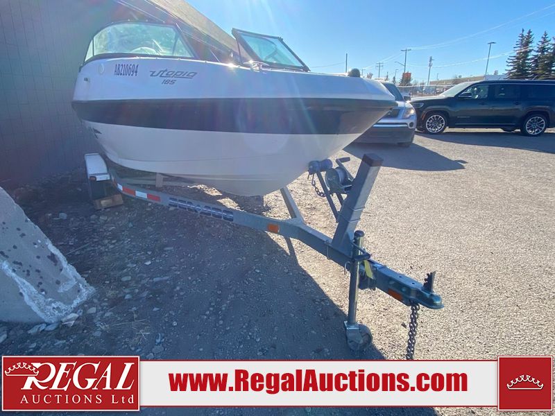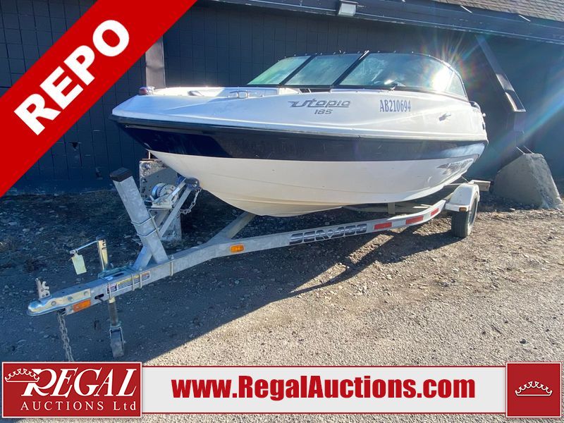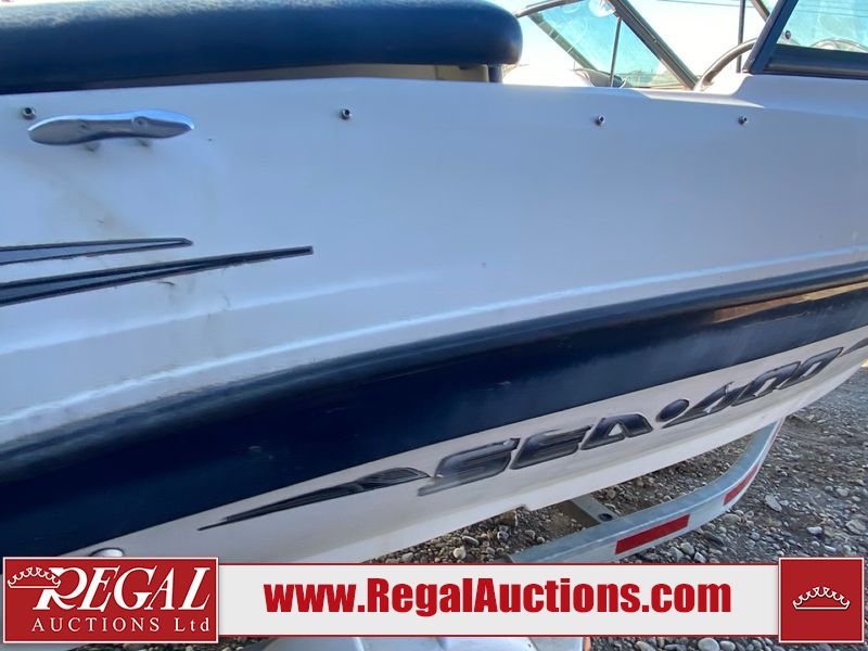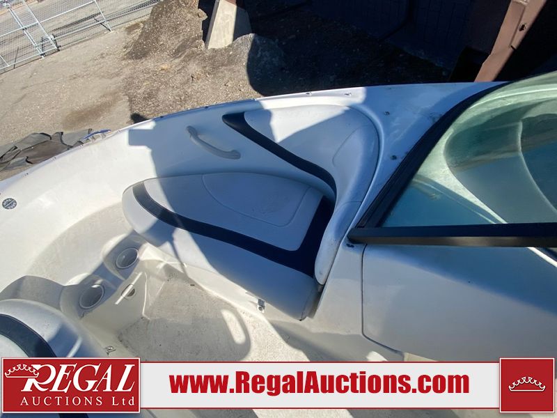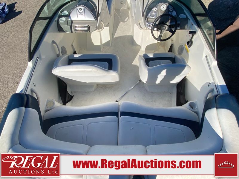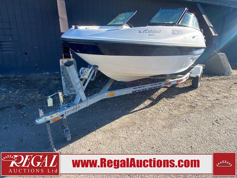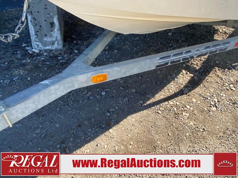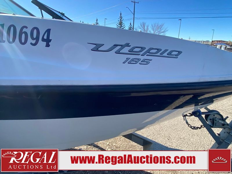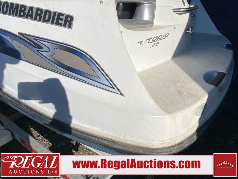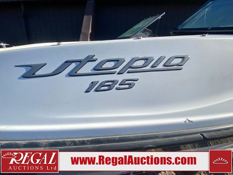 This watercraft is a 18.5' 2004 Sea-Doo Utopia 185 bowrider model with a fibreglass V- Type hull. This unit has a maximum capacity of 8 persons or 1,320 pounds. This unit is not equipped with an hour metre. The interior is in fair overall condition for its year. The seats are showing some signs of wear. The hull has scratches, scrapes, and some fading. The bow has several large chips. Some decals are peeling. The boat comes with a single axle trailer. The tires have been mounted to steel rims and appeared to be in good enough condition for use. The has not been tested. This unit is powered by a 2 stroke 200 HP 2.5L Mercury OptiMax 200 V6 engine with a mercury jet drive. The inlet and Jet unit appear to be in good enough condition for use. This unit is equipped with a stereo system and a Bimini top.