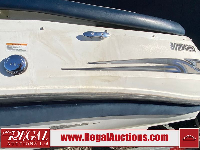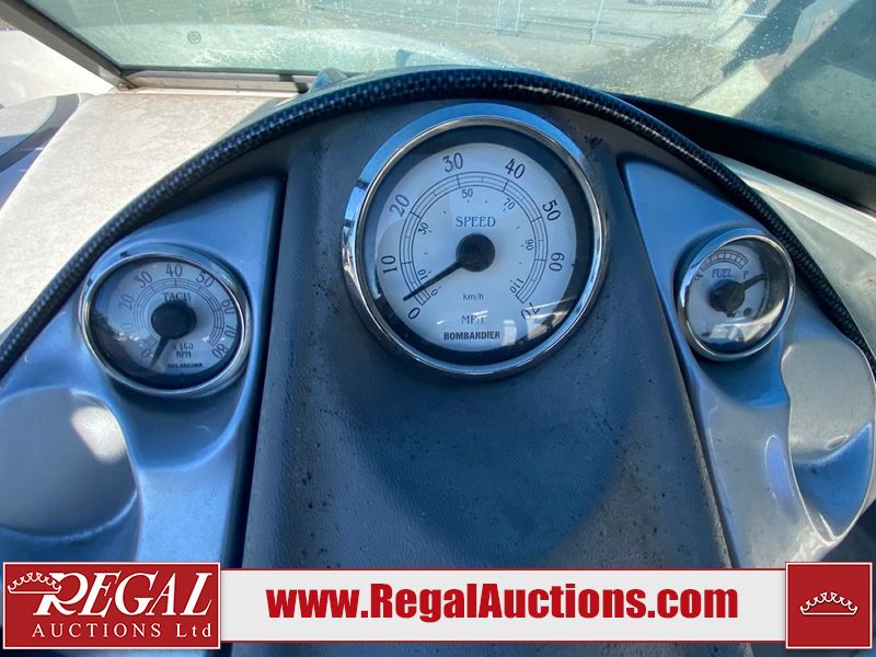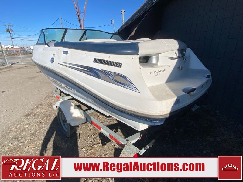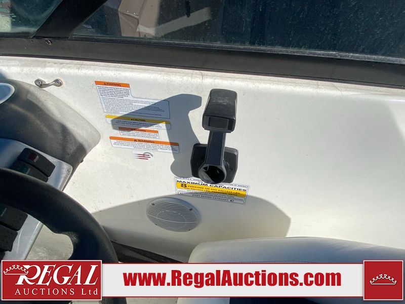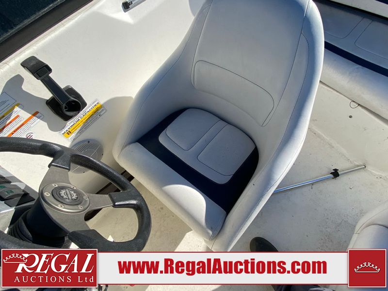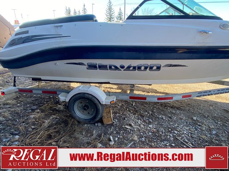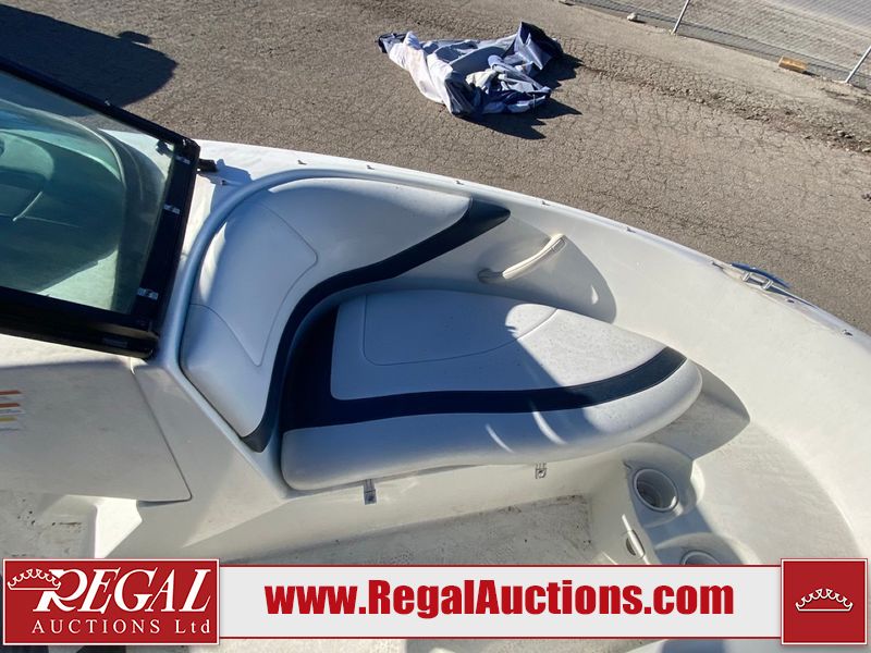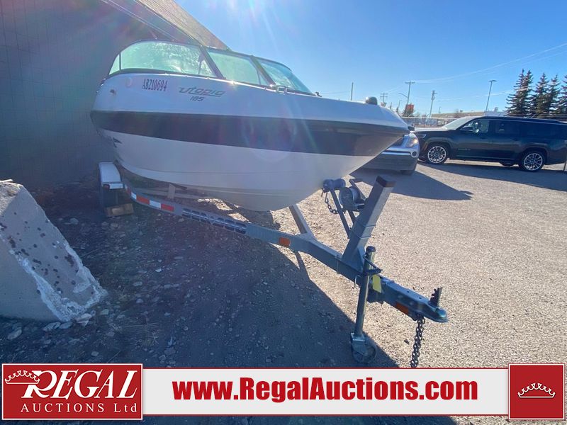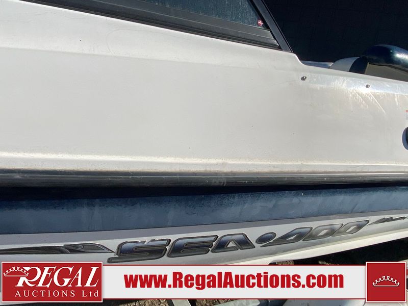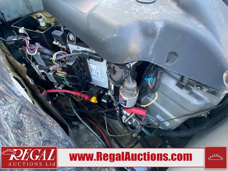 This watercraft is a 18.5' 2004 Sea-Doo Utopia 185 bowrider model with a fibreglass V- Type hull. This unit has a maximum capacity of 8 persons or 1,320 pounds. This unit is not equipped with an hour metre. The interior is in fair overall condition for its year. The seats are showing some signs of wear. The hull has scratches, scrapes, and some fading. The bow has several large chips. Some decals are peeling. The boat comes with a single axle trailer. The tires have been mounted to steel rims and appeared to be in good enough condition for use. The has not been tested. This unit is powered by a 2 stroke 200 HP 2.5L Mercury OptiMax 200 V6 engine with a mercury jet drive. The inlet and Jet unit appear to be in good enough condition for use. This unit is equipped with a stereo system and a Bimini top.